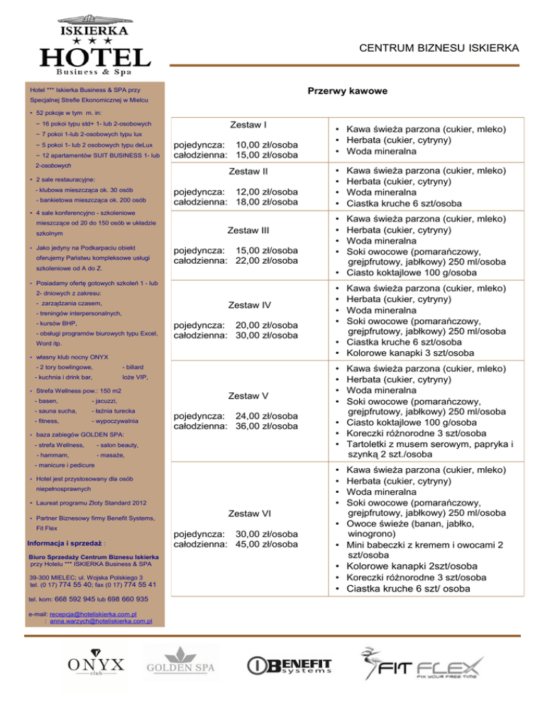 CENTRUM BIZNESU ISKIERKA Przerwy kawowe Hotel *** Iskierka Business & SPA przy Specjalnej Strefie Ekonomicznej w Mielcu • 52 pokoje w tym m. in: − 16 pokoi typu std+ 1- lub 2-osobowych Zestaw I − 7 pokoi 1-lub 2-osobowych typu lux − 5 pokoi 1- lub 2 osobowych typu deLux − 12 apartamentów SUIT BUSINESS 1- lub 2-osobowych pojedyncza: 10,00 zł/osoba całodzienna: 15,00 zł/osoba Zestaw II • 2 sale restauracyjne: - klubowa mieszcząca ok. 30 osób - bankietowa mieszcząca ok. 200 osób pojedyncza: 12,00 zł/osoba całodzienna: 18,00 zł/osoba • 4 sale konferencyjno - szkoleniowe mieszczące od 20 do 150 osób w układzie szkolnym • Jako jedyny na Podkarpaciu obiekt oferujemy Państwu kompleksowe usługi szkoleniowe od A do Z. Zestaw III pojedyncza: 15,00 zł/osoba całodzienna: 22,00 zł/osoba • Posiadamy ofertę gotowych szkoleń 1 - lub 2- dniowych z zakresu: - zarządzania czasem, Zestaw IV - treningów interpersonalnych, - kursów BHP, - obsługi programów biurowych typu Excel, Word itp. pojedyncza: 20,00 zł/osoba całodzienna: 30,00 zł/osoba • własny klub nocny ONYX - 2 tory bowlingowe, - billard - kuchnia i drink bar, loże VIP, • Strefa Wellness pow.: 150 m2 - basen, - jacuzzi, - sauna sucha, - łaźnia turecka - fitness, - wypoczywalnia Zestaw V pojedyncza: 24,00 zł/osoba całodzienna: 36,00 zł/osoba • baza zabiegów GOLDEN SPA: - strefa Wellness, - salon beauty, - hammam, - masaże, - manicure i pedicure niepełnosprawnych • Laureat programu Złoty Standard 2012 Fit Flex Informacja i sprzedaż : Biuro Sprzedaży Centrum Biznesu Iskierka przy Hotelu *** ISKIERKA Business & SPA 39-300 MIELEC; ul. Wojska Polskiego 3 tel. (0 17) 774 55 40; fax (0 17) 774 55 41 tel. kom: 668 592 945 lub 698 660 935 e-mail: [email protected] : [email protected] • • • • Kawa świeża parzona (cukier, mleko) Herbata (cukier, cytryny) Woda mineralna Soki owocowe (pomarańczowy, grejpfrutowy, jabłkowy) 250 ml/osoba • Ciasto koktajlowe 100 g/osoba Kawa świeża parzona (cukier, mleko) Herbata (cukier, cytryny) Woda mineralna Soki owocowe (pomarańczowy, grejpfrutowy, jabłkowy) 250 ml/osoba • Ciastka kruche 6 szt/osoba • Kolorowe kanapki 3 szt/osoba • • • • Kawa świeża parzona (cukier, mleko) Herbata (cukier, cytryny) Woda mineralna Soki owocowe (pomarańczowy, grejpfrutowy, jabłkowy) 250 ml/osoba • Ciasto koktajlowe 100 g/osoba • Koreczki różnorodne 3 szt/osoba • Tartoletki z musem serowym, papryka i szynką 2 szt./osoba • • • • Zestaw VI • pojedyncza: 30,00 zł/osoba całodzienna: 45,00 zł/osoba Kawa świeża parzona (cukier, mleko) Herbata (cukier, cytryny) Woda mineralna Ciastka kruche 6 szt/osoba • • • • • • • • • Hotel jest przystosowany dla osób • Partner Biznesowy firmy Benefit Systems, • Kawa świeża parzona (cukier, mleko) • Herbata (cukier, cytryny) • Woda mineralna • • • • Kawa świeża parzona (cukier, mleko) Herbata (cukier, cytryny) Woda mineralna Soki owocowe (pomarańczowy, grejpfrutowy, jabłkowy) 250 ml/osoba Owoce świeże (banan, jabłko, winogrono) Mini babeczki z kremem i owocami 2 szt/osoba Kolorowe kanapki 2szt/osoba Koreczki różnorodne 3 szt/osoba Ciastka kruche 6 szt/ osoba