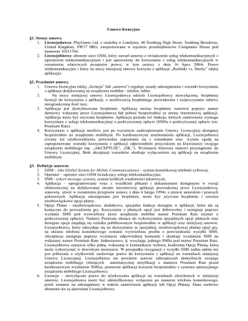 Umowa licencyjna §1. Strony umowy. 1. Licencjodawca: PlayGame Ltd. z siedzibą w Londynie, 40 Toothing High Street, Toothing Broadway, United Kingdom, SW17 0RG, zarejestrowana w rejestrze przedsiębiorców Companies House pod numerem 10211766. 2. Licencjobiorca: abonent sieci GSM, który zawarł umowę o świadczenie usług telekomunikacyjnych z operatorem telekomunikacyjnym i jest uprawniony do korzystania z usług telekomunikacyjnych w rozumieniu właściwych przepisów prawa, w tym ustawy z dnia 16 lipca 2004r. Prawo telekomunikacyjne i który na mocy niniejszej umowy korzysta z aplikacji „Roślinki vs. Duchy” (dalej aplikacja). §2. Przedmiot umowy. 1. Umowa licencyjna (dalej „licencja” lub „umowa”) reguluje zasady udostępniania i warunki korzystania z aplikacji dedykowanej na urządzenia mobilne - telefon, tablet. 2. Na mocy niniejszej umowy Licencjodawca udziela Licencjobiorcy niewyłącznej, bezpłatnej licencji do korzystania z aplikacji, z możliwością bezpłatnego prowadzenia i rozpoczynania zabawy nieograniczoną ilość razy. 3. Aplikacja jest dystrybuowana bezpłatnie. Aplikację można bezpłatnie zamówić poprzez numer darmowy wskazany przez Licencjodawcę lub pobrać bezpośrednio ze strony internetowej aplikacji. Aplikacja może być używana bezpłatnie. Aplikacja posiada też funkcje, których zamówienie wymaga korzystania z usługi telekomunikacyjnej o podwyższonej opłacie (SMSa o podwyższonej opłacie tzw. Premium Rate). 4. Korzystanie z aplikacji możliwe jest po wyraźnym zaakceptowaniu Umowy Licencyjnej dostępnej bezpośrednio na urządzeniu mobilnym. Po każdorazowym uruchomieniu aplikacji, Licencjobiorca (zwany też użytkownikiem), potwierdza zapoznanie się z warunkami oraz wyraża zgodę na zaproponowane warunki korzystania z aplikacji odpowiednim przyciskiem na klawiaturze swojego urządzenia mobilnego (np. „AKCEPTUJĘ”, „OK.”). Wciśnięcie klawisza stanowi przystąpienie do Umowy Licencyjnej. Brak akceptacji warunków skutkuje wyłączeniem się aplikacji na urządzeniu mobilnym. §3. Definicje umowne 1. GSM – (the Global System for Mobile Communications) – system komórkowej telefonii cyfrowej; 2. Operator – operator sieci GSM świadczący usługi telekomunikacyjne; 3. SMS - (short message system), system krótkich wiadomości tekstowych; 4. Aplikacja – oprogramowanie wraz z wszelkimi plikami i dokumentami dostępnymi w wersji elektronicznej na dedykowanej stronie internetowej aplikacji prowadzonej przez Licencjodawcę, stanowią utwór w rozumieniu przepisów ustawy z dnia 4 lutego 1994r. o prawie autorskim i prawach pokrewnych. Aplikacja udostępniana jest bezpłatnie, może być używana bezpłatnie i zawiera nieobowiązkowe opcje płatne. 5. Opcje Płatne - nieobowiązkowe, dodatkowe, specjalne funkcje dostępne w aplikacji, które nie są konieczne do prowadzenia gry. Korzystanie z płatnych opcji jest dobrowolne i następuje poprzez wysłanie SMS pod wyświetlony przez urządzenie mobilne numer Premium Rate (numer o podwyższonej opłacie). Numery Premium służące do wykorzystania specjalnych opcji płatnych oraz dostępne opcje znajdują się cenniku publikowanym bezpośrednio w aplikacji oraz niniejszej umowie. Licencjobiorcy, który zdecyduje się na skorzystanie ze specjalnej, nieobowiązkowej płatnej opcji gry, na ekranie telefonu komórkowego zostanie wyświetlona prośba o potwierdzenie wysyłki SMS. Akceptacja następuje poprzez wciśnięcie odpowiedniej komendy i skutkuje wysłaniem SMS na wskazany numer Premium Rate. Jednorazowo, tj. wysyłając jednego SMSa pod numer Premium Rate, Licencjobiorca zamawia tylko jedną, wskazaną w komunikacie wyboru, konkretną Opcję Płatną, którą może wykorzystać w dowolnym momencie. W przypadku rezygnacji z wysyłki SMS żadna opłata nie jest pobierana a użytkownik zachowuje prawo do korzystania z aplikacji na warunkach niniejszej Umowy Licencyjnej. Licencjobiorca nie powinien usuwać zabezpieczeń domyślnych swojego urządzenia mobilnego (służących automatycznej notyfikacji o numerze Premium Rate przed każdorazowym wysłaniem SMSa), ponieważ aplikacja korzysta bezpośrednio z systemu operacyjnego urządzenia mobilnego Licencjobiorcy. 6. Licencja – niewyłączne prawo do użytkowania aplikacji na warunkach określonych w niniejszej umowie. Licencjobiorca może być identyfikowany wyłącznie po numerze telefonu komórkowego, jeżeli zostanie on udostępniony w trakcie zamówienia aplikacji lub Opcji Płatnej. Dane osobowe abonenta nie są ujawniane Licencjobiorcy. 7. Premium Rate (numery o podwyższonej opłacie) – usługa telekomunikacyjna o podwyższonej opłacie, o charakterze jednorazowym, o której mowa w art. 64 ustawy z dnia 16 lipca 2004 r. Prawo telekomunikacyjne (Dz.U. Nr 171, poz. 1800; dalej ustawa telekomunikacyjna), o natychmiastowym świadczeniu, realizowana na żądanie abonenta, zgodnie z art. 64 ust. 8 w zw. z art. 56 ust. 2 prawa telekomunikacyjnego. Wysłanie SMSa z numeru telefonu abonenta stanowi żądanie natychmiastowej realizacji usługi i skutkuje obciążeniem konta abonenta post-paid lub pre-paid, przez Operatora telekomunikacyjnego, podwyższoną opłatą w zależności od numeru: 8064, 8063 – bezpłatny, 7228, 7254 – cena 2zł/2,46zł z VAT, 7428, 7439 – cena 4zł/4,92zł z VAT , 7928, 7947 – cena 9zł/11,07zł z VAT. Usługa telekomunikacyjna o podwyższonej opłacie zamawiana jest i realizowana w warunkach, w których nie przysługuje prawo odstąpienia od umowy (tj. po zrealizowaniu usługi nie ma możliwości zwrócenia jej z żądaniem zwrotu kosztów). Numery 8063, 7254, 7439, 7947 działają tylko w sieci Polkomtel S.A. §4. Opis i warunki korzystania z aplikacji 1. Aplikacja to interaktywna gra zręcznościowo-logiczna dedykowana na urządzenia mobilne. Licencjobiorca może używać aplikację bezpłatnie. W przypadku utracenia wszystkich szans, na dowolnym etapie zabawy, aby bezpłatnie kontynuować 