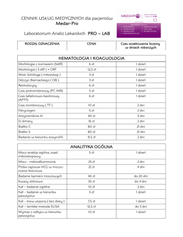 CENNIK USŁUG MEDYCZNYCH dla pacjentów Medar-Pro Laboratorium Analiz Lekarskich PRO – LAB RODZAJ OZNACZENIA CENA Czas oczekiwania liczony w dniach roboczych HEMATOLOGIA I KOAGUOLOGIA Morfologia z rozmazem (5diff) 6 zł 1 dzień 12,5 zł 1 dzień Wzór Schilinga ( mikroskop ) 3 zł 1 dzień Odczyn Biernackiego ( OB ) 3 zł 1 dzień Retikulocyty 6 zł 1 dzień Czas protrombinowy (PT, INR) 5 zł 1 dzień Czas kefalinowo-kaolinowy (APTT) 6 zł 1 dzień Czas trombinowy ( TT ) 10 zł 2 dni Fibrynogen 5 zł 2 dni Antytrombina III 40 zł 3 dni D-dimery 16 zł 2 dni Białko C 80 zł 21 dni Białko S 80 zł 21 dni Badanie w kierunku eozynofili 9,5 zł 2 dni Morfologia ( 3 diff ) + CRP ANALITYKA OGÓLNA Mocz-analiza ogólna, osad mikroskopowy 5 zł 1 dzień Mocz - mikroalbuminuria 23 zł 2 dni Próba ciążowa-HCG w moczuocena ilościowa 22 zł 4 dni Badanie kamieni moczowych 40 zł do 20 dni Kwasy żółciowe 35 zł do 4 dni Kał – badanie ogólne 10 zł 2 dni Kał – badanie w kierunku pasożytów 5 zł 1 dzień Kał – krew utajona ( bez diety ) 7,5 zł 1 dzień Kał – lamblie metoda ELISA 12,5 zł do 3 dni Wymaz z odbytu w kierunku pasożytów 10 zł 1 dzień BADANIA HORMONALNE TSH 11 zł 1 dzień FT3 11 zł 1 dzień FT4 11 zł 1 dzień T3 11 zł do 3 dni T4 11 zł do 3 dni P.ciała anty-TG 19 zł do 4 dni P.ciała anty-TPO 19 zł do 4 dni P/p receptorom TSH 70 zł do 10 dni Tyreoglobulina 50 zł do 4 dni FSH 11 zł 2 dni LH 11 zł 2 dni Estradiol 11 zł 2 dni Progesteron 11 zł 2 dni Testosteron 17 zł 2 dni Wolny testosteron 35 zł do 20 dni Kalcytonina 33 zł do 10 dni Homocysteina 50 zł do 10 dni ACTH 55 zł do 4 dni Witamina D Total (25 OH ) 95 zł do 10 dni Kortyzol 20 zł 2 dni PTH 25 zł 2 dni HGH – hormon wzrostu 45 zł do 4 dni HCG – beta ilościowo 15 zł do 6 dni BADANIA BIOCHEMICZNE ASPAT - AST 3,5 zł 1 dzień ALAT - ALT 3,5 zł 1 dzień Glukoza 4 zł 1 dzień Cholesterol 5 zł 1 dzień Cholesterol HDL 5 zł 1 dzień Trójglicerydy - TG 5 zł 1 dzień Lipidogram ( cholesterol, HDL, LDL wyliczany, TG ) 14 zł 1 dzień Białko całkowite 4,5 zł 1 dzień Mocznik 4,5 zł 1 dzień Kreatynina 4 zł 1 dzień Kwas moczowy 4 zł 1 dzień Bilirubina całkowita 5 zł 1 dzień Bilirubina bezpośrednia 6 zł 2 dni Elektrolity ( sód, potas ) 10 zł 1 dzień Fosfor 4 zł 1 dzień Wapń całkowity 4 zł 1 dzień Magnez 5 zł 1 dzień Żelazo 6 zł 1 dzień TIBC 6 zł 2 dni Chlorki 5,5 zł 1 dzień Lit 14 zł do 5 dni Fosfataza alkaliczna 5 zł 1 dzień Fosfataza kwaśna 7,5 zł 2 dni Amylaza 6 zł 1 dzień Lipaza 9 zł 2 dni GGTP 5 zł 1 dzień LDH 22 zł 2 dni Kinaza kreatyninowa - CK 6 zł 1 dzień CK-MB 26 zł 2 dni Troponina T 26 zł 3 dni Proteinogram 14,5 zł do 5 dni Albumina 4,5 zł 1 dzień Białko w moczu 4,5 zł 1 dzień Hemoglobina glikowana HbA1C 10 zł 5 dni Mukoproteidy 13 zł 3 dni BIAŁKA SPECYFICZNE ASO 7,5 zł 1 dzień Czynnik reumatoidalny 7,5 zł 1 dzień Białko CRP 6,5 zł 1 dzień Odczyn Waalera-Rosego 20 zł 1 dzień VDRL 7,5 zł 1 dzień IgE całkowite 15 zł 3 dni jedna klasa 15 zł 3 dni IgA, IgD, IgG, IgM DIAGNOSTYKA ANEMII Ferrytyna 16 zł 2 dni Kwas foliowy 20 zł 2 dni Witamina B12 17,5 zł 2 dni Transferyna 17,5 zł 2 dni MARKERY NOWOTWOROWE I OSTEOPOROZY PSA 20 zł 1 dzień PSA wolne 22,5 zł 1 dzień CEA 17,5 zł 2 dni AFP 20 zł 2 dni Ca 125 17,5 zł 2 dni Ca 15-3 20 zł 2 dni Ca 19-9 17,5 zł 2 dni Ca 72-4 75 zł 3 dni CYFRA 21-1 120 zł do 20 dni NSE 85 zł do 20 dni SEROLOGIA Grupa krwi 20 zł 2-4 dni Odczyn Coombsa PTA 14 zł 2-4 dni DIAGNOSTYKA INFEKCJI I ZAKAŹNICTWO HBs-antygen 9 zł 1 dzień Anty - HBs 17,5 zł 2 dni Anty HAV total 31 zł 2 dni Anty HAV IgM 31 zł 5 dni Anty Hbc (przeciwciała ) 31 zł 2 dni Antygen HBe 31 zł 5 dni HCV 18 zł 1 dzień HIV 25 zł 1 dzień Helicobacter Pylori IgG jakościowo 14 zł 1 dzień Helicobacter Pylori IgG ilościowo 30 zł 2 dni Helicobacter Pylori IgM ilościowo 30 zł 5 dni Helicobacter Pylori – antygen materiał kał 30 zł 2 dni Toksoplazmoza IgG ilościowo 15 zł 4 dni Toksoplazmoza IgM ilościowo 15 zł 4 dni Toksoplazmoza IgA jakościowo 40 zł 4 dni Toksoplazmoza - awidność 50 zł do 10 dni Różyczka IgG - ilościowo 23 zł 4 dni Różyczka IgM - ilościowo 23 zł 4 dni Bordetella Pestusiss IgG ilościowo 40 zł 4 dni Bordetella Pertusiss IgM ilościowo 40 zł 4 dni Mycoplazma Pneumoniae IgG 30 zł 4 dni Mycoplazma Pneumoniae IgM 30zł 4 dni Borelia burgdorferii IgG 20 zł 4 dni Borelia burgdorferii IgM 20 zł 4 dni Chlamydia Pneumoniae IgG 27 zł 4 dni Chlamydia Pneumoniae IgM 27 zł 4 dni Chlamydia Trachomatis IgG 27 zł 4 dni Chlamydia Trachomatis IgM 27 zł 4 dni Świnka IgG - ocena miana 60 zł 4 dni Świnka IgM – ocena miana 60 zł 4 dni CMV IgG / IgM / jedna klasa 30 zł 4 dni Odra IgG / IgM jedna klasa 60 zł 10 dni Varicella Zoster IgG / IgM jedna klasa 40 zł 10 dni 40 zł 4dni P/ciała p. gliście ludzkiej BAKTERIOLOGIA Posiew mocz 22,5zł do 5 dni Posiew kału na florę ogólną 22,5 zł do 5 dni Posiew kału w kierunku grzybów 22,5 zł do 12 dni Wymazy ( gardło, nos, rana itp) 22,5 zł do 12 dni Badanie w kierunku dermatofitów 35 zł do 30 dni Badanie na nosicielstwo 3x kał 100 zł do 4 dni Stopień czystości pochwy ( z oceną preparatu w kierunku grzybów drożdżopodobnych) 20 zł do 3dni Cytologia ginekologiczna 15 zł do 5 dni INNE Karbomazepina ilościowo 40 zł Kwas walproinowy 60 zł Insulina 52 zł Aldosteron 50 zł Gluten 40 zł Serotonina 60 zł