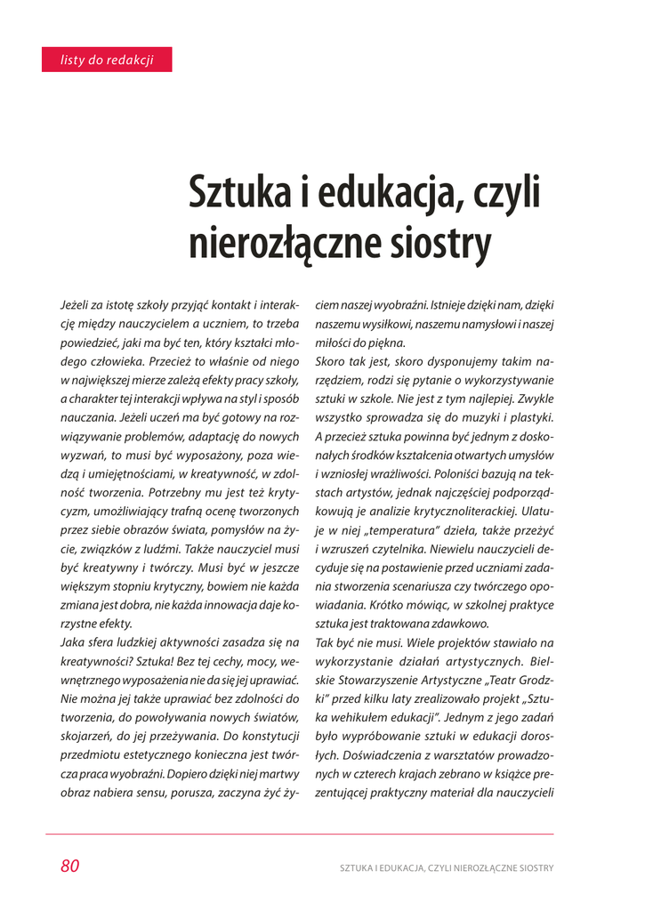 listy do redakcji Sztuka i edukacja, czyli nierozłączne siostry Jeżeli za istotę szkoły przyjąć kontakt i interakcję między nauczycielem a uczniem, to trzeba powiedzieć, jaki ma być ten, który kształci młodego człowieka. Przecież to właśnie od niego w największej mierze zależą efekty pracy szkoły, a charakter tej interakcji wpływa na styl i sposób nauczania. Jeżeli uczeń ma być gotowy na rozwiązywanie problemów, adaptację do nowych wyzwań, to musi być wyposażony, poza wiedzą i umiejętnościami, w kreatywność, w zdolność tworzenia. Potrzebny mu jest też krytycyzm, umożliwiający trafną ocenę tworzonych przez siebie obrazów świata, pomysłów na życie, związków z ludźmi. Także nauczyciel musi być kreatywny i twórczy. Musi być w jeszcze większym stopniu krytyczny, bowiem nie każda zmiana jest dobra, nie każda innowacja daje korzystne efekty. Jaka sfera ludzkiej aktywności zasadza się na kreatywności? Sztuka! Bez tej cechy, mocy, wewnętrznego wyposażenia nie da się jej uprawiać. Nie można jej także uprawiać bez zdolności do tworzenia, do powoływania nowych światów, skojarzeń, do jej przeżywania. Do konstytucji przedmiotu estetycznego konieczna jest twórcza praca wyobraźni. Dopiero dzięki niej martwy obraz nabiera sensu, porusza, zaczyna żyć ży- 80 ciem naszej wyobraźni. Istnieje dzięki nam, dzięki naszemu wysiłkowi, naszemu namysłowi i naszej miłości do piękna. Skoro tak jest, skoro dysponujemy takim narzędziem, rodzi się pytanie o wykorzystywanie sztuki w szkole. Nie jest z tym najlepiej. Zwykle wszystko sprowadza się do muzyki i plastyki. A przecież sztuka powinna być jednym z doskonałych środków kształcenia otwartych umysłów i wzniosłej wrażliwości. Poloniści bazują na tekstach artystów, jednak najczęściej podporządkowują je analizie krytycznoliterackiej. Ulatuje w niej „temperatura” dzieła, także przeżyć i wzruszeń czytelnika. Niewielu nauczycieli decyduje się na postawienie przed uczniami zadania stworzenia scenariusza czy twórczego opowiadania. Krótko mówiąc, w szkolnej praktyce sztuka jest traktowana zdawkowo. Tak być nie musi. Wiele projektów stawiało na wykorzystanie działań artystycznych. Bielskie Stowarzyszenie Artystyczne „Teatr Grodzki” przed kilku laty zrealizowało projekt „Sztuka wehikułem edukacji”. Jednym z jego zadań było wypróbowanie sztuki w edukacji doros łych. Doświadczenia z warsztatów prowadzonych w czterech krajach zebrano w książce prezentującej praktyczny materiał dla nauczycieli SZTUKA I EDUKACJA, CZYLI NIEROZŁĄCZNE SIOSTRY listy do redakcji i trenerów (publikacja dostępna na stronie http:// teatrgrodzki.pl//wp-content/uploads/2009/08/ Sztuka-wehiku%C5%82em-edukacji.pdf ). Zajęcia w polskiej grupie prowadzone były w dwóch powiązanych ze sobą blokach: edukacyjnym i artystycznym. Bardzo ważne było wprowadzenie rozmaitych form sztuki jako środków poznania: malarstwa, plakatu, muzyki, filmu, piosenki i pieśni, spektakli teatralnych. Oczywiście w tym wymiarze przewagę miała percepcja dzieła, a nie jego tworzenie. Jednak sam odbiór sztuki angażuje człowieka, jego intelekt, wyobraźnię i emocje. Ukierunkowanie na materiał edukacyjny, określenie tego, co stanowić ma przedmiot poznania, wynikało z zadania realizowanego na zajęciach artystycznych. Na przykład stworzenie plenerowego spektaklu przedstawiającego historię założenia Wilna stało się kanwą poszukiwań informacji o realiach życia Litwinów w czasach Giedymina, legend i podań o tym władcy, historycznych ocen tej postaci, obrazów, pomników itd. Uczestnicy poznawali m.in.: wymagania co do struktury takiego widowiska, zasady konstrukcji scenariusza, prawidła ruchu scenicznego, niezbędne elementy rzemiosła teatralnego. Na warsztatach teatralnych wykorzystywali zdobytą wie- fot. Africa Studio / shutterstock.com dzę i w trakcie pracy poszukiwali odpowiedzi na kolejne pytania. To znowu wpływało na temat prac zajęć edukacyjnych. Wszystko to było potrzebne, by w grupowej pracy stworzyć spektakl. Uczestnicy zajęć zdobywali i wykorzystywali wiedzę oraz własne powiększające się doświadczenia estetyczne, by poruszyć widzów swoim przedstawieniem. Trzeba podkreślić wspólnotowy wymiar pracy oraz możliwość swobodnego wypowiadania się i tworzenia, opartego na własnym widzeniu świata i zdobytym życiowym doświadczeniu. Bez wolności nie można być artystą, jednak odsłonięcie się, prezentacja własnych osobistych wizji i pomysłów wymaga zintegrowania grupy oraz życzliwej atmosfery. Strach przed nauczycielem, przed ośmieszeniem czy szyderstwem blokuje, nie pozwala być szczerym, a co za tym idzie – twórczym. Stworzenie przezwyciężających te zagrożenia warunków jest zadaniem prowadzącego zajęcia. Mniej krytyki, wytykania błędów, a więcej inspiracji i wskazań możliwości udoskonalenia powstającego dzieła sprzyja rozwojowi osobistej ekspresji i wyrażaniu własnych sądów. Sprawy ostatnie: wiele mówimy o wartościach. Niewiele jednak o tym, że powinniśmy być ich strażnikami. Piękno bez ludzi je kochających, do- 81 listy do redakcji świadczających jego uroku, bez rozmów o wzruszeniach dziełem sztuki, pejzażem, czynem (tak, są także piękne czyny) przestaje istnieć. Wtedy zamiast piękna na arenę dziejów wchodzą reklamy. Przeprowadzono wiele projektów szeroko wykorzystujących działania artystyczne. Jednak obok wielu zalet mają one istotny mankament. Wszystkie są okresowe. Kończą się, a ich dorobek, opracowane metody, stworzone dzieła rozsiane są po wielu stronach internetowych. Próbą zebrania tych osiągnięć i doświadczeń w jednym miejscu oraz stworzenia wspólnoty ludzi wykorzystujących sztukę w kształceniu jest projekt „Art as a vehicle for education and social inclusion” (Sztuka jako wehikuł edukacji i społecznego włączenia). Na platformie internetowej h