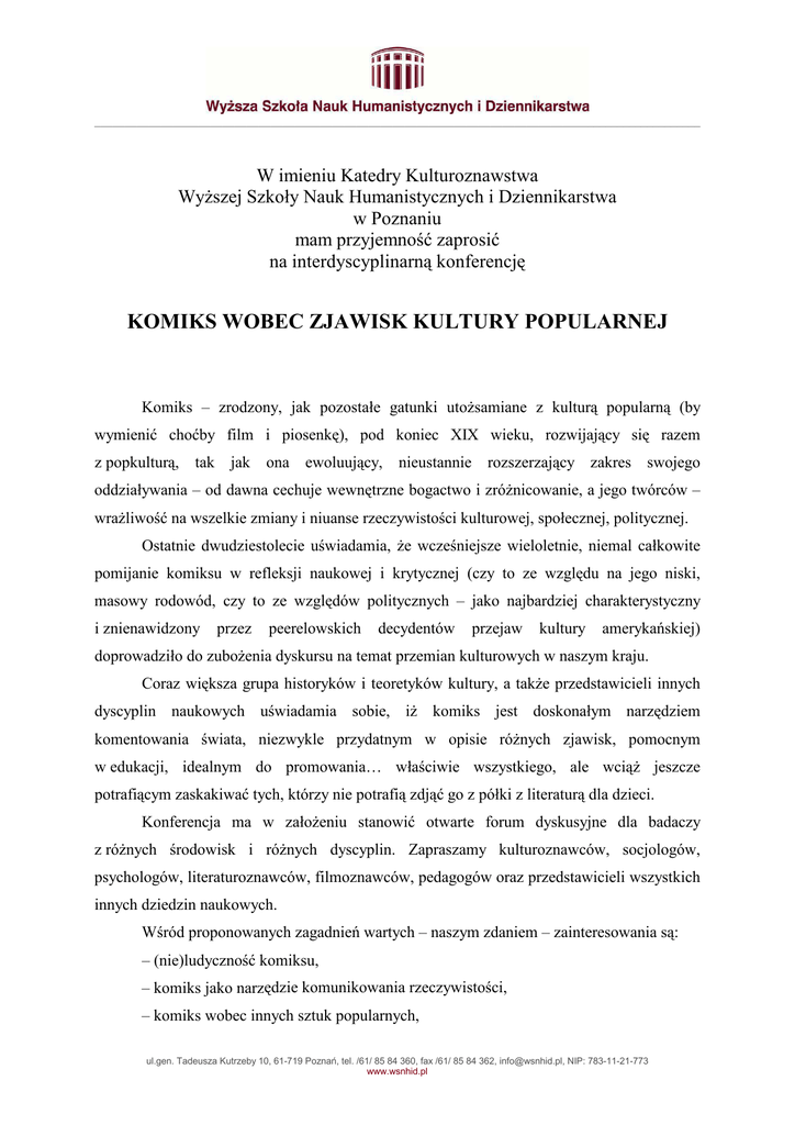 ____________________________________________________________________________________________________ W imieniu Katedry Kulturoznawstwa Wyższej Szkoły Nauk Humanistycznych i Dziennikarstwa w Poznaniu mam przyjemność zaprosić na interdyscyplinarną konferencję KOMIKS WOBEC ZJAWISK KULTURY POPULARNEJ Komiks – zrodzony, jak pozostałe gatunki utożsamiane z kulturą popularną (by wymienić choćby film i piosenkę), pod koniec XIX wieku, rozwijający się razem z popkulturą, tak jak ona ewoluujący, nieustannie rozszerzający zakres swojego oddziaływania – od dawna cechuje wewnętrzne bogactwo i zróżnicowanie, a jego twórców – wrażliwość na wszelkie zmiany i niuanse rzeczywistości kulturowej, społecznej, politycznej. Ostatnie dwudziestolecie uświadamia, że wcześniejsze wieloletnie, niemal całkowite pomijanie komiksu w refleksji naukowej i krytycznej (czy to ze względu na jego niski, masowy rodowód, czy to ze względów politycznych – jako najbardziej charakterystyczny i znienawidzony przez peerelowskich decydentów przejaw kultury amerykańskiej) doprowadziło do zubożenia dyskursu na temat przemian kulturowych w naszym kraju. Coraz większa grupa historyków i teoretyków kultury, a także przedstawicieli innych dyscyplin naukowych uświadamia sobie, iż komiks jest doskonałym narzędziem komentowania świata, niezwykle przydatnym w opisie różnych zjawisk, pomocnym w edukacji, idealnym do promowania… właściwie wszystkiego, ale wciąż jeszcze potrafiącym zaskakiwać tych, którzy nie potrafią zdjąć go z półki z literaturą dla dzieci. Konferencja ma w założeniu stanowić otwarte forum dyskusyjne dla badaczy z różnych środowisk i różnych dyscyplin. Zapraszamy kulturoznawców, socjologów, psychologów, literaturoznawców, filmoznawców, pedagogów oraz przedstawicieli wszystkich innych dziedzin naukowych. Wśród proponowanych zagadnień wartych – naszym zdaniem – zainteresowania są: – (nie)ludyczność komiksu, – komiks jako narzędzie komunikowania rzeczywistości, – komiks wobec innych sztuk popularnych, ul.gen. Tadeusza Kutrzeby 10, 61-719 Poznań, tel. /61/ 85 84 360, fax /61/ 85 84 362, [email protected], NIP: 783-11-21-773 www.wsnhid.pl ____________________________________________________________________________________________________ – komiks wobec różnych form kultury, – recepcja komiksu jako wyznacznik jego miejsca w świecie sztuki i rzeczywistości społecznej, – komiks a zjawisko popularyzacji rzeczywistości, – komiks w Internecie, – komiks w edukacji. Konferencja odbędzie się 21-22 listopada 2012 w Wyższej Szkole Nauk Humanistycznych i Dziennikarstwa w Poznaniu. Zgłoszenia należy przesyłać na adres [email protected] do 10 października 2012. Pod tym adresem można również uzyskać wszelkie informacje na temat konferencji. Prosimy o podanie tytułu wystąpienia oraz załączenie krótkiego (do 1000 znaków) streszczenia. Jednocześnie zastrzegamy sobie prawo do wyboru nadesłanych propozycji. Przewidywany czas wystąpienia to 20 minut. Opłata konferencyjna wynosi 250 zł i nie obejmuje noclegów oraz zwrotu kosztów przejazdów. Organizatorzy zapewniają natomiast obiady oraz pomoc w znalezieniu noclegów. Efektem konferencji będzie punktowana monografia, której wydanie planujemy na rok 2013. dr Michał Traczyk ul.gen. Tadeusza Kutrzeby 10, 61-719 Poznań, tel. /61/ 85 84 360, fax /61/ 85 84 362, [email protected], NIP: 783-11-21-773 www.wsnhid.pl