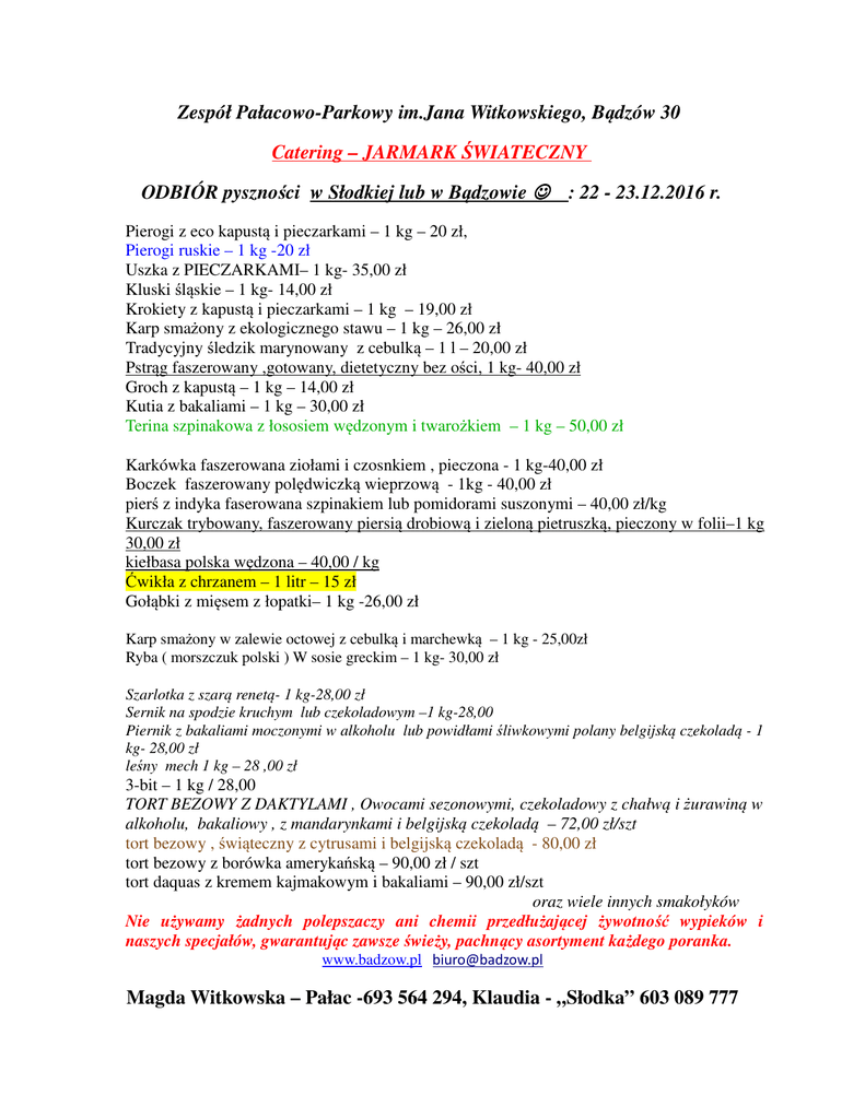 Zespół Pałacowo-Parkowy im.Jana Witkowskiego, Bądzów 30 Catering – JARMARK ŚWIATECZNY ODBIÓR pyszności w Słodkiej lub w Bądzowie ☺ : 22 - 23.12.2016 r. Pierogi z eco kapustą i pieczarkami – 1 kg – 20 zł, Pierogi ruskie – 1 kg -20 zł Uszka z PIECZARKAMI– 1 kg- 35,00 zł Kluski śląskie – 1 kg- 14,00 zł Krokiety z kapustą i pieczarkami – 1 kg – 19,00 zł Karp smażony z ekologicznego stawu – 1 kg – 26,00 zł Tradycyjny śledzik marynowany z cebulką – 1 l – 20,00 zł Pstrąg faszerowany ,gotowany, dietetyczny bez ości, 1 kg- 40,00 zł Groch z kapustą – 1 kg – 14,00 zł Kutia z bakaliami – 1 kg – 30,00 zł Terina szpinakowa z łososiem wędzonym i twarożkiem – 1 kg – 50,00 zł Karkówka faszerowana ziołami i czosnkiem , pieczona - 1 kg-40,00 zł Boczek faszerowany polędwiczką wieprzową - 1kg - 40,00 zł pierś z indyka faserowana szpinakiem lub pomidorami suszonymi – 40,00 zł/kg Kurczak trybowany, faszerowany piersią drobiową i zieloną pietruszką, pieczony w folii–1 kg 30,00 zł kiełbasa polska wędzona – 40,00 / kg Ćwikła z chrzanem – 1 litr – 15 zł Gołąbki z mięsem z łopatki– 1 kg -26,00 zł Karp smażony w zalewie octowej z cebulką i marchewką – 1 kg - 25,00zł Ryba ( morszczuk polski ) W sosie greckim – 1 kg- 30,00 zł Szarlotka z szarą renetą- 1 kg-28,00 zł Sernik na spodzie kruchym lub czekoladowym –1 kg-28,00 Piernik z bakaliami moczonymi w alkoholu lub powidłami śliwkowymi polany belgijską czekoladą - 1 kg- 28,00 zł leśny mech 1 kg – 28 ,00 zł 3-bit – 1 kg / 28,00 TORT BEZOWY Z DAKTYLAMI , Owocami sezonowymi, czekoladowy z chałwą i żurawiną w alkoholu, bakaliowy , z mandarynkami i belgijską czekoladą – 72,00 zł/szt tort bezowy , świąteczny z cytrusami i belgijską czekoladą - 80,00 zł tort bezowy z borówka amerykańską – 90,00 zł / szt tort daquas z kremem kajmakowym i bakaliami – 90,00 zł/szt oraz wiele innych smakołyków Nie używamy żadnych polepszaczy ani chemii przedłużającej żywotność wypieków i naszych specjałów, gwarantując zawsze świeży, pachnący asortyment każdego poranka. www.badzow.pl [email protected] Magda Witkowska – Pałac -693 564 294, Klaudia - „Słodka” 603 089 777