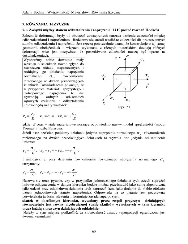 Adam Bodnar: Wytrzymałość Materiałów. Równania fizyczne. 7. RÓWNANIA FIZYCZNE 7.1. Związki między stanem odkształcenia i naprężenia. I i II postać równań Hooke’a Zależność deformacji bryły od obciążeń zewnętrznych narzuca istnienie zależności między odkształceniami i naprężeniami. Będziemy się starali ustalić te zależności dla przestrzennych stanów odkształcenia i naprężenia. Jest rzeczą powszechnie znaną, że konstrukcje o tej samej geometrii, obciążeniach i więzach, wykonane z różnych materiałów, doznają różnych deformacji więc jest oczywiste, że poszukiwane zależności muszą być oparte na doświadczeniach. σz Z σx Wyobraźmy sobie dowolnie mały sześcian o ściankach równoległych do płaszczyzn układu współrzędnych i poddajmy go działaniu naprężenia σy σy σx, równomiernie normalnego rozłożonego na dwóch przeciwległych ściankach. Doświadczenia pokazują, że Y w przypadku materiału sprężystego i izotropowego naprężenia te nie wywołają żadnych odkształceń σx σz kątowych sześcianu, a odkształcenia X liniowe będą miały wartości: Rys. 7.1 εx = σx E , ε y = ε z = − ν ε x = −ν σx E gdzie: E oraz ν stałe materiałowe noszące odpowiednio nazwy moduł sprężystości (moduł Younga) i liczba Poissona. Jeżeli nasz sześcian poddamy działaniu jedynie naprężenia normalnego σ y , równomiernie rozłożonego na dwóch przeciwległych ściankach to wywoła ono jedynie odkształcenia liniowe: εy = σy E , ε x = ε z = − ν ε y = −ν σy E . I analogicznie, przy działaniu równomiernie rozłożonego naprężenia normalnego σ z , otrzymamy: εz = σz E , ε x = ε y = − ν ε z = −ν σz E . Nasuwa się teraz pytanie, czy w przypadku jednoczesnego działania tych trzech naprężeń liniowe odkształcenia w danym kierunku będzie można przedstawić jako sumę algebraiczną odkształceń przy oddzielnym działaniu tych naprężeń (tzn. jako dodanie do siebie efektów trzech jednoosiowych stanów naprężenia). Odpowiedź na to pytanie jest pozytywna, potwierdzają ją doświadczenia i formułuje zasada superpozycji: skutek w określonym kierunku, wywołany przez zespół przyczyn działających równocześnie jest równy algebraicznej sumie skutków wywołanych w tym kierunku przez każdą z przyczyn działających oddzielnie. Należy w tym miejscu podkreślić, że stosowalność zasady superpozycji ograniczona jest dwoma warunkami: 60 Adam Bodnar: Wytrzymałość Materiałów. Równania fizyczne. • warunkiem proporcjonalności – wymagającym, aby poszczególne skutki były liniowo zależne od przyczyn, które je wywołały, • warunkiem niezależności działania – wymagającym, aby żaden ze skutków nie wpływał na sposób działania pozostałych przyczyn. Przyjęte przez nas założenia odnośnie materiału oraz małości przemieszczeń i odkształceń prowadzą do spełnienia tych warunków. Tak więc, wykorzystując zasadę superpozycji możemy zapisać: 1 σ x −ν σ y + σ z E 1 εy = σ y −ν (σ x + σ z ) E 1 εz = σ z −ν σ x + σ y E [ [ [ εx = ( ( )] ] )] (7.1) Powyższe równania pokazują, że związki między odkształceniami liniowymi i naprężeniami normalnymi określone są poprzez dwie stałe materiałowe E i ν. Do określenia związków między odkształceniami kątowymi i naprężeniami stycznymi mogą również służyć te same stałe. Aby tego dowieść rozważmy stan naprężenia określony macierzą : 0 0 Tσ = 0 σ 0 0 0 0 . − σ Jest to płaski stan naprężenia w płaszczyźnie (Y, Z) i - jak pokazano na rys. 7.2 - na płaszczyznach nachylonych pod kątem 45 do osi (Y, Z) występują jedynie naprężenia styczne τ = σ (por. przykład 5.4.2). Z σ Y εz 2 τ =σ 90 o − γ σ 1 σ Y Y Y Odkształcenia liniowe w kierunkach osi układu wynoszą: 1 +ν εy = σ E , 1 +ν εz = − σ E a kątowe jest rowne zeru. γ osi Odkształcenie kątowe obróconych o kąt 45° wynoszą: ε y −ε z 1 +ν γ =− sin − 90 o = σ , 2 2 E ale τ = σ stąd: 2 (1 + ν ) γ= τ. E Oznaczając przez E G= , ostatecznie możemy 2 (1 +ν ) ( εz 2 εy 2 σ Y 1 εy 2 Rys. 7.2 ) zapisać związek między odkształceniem kątowym i naprężeniem stycznym w formie: 61 Adam Bodnar: Wytrzymałość Materiałów. Równania fizyczne. γ= τ G , (7.2) gdzie stała materiałowa G nazywana jest modułem ścinania lub Kirchhoffa albo modułem sprężystośći poprzecznej. Powracając do rozważanego na początku sześcianu poddajmy go teraz kolejno działaniu równomiernie rozłożonych naprężeń stycznych pokazanych na rys. 7.3. W przypadku sprężystego ciała izotropowego nie wywołają one odkształceń liniowych a kątowe będą równe: Z τ zy τ zx τ yz τ xz τ yx τ xy X γ xy = Y γ yz = γ xz = Rys. 7.3 τ xy , G τ yz , G τ xz G (7.3) . Równania (7.1) i (7.3) określające związki między odkształceniami i naprężeniami nazywają się równaniami Hooke’a lub związkami konstytutywnymi lub fizycznymi. Tę postać równań fizycznych w których odkszałcenia są funkcjami naprężeń nazwiemy I postacią równań Hooke’a. Ponieważ rozważamy materiały z załozenia izotropowe to występują w nich tylko dwie stałe materiałowe które należy wyznaczyć doświadczalnie. Sposób ich wyznaczenia podany zostanie w toku dalszych wykładów. Udowodnimy teraz ważne twierdzenie: w ciele sprężystym i izotropowym kierunki naprężeń głównych pokrywają się z kierunkami odkształceń głównych. Dowód: niech osie X, Y i Z to osie głównych naprężeń. Jeśli tak to naprężenia styczne τ xy = τ yz = τ zx = 0 a dalej z (7.3) γ xy = γ yz = γ zx = 0 co dowodzi, że te osie są osiami odkształceń głównych. Aby wyprowadzić związki między naprężeniami i odkształceniami należy odwrócić równania (7.1) i (7.3). Odwrócenie tych drugich jest sprawą bardzo prostą. Pierwsze odwrócimy kolejno wykonując: ( ) Eεx = σ x 