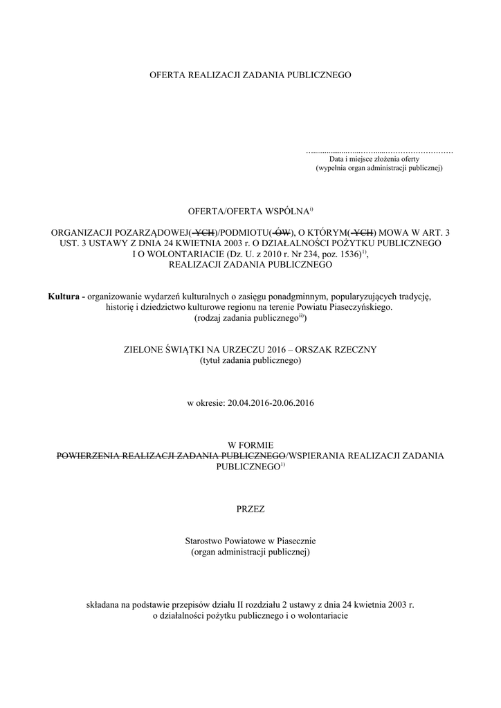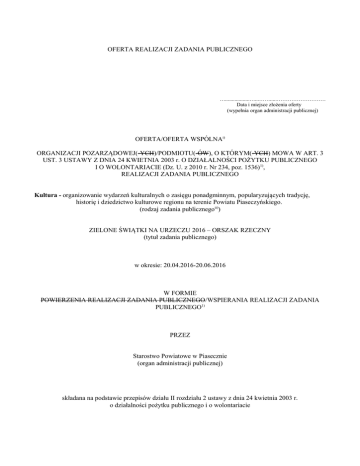 OFERTA REALIZACJI ZADANIA PUBLICZNEGO …..................…...…….....……………………… Data i miejsce złożenia oferty (wypełnia organ administracji publicznej) OFERTA/OFERTA WSPÓLNAi) ORGANIZACJI POZARZĄDOWEJ(-YCH)/PODMIOTU(-ÓW), O KTÓRYM(-YCH) MOWA W ART. 3 UST. 3 USTAWY Z DNIA 24 KWIETNIA 2003 r. O DZIAŁALNOŚCI POŻYTKU PUBLICZNEGO I O WOLONTARIACIE (Dz. U. z 2010 r. Nr 234, poz. 1536)1), REALIZACJI ZADANIA PUBLICZNEGO Kultura - organizowanie wydarzeń kulturalnych o zasięgu ponadgminnym, popularyzujących tradycję, historię i dziedzictwo kulturowe regionu na terenie Powiatu Piaseczyńskiego. (rodzaj zadania publicznegoii)) ZIELONE ŚWIĄTKI NA URZECZU 2016 – ORSZAK RZECZNY (tytuł zadania publicznego) w okresie: 20.04.2016-20.06.2016 W FORMIE POWIERZENIA REALIZACJI ZADANIA PUBLICZNEGO/WSPIERANIA REALIZACJI ZADANIA PUBLICZNEGO1) PRZEZ Starostwo Powiatowe w Piasecznie (organ administracji publicznej) składana na podstawie przepisów działu II rozdziału 2 ustawy z dnia 24 kwietnia 2003 r. o działalności pożytku publicznego i o wolontariacie I. Dane oferenta/oferentów1), iii) 1) nazwa: Fundacja Szerokie Wody 2) forma prawna:iv) ( ) stowarzyszenie ( ) kościelna osoba prawna ( ) spółdzielnia socjalna ( X ) fundacja ( ) kościelna jednostka organizacyjna ( ) inna………………………………… 3) numer w Krajowym Rejestrze Sądowym, w innym rejestrze lub ewidencji: v) 0000419010 4) data wpisu, rejestracji lub utworzenia: vi) 27.04.2012 5) nr NIP: 522-299-63-10 nr REGON: 146111545 6) adres: miejscowość: Warszawa ul. Augustówka 36 dzielnica lub inna jednostka pomocnicza:vii) Mokotów gmina: Warszawa. powiat:viii) Warszawa województwo: mazowieckie kod pocztowy: 02-981 poczta: Warszawa 7) tel.:606 777 154 faks: brak e-mail: [email protected] http:// w budowie 8) numer rachunku bankowego: 43 1140 2004 0000 3402 7508 7513 nazwa banku: mBank 9) nazwiska i imiona osób upoważnionych do reprezentowania oferenta/oferentów 1): a) Andrzej Stański 10) nazwa, adres i telefon kontaktowy jednostki organizacyjnej bezpośrednio wykonującej zadanie, o którym mowa w ofercie:ix) Fundacja Szerokie Wody, ul. Augustówka 36, 02-981 Warszawa, tel. 606 777 154 11) osoba upoważniona do składania wyjaśnień dotyczących oferty (imię i nazwisko oraz nr telefonu kontaktowego) Grażyna Leśniak, [email protected], Tel. 724 777 003 12) przedmiot działalności pożytku publicznego: a) działalność nieodpłatna pożytku publicznego 1. działalność nieodpłatna pożytku publicznego a) prowadzenie działalności propagandowej b) organizowanie spotkań środowiskowych, seminariów i konferencji naukowych c) udział w tworzeniu planów zagospodarowania przestrzennego d) przygotowanie analiz środowiskowych i podobnych dokumentów e) współpraca z instytucjami naukowymi i badawczymi zajmującego się ochroną środowiska i ochroną zdrowia, edukacją i planowaniem inwestycyjnym oraz sektorem obrony kraju f) realizację takich projektów jak: Flis Festiwal, Festiwal Wisły i Bieg Żaglowców Tradycyjnych g) działania na rzecz zrównoważonego rozwoju Doliny Środkowej Wisły h) wydawanie nieodpłatnie prospektów i tytułów prasowych i) społeczne zrozumienie roli i znaczenia nauki, jako czynnika kulturotwórczego i cywilizacyjnego współdecydującego o wszechstronnym rozwoju kraju i jego miejscu w światowej społeczności j) prowadzenie współpracy z zakładami służby zdrowia, organizacjami społecznymi i biurami projektów k) wspomaganie inicjatyw zgodnych z celami Fundacji poprzez pomoc materialną, oświatową i organizacyjną l) prowadzenie społecznych ekspertyz, opinii, raportów i analiz m) propagowanie postaw proekologicznych wśród społeczeństwa n) upowszechnianie zjawisk kulturalnych poprzez organizowanie wystaw, koncertów, festiwali, eventów i rekonstrukcji o) propagowanie kultury polskiej wśród obcokrajowców w innych krajach oraz przybliżanie Polakom kultury innych narodów p) popularyzowanie sportów i aktywności turystycznej wśród starszego pokolenia i młodzieży q) rozwijanie i propagowanie sportów wodnych takich jak: żeglarstwo, kajakarstwo, nurkowanie i wioślarstwo r) upowszechnianie wiedzy o zdrowej żywności s) rozwój wioślarstwa rekreacyjnego, upowszechnianie turystyki wioślarskiej na rzekach i jeziorach. Organizowanie oceanicznych wypraw wioślarskich. t) edukacja młodzieży poprzez badania chemiczne wód rzecznych oraz monitorowanie zakładów przemysłowych, ze stałym publikowaniem efektów pracy badawczej tworzenie produktów turystycznych, zarządzanych przez Fundację oraz na zlecenie innych podmiotów a) działalność odpłatna pożytku publicznego wydawanie książek, czasopism, periodyków oraz pozostała działalność wydawnicza, produkcja filmów, nagrań wideo, programów telewizyjnych, nagrań dźwiękowych i muzycznych, działalność usługowa w zakresie informacji, wynajem i zarządzanie nieruchomościami, badania naukowe i prace rozwojowe w dziedzinie pozostałych nauk przyrodniczych i technicznych, reklama, działalność agentów i pośredników turystycznych oraz organizatorów turystycznych, działalność związana z organizacją koncertów, festiwali, targów, wystaw i kongresów, pozaszkolne formy edukacji, transport wodny, produkcja łodzi wycieczkowych, działalność usługowa związana z wyżywieniem. 13) jeżeli oferent/oferenci1) prowadzi/prowadzą1) działalność gospodarczą: a) numer wpisu do rejestru przedsiębiorców 0000419010 b) przedmiot działalności gospodarczej 58.1 wydawanie książek, czasopism, periodyków oraz pozostała działalność wydawnicza, z wyłączeniem w zakresie oprogramowania 59.—działalność związana z produkcją filmów, nagrań wideo, programów telewizyjnych, nagrań dźwiękowych i muzycznych, 63.-- działalność usługowa w zakresie informacji, 68.20 Z wynajem i zarządzanie nieruchomościami własnymi lub dzierżawionymi 72.19 Z badania nauk