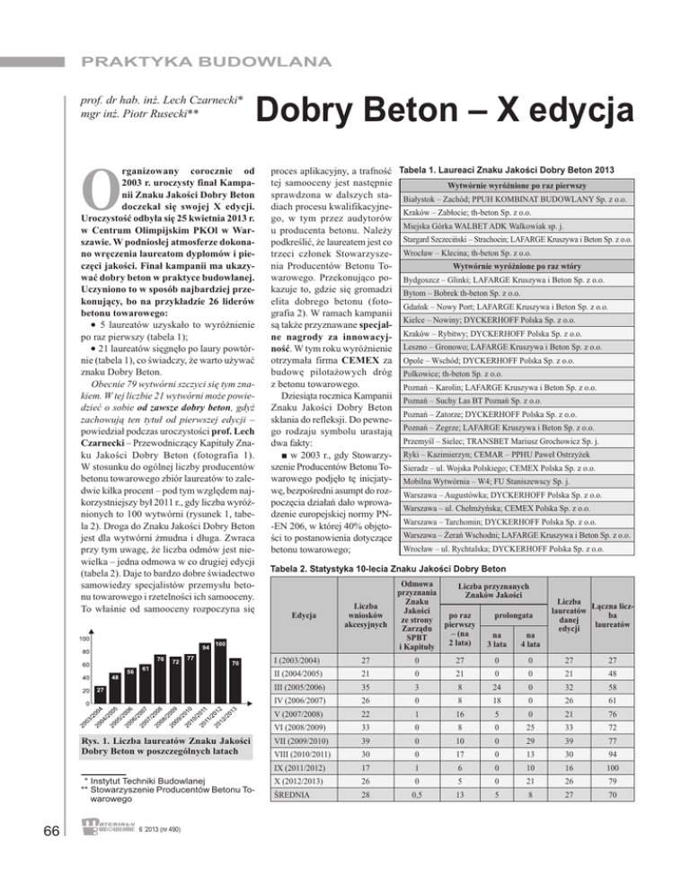 PRAKTYKA BUDOWLANA prof. dr hab. inż. Lech Czarnecki* mgr inż. Piotr Rusecki** O rganizowany corocznie od 2003 r. uroczysty finał Kampanii Znaku Jakości Dobry Beton doczekał się swojej X edycji. Uroczystość odbyła się 25 kwietnia 2013 r. w Centrum Olimpijskim PKOl w Warszawie. W podniosłej atmosferze dokonano wręczenia laureatom dyplomów i pieczęci jakości. Finał kampanii ma ukazywać dobry beton w praktyce budowlanej. Uczyniono to w sposób najbardziej przekonujący, bo na przykładzie 26 liderów betonu towarowego: • 5 laureatów uzyskało to wyróżnienie po raz pierwszy (tabela 1); • 21 laureatów sięgnęło po laury powtórnie (tabela 1), co świadczy, że warto używać znaku Dobry Beton. Obecnie 79 wytwórni szczyci się tym znakiem. W tej liczbie 21 wytwórni może powiedzieć o sobie od zawsze dobry beton, gdyż zachowują ten tytuł od pierwszej edycji – powiedział podczas uroczystości prof. Lech Czarnecki – Przewodniczący Kapituły Znaku Jakości Dobry Beton (fotografia 1). W stosunku do ogólnej liczby producentów betonu towarowego zbiór laureatów to zaledwie kilka procent – pod tym względem najkorzystniejszy był 2011 r., gdy liczba wyróżnionych to 100 wytwórni (rysunek 1, tabela 2). Droga do Znaku Jakości Dobry Beton jest dla wytwórni żmudna i długa. Zwraca przy tym uwagę, że liczba odmów jest niewielka – jedna odmowa w co drugiej edycji (tabela 2). Daje to bardzo dobre świadectwo samowiedzy specjalistów przemysłu betonu towarowego i rzetelności ich samooceny. To właśnie od samooceny rozpoczyna się Dobry Beton – X edycja proces aplikacyjny, a trafność Tabela 1. Laureaci Znaku Jakości Dobry Beton 2013 tej samooceny jest następnie Wytwórnie wyróżnione po raz pierwszy sprawdzona w dalszych sta- Białystok – Zachód; PPUH KOMBINAT BUDOWLANY Sp. z o.o. diach procesu kwalifikacyjneKraków – Zabłocie; th-beton Sp. z o.o. go, w tym przez audytorów u producenta betonu. Należy Miejska Górka WALBET ADK Walkowiak sp. j. podkreślić, że laureatem jest co Stargard Szczeciński – Strachocin; LAFARGE Kruszywa i Beton Sp. z o.o. trzeci członek Stowarzysze- Wrocław – Klecina; th-beton Sp. z o.o. nia Producentów Betonu ToWytwórnie wyróżnione po raz wtóry warowego. Przekonująco po- Bydgoszcz – Glinki; LAFARGE Kruszywa i Beton Sp. z o.o. kazuje to, gdzie się gromadzi Bytom – Bobrek th-beton Sp. z o.o. elita dobrego betonu (fotoGdańsk – Nowy Port; LAFARGE Kruszywa i Beton Sp. z o.o. grafia 2). W ramach kampanii Kielce – Nowiny; DYCKERHOFF Polska Sp. z o.o. są także przyznawane specjalne nagrody za innowacyj- Kraków – Rybitwy; DYCKERHOFF Polska Sp. z o.o. ność. W tym roku wyróżnienie Leszno – Gronowo; LAFARGE Kruszywa i Beton Sp. z o.o. otrzymała firma CEMEX za Opole – Wschód; DYCKERHOFF Polska Sp. z o.o. budowę pilotażowych dróg Polkowice; th-beton Sp. z o.o. z betonu towarowego. Poznań – Karolin; LAFARGE Kruszywa i Beton Sp. z o.o. Dziesiąta rocznica Kampanii Poznań – Suchy Las BT Poznań Sp. z o.o. Znaku Jakości Dobry Beton Poznań – Zatorze; DYCKERHOFF Polska Sp. z o.o. skłania do refleksji. Do pewnego rodzaju symbolu urastają Poznań – Zegrze; LAFARGE Kruszywa i Beton Sp. z o.o. Przemyśl – Sielec; TRANSBET Mariusz Grochowicz Sp. j. dwa fakty: ■ w 2003 r., gdy Stowarzy- Ryki – Kazimierzyn; CEMAR – PPHU Paweł Ostrzyżek szenie Producentów Betonu To- Sieradz – ul. Wojska Polskiego; CEMEX Polska Sp. z o.o. warowego podjęło tę inicjaty- Mobilna Wytwórnia – W4; FU Staniszewscy Sp. j. wę, bezpośredni asumpt do roz- Warszawa – Augustówka; DYCKERHOFF Polska Sp. z o.o. poczęcia działań dało wprowaWarszawa – ul. Chełmżyńska; CEMEX Polska Sp. z o.o. dzenie europejskiej normy PN-EN 206, w której 40% objęto- Warszawa – Tarchomin; DYCKERHOFF Polska Sp. z o.o. ści to postanowienia dotyczące Warszawa – Żerań Wschodni; LAFARGE Kruszywa i Beton Sp. z o.o. Wrocław – ul. Rychtalska; DYCKERHOFF Polska Sp. z o.o. betonu towarowego; Tabela 2. Statystyka 10-lecia Znaku Jakości Dobry Beton Edycja I (2003/2004) 27 III (2005/2006) 35 II (2004/2005) IV (2006/2007) V (2007/2008) Rys. 1. Liczba laureatów Znaku Jakości Dobry Beton w poszczególnych latach ** Instytut Techniki Budowlanej ** Stowarzyszenie Producentów Betonu Towarowego 66 6 ’2013 (nr 490) Liczba wniosków akcesyjnych VI (2008/2009) VII (2009/2010) VIII (2010/2011) IX (2011/2012) X (2012/2013) ŚREDNIA 21 26 22 33 39 30 17 26 28 Odmowa Liczba przyznanych przyznania Znaków Jakości Znaku Jakości prolongata po raz ze strony pierwszy Zarządu – (na na na SPBT 2 lata) 3 lata 4 lata i Kapituły Liczba Łączna liczlaureatów ba danej laureatów edycji 0 27 0 0 27 27 3 8 24 0 32 58 1 16 5 0 10 1 6 0 0 0 0 0 0,5 21 8 8 17 5 13 0 18 0 0 0 0 25 0 13 0 0 0 5 29 10 21 8 21 26 21 33 39 30 48 61 76 72 77 94 16 100 27 70 26 79 PRAKTYKA BUDOWLANA Fot. 1. Prof. Lech Czarnecki – Przewodniczący Kapituły podsumował X edycję Kampanii Znaku Jakości Dobry Beton ■ X jubileuszowa gala odbyła się w przededniu obowiązywania UE-CPR 305: Construction Product Regulation, które wprowadza nowe wymaganie podstawowe dotyczące zrównoważonego budownictwa. a) Zdecydowanie można powiedzieć, że cała dotychczasowa kampania stanowiła dobre przygotowanie do spełnienia tego wymagania, ponieważ akcentowała, że dobry beton to beton zrównoważony (L. Czarnecki, H. Justnes Trwały i zrównoważony beton; sustainable and durable concrete. Cement Wapno Beton nr 6, 2012 s. 341 – 362). X Gala finałowa stała się okazją do przedstawienia przez Prezesa Zarządu Stowarzyszenia Producentów Betonu Towarowego, rewolucji w rozwoju betonu towarowego w ostatnim dziesięcioleciu (fotografia 3). W tym okresie produkcja wzrosła o 124%. W najlepszym roku (2008) wytworzono 21,2 mln m3, a w 2012 r. – 19,5 mln m3 betonu (rysunek 2). Liczba wytwórni betonowych zwiększyła się z 650 do 910; przemysł betonów 