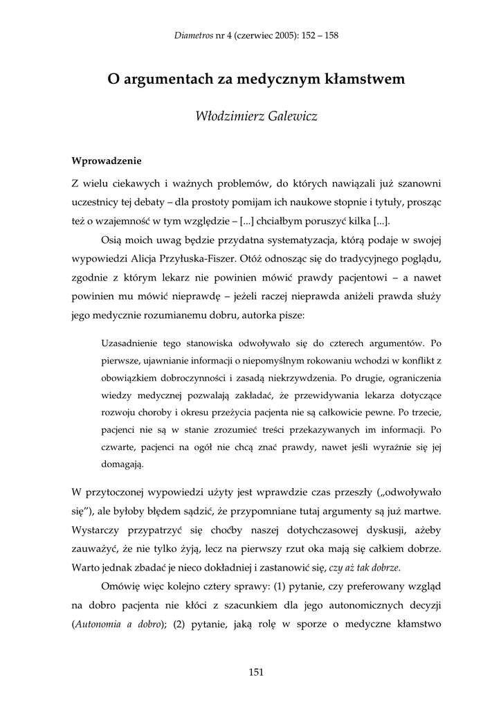 Diametros nr 4 (czerwiec 2005): 152 – 158 O argumentach za medycznym kłamstwem Włodzimierz Galewicz Wprowadzenie Z wielu ciekawych i wa nych problemów, do których nawi zali ju szanowni uczestnicy tej debaty – dla prostoty pomijam ich naukowe stopnie i tytuły, prosz c te o wzajemno w tym wzgl dzie – [...] chciałbym poruszy kilka [...]. Osi moich uwag b dzie przydatna systematyzacja, któr podaje w swojej wypowiedzi Alicja Przyłuska-Fiszer. Otó odnosz c si do tradycyjnego pogl du, zgodnie z którym lekarz nie powinien mówi prawdy pacjentowi – a nawet powinien mu mówi nieprawd – je eli raczej nieprawda ani eli prawda słu y jego medycznie rozumianemu dobru, autorka pisze: Uzasadnienie tego stanowiska odwoływało si do czterech argumentów. Po pierwsze, ujawnianie informacji o niepomy lnym rokowaniu wchodzi w konflikt z obowi zkiem dobroczynno ci i zasad niekrzywdzenia. Po drugie, ograniczenia wiedzy medycznej pozwalaj zakłada , e przewidywania lekarza dotycz ce rozwoju choroby i okresu prze ycia pacjenta nie s całkowicie pewne. Po trzecie, pacjenci nie s w stanie zrozumie czwarte, pacjenci na ogół nie chc tre ci przekazywanych im informacji. Po zna prawdy, nawet je li wyra nie si jej domagaj . W przytoczonej wypowiedzi u yty jest wprawdzie czas przeszły („odwoływało si ”), ale byłoby bł dem s dzi , e przypomniane tutaj argumenty s ju martwe. Wystarczy przypatrzy si cho by naszej dotychczasowej dyskusji, a eby zauwa y , e nie tylko yj , lecz na pierwszy rzut oka maj si całkiem dobrze. Warto jednak zbada je nieco dokładniej i zastanowi si , czy a tak dobrze. Omówi wi c kolejno cztery sprawy: (1) pytanie, czy preferowany wzgl d na dobro pacjenta nie kłóci z szacunkiem dla jego autonomicznych decyzji (Autonomia a dobro); (2) pytanie, jak rol 151 w sporze o medyczne kłamstwo Włodzimierz Galewicz O argumentach za medycznym kłamstwem odgrywa argument z niepewno ci (Kłamstwo i prawdopodobie stwo); (3) pytanie, czy niemówienie prawdy pacjentowi mo e by usprawiedliwiane jego niezdolno ci do zrozumienia tej prawdy (Czy chory zrozumie?); a wreszcie (4) znaczenie argumentu, zgodnie z którym człowiek ci ko chory nie chce zna pełnej prawdy o swojej chorobie (Czy chory chce wiedzie ?). Autonomia a dobro Na lekarzu zastanawiaj cym si nad tym, czy zdradzi choremu prawd o jego chorobie, spoczywaj dwie powinno ci. Z jednej strony ma on obowi zek szanowa autonomiczne decyzje pacjenta, a wi c nie wzbrania mu informacji, które pacjent chce uzyska (ani te nie narzuca mu tych, których pacjent sobie nie yczy). Z drugiej jednak strony lekarz jest zobowi zany troszczy si o dobro pacjenta – w miar mo liwo ci pieszy mu z pomoc , a w ka dym razie nie wyrz dza szkody. Te dwie lekarskie powinno ci w wielu, a mo e nawet w wi kszo ci wypadków nie kłóc si z sob , w niektórych jednak razach popadaj w konflikt i popychaj lekarza do ró nych decyzji. Tak mianowicie dzieje si , ilekro pacjent yczy sobie pozna prawd , która według wszelkiego medycznego prawdopodobie stwa nie wyjdzie mu wcale na dobre – która mu zaszkodzi. W takich razach lekarz musi dokona wyboru, któremu z tych ci cych na nim obowi zków przyzna w danej sytuacji pierwsze stwo: czy wi c kierowa si wzgl dem na jak najlepiej rozumiany interes pacjenta, czy raczej szacunkiem dla autonomicznych postaw jego woli. W tej kwestii mo na by podtrzymywa dwa kra cowo przeciwne pogl dy. Zgodnie ze skrajnym paternalizmem lekarz byłby moralnie zmuszony za ka dym razem wybiera to post powanie, które uwa a za najbardziej zgodne z interesem pacjentów, nawet gdyby nie było ono zgodne z ich wol (jako e pacjent nie zawsze wie, co b dzie dla niego najlepsze); tak na przykład musiałby on ukrywa przed pacjentem prawd , która mogłaby si okaza ponad jego siły, nawet gdyby pacjent lekkomy lnie dopraszał si o ni . Zgodnie ze stanowiskiem diametralnie przeciwnym – mo na by je nazywa czystym autonomizmem – rozstrzygaj ca byłaby natomiast zawsze wolicjonalna postawa pacjenta; lekarz mógłby si wprawdzie stara wpłyn 152 na jego decyzj , Włodzimierz Galewicz O argumentach za medycznym kłamstwem mógłby j próbowa zmieni , jednak e nie miałby jej prawa nigdy zignorowa . Skrajny paternalizm jest dzisiaj pogl dem do niepopularnym (w ocenie Kazimierza Szewczyka wr cz „anachronicznym”). Jednak e równie autonomizm nie cieszy si czysty bynajmniej powszechnym i pełnym uznaniem, co po wiadcza chocia by Janina Suchorzewska pisz c: „Wypowiadam si za autonomi pacjenta, ale nie za wszelk cen i nie wtedy, gdy z punktu widzenia medycyny, przeczy ona rzeczywistym interesom pacjenta”. Cho jednak te dwa diametralnie przeciwne pogl dy – zwłaszcza na elektronicznych łamach naszego czasopisma DIAMETROS – nale y sobie ostro u wiadomi , nie znaczy to, e którykolwiek mo na bez zastrze e uzna . Jest raczej jasne, e pomi dzy tymi skrajno ciami konieczny jest jaki kompromis, i mo na si jedynie zastanawia , jaki. Pewne po rednie czy te pojednawcze rozwi zanie zawiera cytowany ju przez innych dyskutantów artykuł 17. Kodeksu etyki lekarskiej: Wiadomo o rozpoznaniu i złym rokowaniu mo e nie zosta choremu przekazana tylko w przypadku, je li lekarz jest gł boko przekonany, i jej ujawnienie spowoduje bardzo powa ne cierpienie chorego lub inne niekorzystne dla zdrowia nast pstwa; jednak na wyra ne danie pacjenta lekarz powinien udzieli pełnej informacji. Przytoczony fragment zasługuje na pewien komentarz. Gdy w jego drugiej cz ci dopowiada si , e „na wyra ne danie pacjenta lekarz powinien udzieli pełnej informacji”, nale y to niew tpliwie rozumie w ten sposób, e nie powinien on ukrywa tej pełnej informacji nawet w wypadku, o którym mowa jest w cz ci pierwszej: gdy lekarz „jest gł boko przekonany, i jej ujawnienie spowoduje bardzo powa ne cierpienie chorego lub inne niekorzystne dla zdrowia nast pstwa”. Dlaczego wi c ma on prawo – w trosce o dobro pacjenta – nie ujawnia pełnej prawdy o jego chorobie, je eli pac