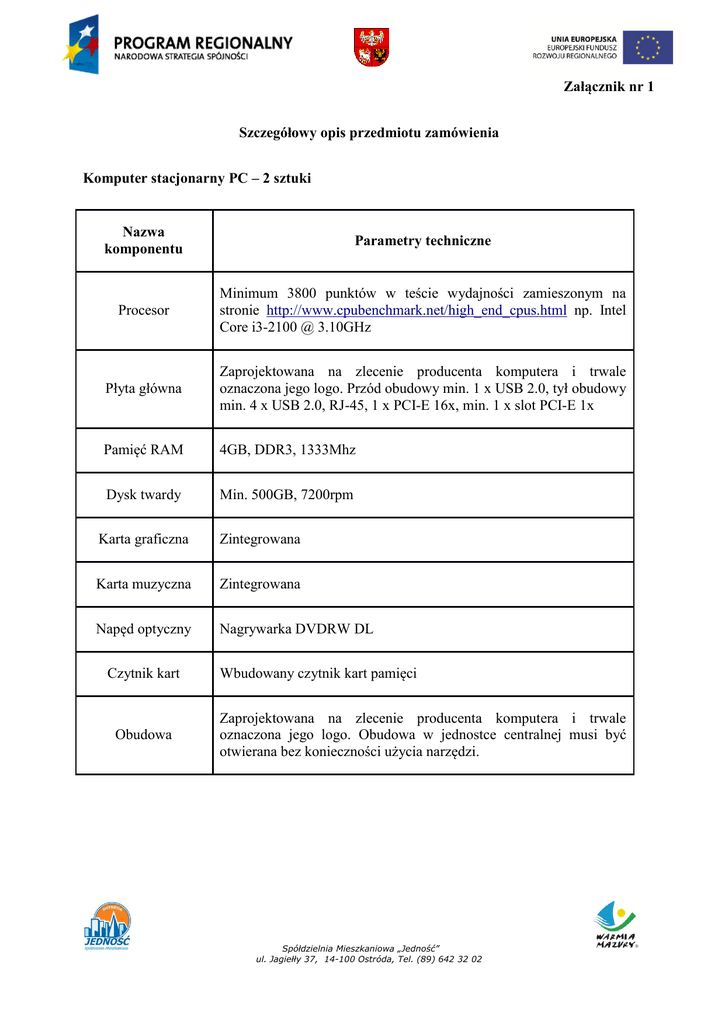 Załącznik nr 1 Szczegółowy opis przedmiotu zamówienia Komputer stacjonarny PC – 2 sztuki Nazwa komponentu Parametry techniczne Procesor Minimum 3800 punktów w teście wydajności zamieszonym na stronie http://www.cpubenchmark.net/high_end_cpus.html np. Intel Core i3-2100 @ 3.10GHz Płyta główna Zaprojektowana na zlecenie producenta komputera i trwale oznaczona jego logo. Przód obudowy min. 1 x USB 2.0, tył obudowy min. 4 x USB 2.0, RJ-45, 1 x PCI-E 16x, min. 1 x slot PCI-E 1x Pamięć RAM 4GB, DDR3, 1333Mhz Dysk twardy Min. 500GB, 7200rpm Karta graficzna Zintegrowana Karta muzyczna Zintegrowana Napęd optyczny Nagrywarka DVDRW DL Czytnik kart Obudowa Wbudowany czytnik kart pamięci Zaprojektowana na zlecenie producenta komputera i trwale oznaczona jego logo. Obudowa w jednostce centralnej musi być otwierana bez konieczności użycia narzędzi. Spółdzielnia Mieszkaniowa „Jedność” ul. Jagiełły 37, 14-100 Ostróda, Tel. (89) 642 32 02 Klawiatura + mysz (zestaw) – 2 sztuki Nazwa komponentu Parametry techniczne Klawiatura Klawiatura USB w układzie polski programisty z blokiem numerycznym Mysz Mysz optyczna USB z rolką Komputery oraz zestaw mysz i klawiatura muszą być objęte minimum 3-letnią gwarancją producenta świadczoną na miejscu u klienta. Monitor – 2 sztuki Nazwa komponentu Typ ekranu Parametry techniczne Ekran ciekłokrystaliczny z aktywną matrycą TFT min. 19” Kąty widzenia (pion/poziom) Min. 160/160 stopni Rozdzielczość nominalna 1440 x 900 Czas reakcji matrycy Powłoka powierzchni ekranu Informacje dodatkowe Max 5ms Antyodblaskowa Wbudowana kamera internetowa 1.3 MPix, wbudowane głośniki Monitory muszą być objęte minimum 2-letnią gwarancją producenta. Spółdzielnia Mieszkaniowa „Jedność” ul. Jagiełły 37, 14-100 Ostróda, Tel. (89) 642 32 02 Oprogramowanie – 2 komplety Nazwa System operacyjny Pakiet biurowy Opis MS Windows 7 Professional PL 64 bit MS Office 2010 PL zawierający: Word, Excel, PowerPoint, OneNote, Outlook Oprogramowanie będzie na stałe zainstalowane na 2 komputerach. Projektor Wi-Fi – 1 sztuka Nazwa komponentu Parametry techniczne Technologia DLP Format obrazu (standard) 4:3 Format obrazu (kompresowany) 16:9 Zoom optyczny 1,1:1 lub lepszy Wielkość wyświetlanego obrazu Min. 23 cale, max 300 Wejścia Inne HDMI, D-Sub Min. jedno gniazdo USB, głośnik, łączność bezprzewodowa wi-fi, torba w komplecie, pilot Spółdzielnia Mieszkaniowa „Jedność” ul. Jagiełły 37, 14-100 Ostróda, Tel. (89) 642 32 02 Ekran elektryczny Nazwa komponentu Rozmiar Parametry techniczne 2 metry x 2 metry Sterowanie Bezprzewodowo – pilot oraz sterowanie za pomocą przełącznika naściennego Mocowanie Do ściany lub sufitu Powierzchnia projekcyjna Materiał 4:3 oraz 16:9 Matt White HD Zasilacz UPS – 2 sztuki Nazwa komponentu Moc rzeczywista Czas podtrzymywania dla obciążenia 100% Parametry techniczne 400 Wat Min. 2 minuty Zimny start Tak Porty komunikacji USB Ilość gniazd wyjściowych Inne Min. 2 szt. Port zabezpieczający linię danych RJ45 Spółdzielnia Mieszkaniowa „Jedność” ul. Jagiełły 37, 14-100 Ostróda, Tel. (89) 642 32 02 Kserokopiarka – 1 sztuka Nazwa komponentu Parametry techniczne Funkcje Wielofunkcyjna czarnobiała kserokopiarka z drukarką sieciową i kolorowym skanerem sieciowym Dwustronny automatyczny podajnik dokumentów Tak Maks. format skanowania A3 Format wydruku A5-A3 Podajnik papieru 2 duże kasety na papier np. A4 i A3 + podajnik boczny Wyświetlacz Duży kolorowy wyświetlacz na pulpicie operatorskim Wyposażenie Zawiera oprzyrządowanie umożliwiające działanie urządzenie bez ponoszenia dodatkowych kosztów np. bęben, toner itp. Oprogramowanie Umożliwiające działanie urządzenia na komputerach wyposażonych w Windows XP / Vista / 7 Inne Stolik pod kopiarkę Do każdego urządzenia musi być dostarczony komplet standardowej dokumentacji dla użytkownika w formie papierowej lub elektronicznej; Do komputerów musi być dostarczony komplet nośników umożliwiających odtworzenie oprogramowania zainstalowanego na komputerze; Wymagany jest sprzęt fabrycznie nowy, nieużywany i spełniający wymagania Komisji Europejskiej dotyczące warunków bezpieczeństwa i ochrony środowiska; Spółdzielnia Mieszkaniowa „Jedność” ul. Jagiełły 37, 14-100 Ostróda, Tel. (89) 642 32 02 Wraz z dostawą wykonawca przekaże zamawiającemu wszystkie płyty instalacyjne, licencje oprogramowania, karty gwarancyjne, instrukcje obsługi i konserwacji oraz certyfikaty; Sprzęt musi posiadać poszczególnych urządzeń. kompletne okablowanie niezbędne Spółdzielnia Mieszkaniowa „Jedność” ul. Jagiełły 37, 14-100 Ostróda, Tel. (89) 642 32 02 do uruchomienia