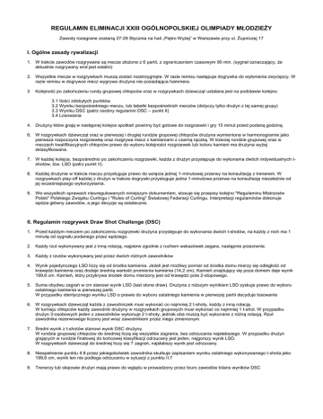 REGULAMIN ELIMINACJI XXIII OGÓLNOPOLSKIEJ OLIMPIADY MŁODZIEŻY Zawody rozegrane zostaną 27-29 Stycznia na hali „Piętro Wyżej” w Warszawie przy ul. Żupniczej 17 I. Ogólne zasady rywalizacji 1. W trakcie zawodów rozgrywane są mecze złożone z 6 partii, z ograniczeniem czasowym 90 min. (sygnał oznaczający, że aktualnie rozgrywany end jest ostatni) 2. Wszystkie mecze w rozgrywkach muszą zostać rozstrzygnięte. W razie remisu następuje dogrywka do wyłonienia zwycięzcy. W razie remisu w dogrywce mecz wygrywa drużyna nie posiadająca hammera. 3 Kolejność po zakończeniu rundy grupowej chłopców oraz w rozgrywkach dziewcząt ustalana jest na podstawie kolejno: 3.1 Ilości zdobytych punktów 3.2 Wyniku bezpośredniego meczu, lub tabelki bezpośrednich meczów (dotyczy tylko drużyn z tej samej grupy) 3.3 Wyniku DSC (patrz osobny regulamin DSC – punkt II) 3.4 Losowania 4. Drużyny które grają w następnej kolejce spotkań powinny być gotowe do rozgrzewki i gry 15 minut przed podaną godziną. 6. W rozgrywkach dziewcząt oraz w pierwszej i drugiej rundzie grupowej chłopców drużyna wymieniona w harmonogramie jako pierwsza rozpoczyna rozgrzewkę oraz rozgrywa mecz z kamieniami z czarną rączką. W trzeciej rundzie grupowej oraz w meczach kwalifikacyjnych chłopców prawo do wyboru kolejności rozgrzewek lub koloru kamieni ma drużyna wyżej sklasyfikowana. 7. W każdej kolejce, bezpośrednio po zakończeniu rozgrzewki, każda z drużyn przystępuje do wykonania dwóch indywidualnych tshotów, tzw. LSD (patrz punkt II). 8. Każdej drużynie w trakcie meczu przysługuje prawo do wzięcia jednej 1-minutowej przerwy na konsultację z trenerem. W rozgrywkach play-off każdej z drużyn w trakcie dogrywki przysługuje jedna 1-minutowa przerwa na konsultację niezależnie od jej wcześniejszego wykorzystania. 9. We wszystkich sprawach nieuregulowanych niniejszym dokumentem, stosuje się przepisy kolejno "Regulaminu Mistrzostw Polski" Polskiego Związku Curlingu i "Rules of Curling" Światowej Federacji Curlingu. Interpretacji regulaminów dokonuje sędzia główny zawodów, a jego decyzje są ostateczne. II. Regulamin rozgrywek Draw Shot Challenge (DSC) 1. Przed każdym meczem po zakończeniu rozgrzewki drużyna przystępuje do wykonania dwóch t-shotów, na każdy z nich ma 1 minutę od sygnału podanego przez sędziego. 2. Każdy rzut wykonywany jest z inną rotacją, najpierw zgodnie z ruchem wskazówek zegara, następnie przeciwnie. 3. Każdy z rzutów wykonywany jest przez dwóch różnych zawodników 4. Wynik pojedynczego LSD liczy się od środka kamienia. Jeżeli jest możliwy pomiar od środka domu mierzy się odległość od krawędzi kamienia oraz dodaje średnią wartość promienia kamienia (14,2 cm). Kamień znajdujący się poza domem daje wynik 199,6 cm. Kamień, który przykrywa środek domu mierzony jest od krawędzi pola 2-stopowego. 5. Suma obydwu zagrań w cm stanowi wynik LSD (last stone draw). Drużyna z niższym wynikiem LSD zyskuje prawo do wyboru ostatniego kamienia w pierwszej partii. W przypadku identycznego wyniku LSD o prawie do wyboru ostatniego kamienia w pierwszej partii decyduje losowanie 6. W rozgrywkach dziewcząt każda z zawodniczek musi wykonać co najmniej 2 t-shoty, każdy z inną rotacją. W turnieju chłopców każdy zawodnik drużyny w rozgrywkach grupowych musi wykonać co najmniej 1 t-shot. W przypadku drużyn 3-osobowych jeden z zawodników wykonuje 2 t-shoty, jednak oba muszą być wykonane z różną rotacją. Rzut zawodnika rezerwowego liczony jest wraz zawodnikiem przez niego zmienionym. 7. Średni wynik z t-shotów stanowi wynik DSC drużyny. W rundzie grupowej chłopców do średniej liczą się wszystkie zagrania, bez odrzucania najsłabszego. W przypadku drużyn grających w rundzie finałowej do końcowej klasyfikacji odrzucany jest jeden, najgorszy wynik LSD. W rozgrywkach dziewcząt do średniej liczy się 7 zagrań, najsłabszy wynik jest odrzucany. 8. Niespełnienie punktu II.6 przez jakiegokolwiek zawodnika skutkuje zapisaniem wyniku ostatniego wykonywanego t-shota jako 199,6 cm, wynik ten nie podlega odrzuceniu w sytuacji z punktu II.7 9. Trenerzy lub skipowie drużyn mają prawo do wglądu w prowadzony przez biuro zawodów bilans wyników DSC III. System rozgrywek dziewcząt – dziesięć drużyn 1. Drużyny rozlosowane są do dwóch grup a i b tak, żeby zespoły z tego samego klubu nie grały ze sobą w grupie 2. W grupach a i b rozgrywa się mecze każdy z każdym, następnie ustalana jest kolejność wg pkt. I.3 3. Dwie najlepsze drużyny z każdej z grup awansują do finałów OOM w kolejności według miejsca w grupie i wyniku DSC 4. Drużyny z 3 miejsc w grupach zajmują miejsca 5-6 w klasyfikacji końcowej OOM według wyników DSC, analogicznie klasyfikowane są zespoły z miejsc 4 (na miejscach 7 i 8) i 5 (na miejscach 9 i 10) IV. System rozgrywek chłopców – osiem drużyn 1. Drużyny rozlosowane są do dwóch grup A i B tak, żeby zespoły z tego samego klubu nie grały ze sobą w grupie 2. W grupach rozgrywa się mecze każdy z każdym. Kolejność w grupach ustalana jest wg pkt. I.3. 3. Zwycięzcy grup awansują do finałów OOM z pierwszego i drugiego miejsca w kolejności wg wyniku DSC 4. Drużyny z czwartych miejsc w grupach zajmują miejsca 7-8 w klasyfikacji końcowej OOM według wyników DSC 5. Drużyny z drugich miejsc w grupach grają z drużynami z trzecich miejsc w drugiej z grup. Zwycięzcy awansują z 3 i 4 miejsca do finałów OOM, przegrani zajmują miejsca 5-6 w klasyfikacji końcowej OOM według miejsca w grupie i wyniku DSC