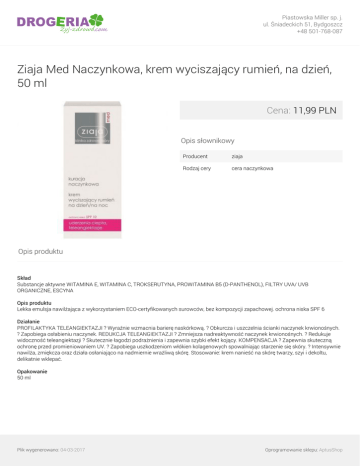 Piastowska Miller sp. j. ul. Śniadeckich 51, Bydgoszcz +48 501-768-087 Ziaja Med Naczynkowa, krem wyciszający rumień, na dzień, 50 ml Cena: 11,99 PLN Opis słownikowy Producent ziaja Rodzaj cery cera naczynkowa Opis produktu Skład Substancje aktywne WITAMINA E, WITAMINA C, TROKSERUTYNA, PROWITAMINA B5 (D-PANTHENOL), FILTRY UVA/ UVB ORGANICZNE, ESCYNA Opis produktu Lekka emulsja nawilżająca z wykorzystaniem ECO-certyfikowanych surowców, bez kompozycji zapachowej. ochrona niska SPF 6 Działanie PROFILAKTYKA TELEANGIEKTAZJI ? Wyraźnie wzmacnia barierę naskórkową. ? Obkurcza i uszczelnia ścianki naczynek krwionośnych. ? Zapobiega osłabieniu naczynek. REDUKCJA TELEANGIEKTAZJI ? Zmniejsza nadreaktywność naczynek krwionośnych. ? Redukuje widoczność teleangiektazji ? Skutecznie łagodzi podrażnienia i zapewnia szybki efekt kojący. KOMPENSACJA ? Zapewnia skuteczną ochronę przed promieniowaniem UV. ? Zapobiega uszkodzeniom włókien kolagenowych spowalniając starzenie się skóry. ? Intensywnie nawilża, zmiękcza oraz działa osłaniająco na nadmiernie wrażliwą skórę. Stosowanie: krem nanieść na skórę twarzy, szyi i dekoltu, delikatnie wklepać. Opakowanie 50 ml Plik wygenerowano: 04-03-2017 Powered by TCPDF (www.tcpdf.org) Oprogramowanie sklepu: AptusShop