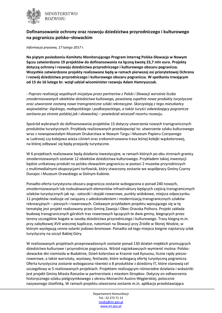 Dofinansowanie ochrony oraz rozwoju dziedzictwa przyrodniczego i kulturowego na pograniczu polsko–słowackim Informacja prasowa, 17 lutego 2017 r. Na piątym posiedzeniu Komitetu Monitorującego Program Interreg Polska-Słowacja w Nowym Sączu zatwierdzono 19 projektów do dofinansowania na łączną kwotę 23,7 mln euro. Projekty dotyczą ochrony i rozwoju dziedzictwa przyrodniczego i kulturowego obszaru pogranicza. Wszystkie zatwierdzone projekty realizowane będą w ramach pierwszej osi priorytetowej Ochrona i rozwój dziedzictwa przyrodniczego i kulturowego obszaru pogranicza. W spotkaniu trwającym od 15 do 16 lutego br. wziął udział wiceminister rozwoju Adam Hamryszczak. - Poprzez realizację wspólnych inicjatyw przez partnerów z Polski i Słowacji wzrośnie liczba zmodernizowanych obiektów dziedzictwa kultowego, powstaną zupełnie nowe produkty turystyczne oraz utworzone zostaną nowe transgraniczne szlaki rekreacyjne. Skorzystają z tego mieszkańcy województw: śląskiego, małopolskiego i podkarpackiego, a także turyści odwiedzający pogranicze zarówno po stronie polskiej jak i słowackiej – powiedział wiceszef resortu rozwoju. Spośród wybranych do dofinansowania projektów 15 dotyczy utworzenia nowych transgranicznych produktów turystycznych. Przykłady realizowanych przedsięwzięć to: utworzenie szlaku kulturowego wraz z nowopowstałym Muzeum Drukarstwa w Nowym Targu i Muzeum Papieru Czerpanego w Ludrovej czy kolejowa wieża ciśnień oraz zrekonstruowana trasa leśnej kolejki wąskotorowej, na której odbywać się będą przejazdy turystyczne. W 6 projektach realizowane będą działania inwestycyjne, w ramach których po obu stronach granicy zmodernizowanych zostanie 12 obiektów dziedzictwa kulturowego. Przykładem takiej inwestycji będzie unikatowy produkt na polsko-słowackim pograniczu w postaci 2 muzeów przyrodniczych z multimedialnymi ekspozycjami torfowisk, który stworzony zostanie we współpracy Gminy Czarny Dunajec i Muzeum Orawskiego w Dolnym Kubinie. Ponadto oferta turystyczna obszaru pogranicza zostanie wzbogacona o ponad 240 nowych, zmodernizowanych lub rozbudowanych elementów infrastruktury będących częścią transgranicznych szlaków turystycznych jak np.: zatoczki i stojaki rowerowe, punkty widokowe, miejsca odpoczynku. 11 projektów realizuje cel związany z udoskonaleniem i modernizacją transgranicznych szlaków rekreacyjnych – pieszych i rowerowych. Ciekawym przykładem projektu wpisującego się w tę tematykę jest projekt realizowany przez Gminę Zawoja i Obec Oravska Polhora. Projekt zakłada budowę transgranicznych górskich tras rowerowych łączących te dwie gminy, biegnących przez tereny szczególnie bogate w zasoby dziedzictwa przyrodniczego i kulturowego. Trasy biegną m.in. przy zabytkowej XVII wiecznej kapliczce, natomiast na Słowacji przy Źródle w Słonej Wodzie, w którym występują cenne solanki jodowo-bromowe. Ponadto od tego miejsca biegnie najstarszy szlak turystyczny na szczyt Babiej Góry. W realizowanych projektach przeprowadzonych zostanie ponad 130 działań miękkich promujących dziedzictwo kulturowe i przyrodnicze pogranicza. Wśród najciekawszych wymienić można: Polskosłowackie dni rzemiosła w Budatinie, Dzień kolarstwa w Krasnie nad Kysucou, liczne rajdy pieszorowerowe, a także warsztaty, wystawy, festiwale, które wzbogacą ofertę turystyczną pogranicza. Oferta turystyczna zostanie wzbogacona również o 8 produktów z dziedziny IT, które stanowią cel szczegółowy w 5 realizowanych projektach. Projektem realizującym różnorodne działania i wskaźniki jest projekt Gminy Miasta Rzeszów w partnerstwie z miastem Stropkov. Dotyczy on odtworzenia historycznego szlaku pielgrzymkowego z okresu Monarchii Austro-Węgierskiej, potocznie nazywanego Józefinką. W ramach projektu utworzona zostanie m.in. aplikacja przedstawiająca Departament Komunikacji Tel.: 22 273 71 13 [email protected] www.mr.gov.pl transformację wizerunku i zabudowy architektonicznej miast od czasów świetności Monarchii AustroWęgierskiej do czasu jej upadku. Szczegółowe opisy wszystkich projektów zostaną opublikowane na stronie internetowej Programu: www.plsk.eu W ramach wybranych do dofinansowania projektów zaangażowanych jest łącznie 63 partnerów polskich i słowackich. Największa liczba partnerów pochodzi z Żylińskiego kraju samorządowego – 27, a po stronie polskiej z Powiatu Nowosądeckiego – 12 partnerów. Duży udział w realizacji projektów ma również Powiat Bielski, z którego pochodzi 8 partnerów. Wśród partnerów wiodących najwięcej pochodzi z Powiatu Nowosądeckiego – 6, Żylińskiego Kraju Samorządowego – 5 oraz Miasta Rzeszów - 3. - Dzisiejsze decyzje umożliwią kontraktację kolejnych projektów w ramach programu Polska-Słowacja i realizację istotnych inicjatyw dla pogranicza polsko-słowackiego. Do tej pory udało się zakontraktować ponad 35% środków programu, a do końca tego roku chcemy, żeby to było 63 %, przy czym scertyfikowanych 9 %– zaznaczył wiceminister A. Hamryszczak. - Przypominam, że naszym zadaniem nie jest wydawanie środków unijnych, lecz ich dobre inwestowanie – dodał. Ważną decyzją podjętą w trakcie posiedzenia było też podjęcie kierunkowej decyzji dot. zmian w procedurach wdrażania programu, mających na celu wprowadzenie uproszczeń dla beneficjentów. W wyniku wprowadzanych zmian beneficjenci zaoszczędzą na czasie i kosztach przygotowania wniosku aplikacyjnego. Proces oceny będzie trwał krócej, co dla beneficjentów będzie oznaczać szybsze uzyskanie decyzji dot. zatwierdzenia projektu. Nowe zasady będą obowiązywać od naboru na projekty drogowe, który ma zostać ogłoszony na początku maja 2017 r. Departament Komunikacji Tel.: 22 273 71 13 [email protected] www.mr.gov.pl
