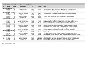 NAJLEPSZE WYNIKI KLUBOWE – SZTAFETY – BASEN 50m kat. wynik basen KATEGORIA 0 (100-119) 02:10,87 50 02:38,83 50 KATEGORIA A (120-159) 02:06,08 50 02:43,06 50 03:05,99 50 03:15,35 50 KATEGORIA B (160-199) 02:40,43 50 02:24,60 50 02:58,74 50 KATEGORIA C (200-239) 02:23,11 50 02:59,13 50 04:24,21 50 03:12,25 50 KATEGORIA D (240-279) 03:33,34 50 03:34,68 50 04:03,09 50 KATEGORIA E (280-319) RP* 07:55,38 50 RP* 07:58,41 50 06:47,52 50 RP* – aktualny rekord Polski konkurencja rok miejsce skład 4X50m dow mix 4x50m zm mix 2010 2010 Gliwice Gliwice Tomczyk Konrad, Mróz Anna, Varela-Machado Lina, Klimek Radosław Klimek Radosław, Figielska Agata, Tomczyk Konrad, Varela-Machado Lina 4X50m dow mężczyzn 4X50m dow mix 4x50m zm kobiet 4x50m zm mix 2010 2008 2010 2008 Gliwice Gdynia Gliwice Gdynia Tomczyk Konrad, Klimek Radosław, Figielski Grzegorz, Zieliński Robert 4x50m dow kobiet 4x50m zm mężczyzn 4x50m zm mix 2010 2009 2009 Gliwice Lublin Gdynia Mróz Anna, Figielska Agata, Varela-Machado Lina, Wawer Matylda Florkiewicz Andrzej, Kuratczyk Paweł, Dudek Krzysztof, Figielski Grzegorz, Wawer Matylda, Pawelec Anna, Figielski Grzegorz, Staruch Wojciech 4X50m dow mężczyzn 4X50m dow mix 4x50m zm kobiet 4x50m zm mężczyzn 2009 2009 2009 2009 Poznań Gdynia Poznań Lublin Staruch Wojciech, Miński Andrzej, Korpetta Wojciech, Figielski Grzegorz Kraśniweska Alina, Trochim Beata, Korpetta Wojciech, Figielski Grzegorz Mioduszewska Barbara, Niemczyk Beata, Goszczycka Jolanta, Figielska Agata Korpetta Wojciech, Filipiak fabian, Czupryn Wojciech, Gryboś Andrzej 4X50m dow mix 4x50m zm mężczyzn 4x50m zm mix 2011 2009 2009 Gliwice Poznań Poznań Lipnicka Maja Gremplicki Andrzej, Staruch Wojciech, Figielski Grzegorz, Filipiak Fabian Mioduszewska Barbara, Niemczyk Beata, Gremplicki Andrzej, Figielski Grzegorz 4x50m dow kobiet 4x50m zm kobiet 4x50m zm mix 2012 2012 2012 Warszawa Warszawa Warszawa Trochim Beata, Mróz Anna, Varela-Machado Lina, Wawer Matylda Lipniacka Maja, Połczyńska Stanisława, Czabańska Barbara, Zielińska Anna Lipniacka Maja, Połczyńska Stanisława, Czabańska Barbara, Zielińska Anna Lipniacka Maja, Połczyńska Stanisława, Filipiak Fabian, Ilgner Artur