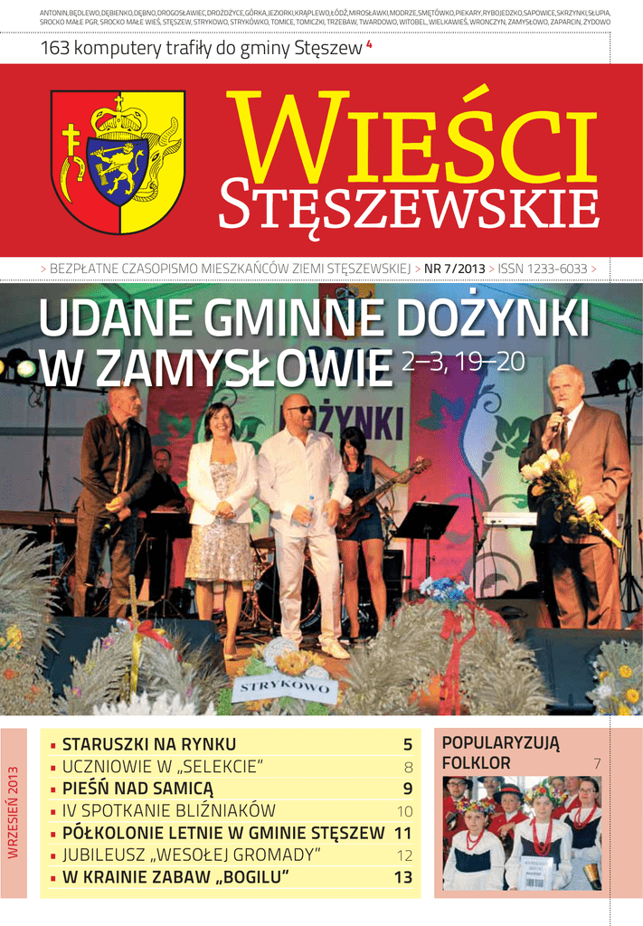 ANTONIN, BĘDLEWO, DĘBIENKO, DĘBNO, DROGOSŁAWIEC, DROŻDŻYCE, GÓRKA, JEZIORKI, KRĄPLEWO, ŁÓDŹ, MIROSŁAWKI, MODRZE, SMĘTÓWKO, PIEKARY, RYBOJEDZKO, SAPOWICE, SKRZYNKI, SŁUPIA, SROCKO MAŁE PGR, SROCKO MAŁE WIEŚ, STĘSZEW, STRYKOWO, STRYKÓWKO, TOMICE, TOMICZKI, TRZEBAW, TWARDOWO, WITOBEL, WIELKAWIEŚ, WRONCZYN, ZAMYSŁOWO, ZAPARCIN, ŻYDOWO 163 komputery trafiły do gminy Stęszew 4 > BEZPŁATNE CZASOPISMO MIESZKAŃCÓW ZIEMI STĘSZEWSKIEJ > NR 7/2013 > ISSN 1233-6033 > WRZESIEŃ 2013 UDANE GMINNE DOŻYNKI 2–3, 19–20 W ZAMYSŁOWIE • STARUSZKI NA RYNKU • UCZNIOWIE W „SELEKCIE” • PIEŚŃ NAD SAMICĄ • IV SPOTKANIE BLIŹNIAKÓW • PÓŁKOLONIE LETNIE W GMINIE STĘSZEW • JUBILEUSZ „WESOŁEJ GROMADY” • W KRAINIE ZABAW „BOGILU” 5 8 9 10 11 12 13 POPULARYZUJĄ FOLKLOR 7 NR 7 / 2013 WRZESIEŃ 2013 2 ŚWIĘTO PLONÓW 3 Dożynki Gminne 2013 odbyły się w Zamysłowie 25 sierpnia odbyły się gminne dożynki. Tegoroczna uroczystość zorganizowana została w Zamysłowie Burmistrz gminy Stęszew dziękuje wszystkim zaangażowanym w pomoc przy organizacji Dożynek Gminnych 2013. Szczególne podziękowania należą się mieszkańcom Zamysłowa, za pięknie przystrojoną wieś oraz właścicielom pojazdów i maszyn, które wzięły udział w paradzie. T boje jak na przykład: Felicita czy Mamma Maria. Na scenie pojawił się także zespół Max Bayer, który zaprosił publiczność do wysłuchania i pośpiewania Polskiej Biesiady. Gwiazdą tegorocznych dożynek był Tercet czyli Kwartet w składzie: Piotr Gąsowski, Robert Rozmus, Hanna Śleszyńska oraz Wojciech Kaleta. Ich kolorowe stroje oraz największe przeboje polskie i zagraniczne przypadły publiczności do gustu o czym świadczyły liczne brawa i uśmiechnięte buzie. Tegoroczne dożynki zakończyły się już tradycyjnie zabawą taneczną przy DJ. Podczas dożynek, oprócz części artystycznej, organizatorzy zapewnili szereg atrakcji dla dzieci i nie tylko. Nie zabrakło częstowania pysznym plackiem, dmuchanych zamków, malowania twarzy, modelowania balonów oraz gier i zabaw prowadzonych przez naszych gości – międzynarodowych wolontariuszy. Uczestnicy dożynek mogli podziwiać także wystawę maszyn rolniczych oraz pięknie przystrojoną miejscowość przez mieszkańców Zamysłowa. RED WRZESIEŃ 2013 Nie mogło zabraknąć również Kapeli Dudziarskiej z Domu Kultury. W trakcie obrzędu nastąpiło uroczyste wręczenie burmistrzowi bochna chleba. Dokonali tego starostowie dożynek: Iwona Szczeszek oraz Adam Borak. Zgodnie z obyczajem, burmistrz poczęstował chlebem wszystkich zgromadzonych. Natomiast na ręce przewodniczącego Mirosława Potrawiaka przekazano wieniec sołectwa Zamysłowo. W tym miejscu dodać należy, że starościna dożynek Iwona Szczeszek z Zamysłowa jest mężatką, matką trzech córek. Wraz z mężem prowadzi 37-hektarowe gospodarstwo rolne, w którym uprawiana jest kukurydza, buraki cukrowe oraz zboże. Hodują bydło opasowe. Starosta dożynek Adam Borak z Witobla to ojciec czterech córek. Prowadzi 59-hektarowe gospodarstwo rolne, w którym uprawia: pszenicę, buraki cukrowe, rzepak oraz cykorię. Hoduje trzodę chlewną oraz bydło opasowe. Kolejnym punktem gminnych dożynek był koncert zespołu Azurro. Duet ten przypomniał widzom największe włoskie prze- NR 7 / 2013 egoroczne gminne dożynki rozpoczęły się ok. godz. 15.30 paradą traktorów, które przejechały korowodem przez całą wioskę. Po paradzie nastąpiło uroczyste przekazanie wieńców dożynkowych burmistrzowi gminy Włodzimierzowi Pinczakowi. Następnie odprawiona została msza święta polowa. Ksiądz proboszcz Zdzisław Błaszczyk poświęcił przyniesione wieńce dożynkowe oraz złożył podziękowania wszystkim rolnikom za zebrane plony i wysiłek włożony w ich pracę. Po mszy św. burmistrz gminy powitał wszystkich zgromadzonych i podziękował tym, którzy w szczególny sposób przyczynili się do zorganizowania niedzielnej uroczystości, a rolnikom życzył wiele wytrwałości i pomyślności. Gości powitał także sołtys Zamysłowa Henryk Olejniczak. Tradycyjną ceremonię dożynkową poprowadził zespół „Modrzanki” z Modrza. Tradycyjne, scenariusz i przyśpiewki na uroczystość święta plonów przygotowała Weronika Polaczek. Artystom na akordeonie przygrywał Kazimierz Gibczyński. 4 AKTUALNOŚCI 163 komputery Urząd Miejski Gminy Stęszew zapobiega cyfrowemu wykluczeniu i dostarcza właśnie komputery beneficjentom programu Przedstawiciele jednostek podległych gminie zestawy komputerowe otrzymali 28 sierpnia. zestawy z oprogramowaniem i dostępem do internetu trafią do mieszkańców gminy, a 40 sztuk do jednostek podległych urzędowi. Wszystko to w ramach działania pod nazwą „Zapewnienie dostępu do szerokopasmowego internetu mieszkańcom gminy Stęszew zagrożonym wykluczeniem cyfrowym”. Celem projektu jest zmniejszenie tego problemu poprzez wyposażenie mieszkańców w sprzęt komputerowy i utrzymanie dostępu do internetu. Program, którego wartość wynosi ok. milion złotych, jest w stu 123 procentach dofinansowany ze środków zewnętrznych. Ostatecznie do projektu zakwalifikowano 123 rodziny spełniające kryteria. Zainteresowanie programem wyrazili mieszkańcy całej gminy. Beneficjenci zostali już przeszkoleni. Zawarto z nimi umowy użyczenia sprzętu na okres do czerwca 2019 roku. Do tego czasu dysponować będą bezpłatnie komputerem i bezpłatnie korzystać z dostępu do internetu. Sygnał zostanie podłączony w okresie około miesiąca od momentu otrzymania laptopa. 28 sierpnia natomiast w Urzędzie Miejskim Gminy Stęszew przekazanych zostało dodatkowych 40 sztuk zestawów komputerowych dla jednostek podległych urzędowi. I tak komputery otrzymały szkoły funkcjonujące na terenie; świetlice wiejskie, biblioteka w Stęszewie i jej filie w Jeziorkach, Strykowie, Będlewie, Trzebawiu, i w Sapowicach, a po jednym zestawie: Muzeum, Dom Kultury