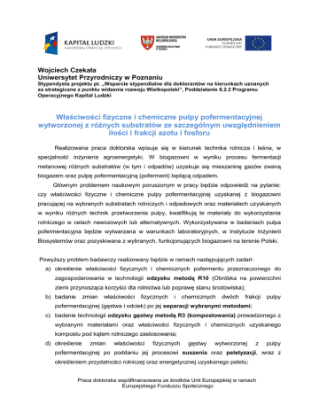 Wojciech Czekała Uniwersytet Przyrodniczy w Poznaniu Stypendysta projektu pt. „Wsparcie stypendialne dla doktorantów na kierunkach uznanych za strategiczne z punktu widzenia rozwoju Wielkopolski”, Poddziałanie 8.2.2 Programu Operacyjnego Kapitał Ludzki Właściwości fizyczne i chemiczne pulpy pofermentacyjnej wytworzonej z różnych substratów ze szczególnym uwzględnieniem ilości i frakcji azotu i fosforu Realizowana praca doktorska wpisuje się w kierunek technika rolnicza i leśna, w specjalność inżynieria agroenergetyki. W biogazowni w wyniku procesu fermentacji metanowej różnych substratów (w tym i odpadów) uzyskuje się mieszaninę gazów zwaną biogazem oraz pulpę pofermentacyjną (poferment) będącą odpadem. Głównym problemem naukowym poruszonym w pracy będzie odpowiedź na pytanie: czy właściwości fizyczne i chemiczne pulpy pofermentacyjnej uzyskanej z biogazowni pracującej na wybranych substratach rolniczych i odpadowych oraz materiałach uzyskanych w wyniku różnych technik przetworzenia pulpy, kwalifikują te materiały do wykorzystania rolniczego w celach nawozowych lub alternatywnych. Wykorzystywana w badaniach pulpa pofermentacyjna będzie wytwarzana w warunkach laboratoryjnych, w Instytucie Inżynierii Biosystemów oraz pozyskiwana z wybranych, funkcjonujących biogazowni na terenie Polski. Powyższy problem badawczy realizowany będzie w ramach następujących zadań: a) określenie właściwości fizycznych i chemicznych pofermentu przeznaczonego do zagospodarowania w technologii odzysku metodą R10 (Obróbka na powierzchni ziemi przynosząca korzyści dla rolnictwa lub poprawę stanu środowiska); b) badanie zmian właściwości fizycznych i chemicznych dwóch frakcji pulpy pofermentacyjnej (gęstwa i odciek) po jej separacji wybranymi metodami; c) badanie technologii odzysku gęstwy metodą R3 (kompostowania) prowadzonego z wybranymi materiałami oraz właściwości fizycznych i chemicznych uzyskanego kompostu pod kątem rolniczego zastosowania; d) określenie zmian właściwości fizycznych gęstwy wytworzonej z pulpy pofermentacyjnej po poddaniu jej procesowi suszenia oraz peletyzacji, wraz z określeniem przydatności rolniczej oraz energetycznej uzyskanego peletu; Praca doktorska współfinansowana ze środków Unii Europejskiej w ramach Europejskiego Funduszu Społecznego e) analiza zmian właściwości fizycznych i chemicznych pulpy pofermentacyjnej poddanej różnym technikom przetworzenia i porównanie parametrów uzyskanych materiałów z nieprzetworzoną pulpą; f) analiza ekonomiczna różnych technik rolniczego zagospodarowania pulpy pofermentacyjnej. Zasób wiedzy dotyczący przedmiotu badań jest stosunkowo niewielki. Głównym powodem tego stanu jest stosunkowo mała liczba działających biogazowni w kraju, czyli 39 jednostek. Biorąc pod uwagę planowane przez rząd wybudowanie prawie 2,5 tys. dużych biogazowni do roku 2020, skala problemu zagospodarowania tego odpadu będzie w Polsce duża. Dlatego też warte uwagi są nie tylko badania z zakresu wydajności biogazu, ale również badania nad oceną wartości nawozowej odmiennych rodzajów pulpy i materiałów uzyskanych w wyniku różnych technik jej przetworzenia. Województwo Wielkopolskie to region o dużym potencjale gospodarczym, przyrodniczym i ludzkim. Odpowiednie wykorzystanie silnych stron regionu pozwoli mu na większą stabilność gospodarczą oraz systematyczny rozwój. Przedsiębiorstwa wprowadzające na rynek produkty z zakresu wyposażenia biogazowni, gospodarki odpadami z produkcji biogazu czy kompleksowo budujące i uruchamiające instalację są kluczowym elementem w procesach podnoszenia konkurencyjności regionu. Dotyczy to zarówno szczebla krajowego jak i międzynarodowego. By jednak mogło dojść do ukierunkowanego rozwoju regionu niezbędnym elementem jest ciągły rozwój przedsiębiorstw oraz stosowanie nowych technologii, które są opłacalne ekonomicznie a jednocześnie uzasadnione ze środowiskowego punktu widzenia. W przypadku poznania właściwości fizycznych i chemicznych pulp pochodzących z różnych instalacji, i produkowanych z różnych odpadów możliwym będzie w bardziej precyzyjny sposób określić preferowany sposób ich zagospodarowania. Wyniki badań oprócz naukowego charakteru będą mogły również zostać wykorzystane przez przedsiębiorstwa. Dotyczy to np. produkcji sit i zestawów do separacji, specjalnych instalacji do deszczowania pól frakcją ciekłą pofermentu. Uzyskana gęstwa może być wykorzystana do produkcji kompostu, suszu (nawóz certyfikowany) lub jako biopaliwo stałe – pelet, co daje szerokie spektrum wdrażania technologii przez istniejące lub nowopowstałe firmy. Praca doktorska współfinansowana ze środków Unii Europejskiej w ramach Europejskiego Funduszu Społecznego