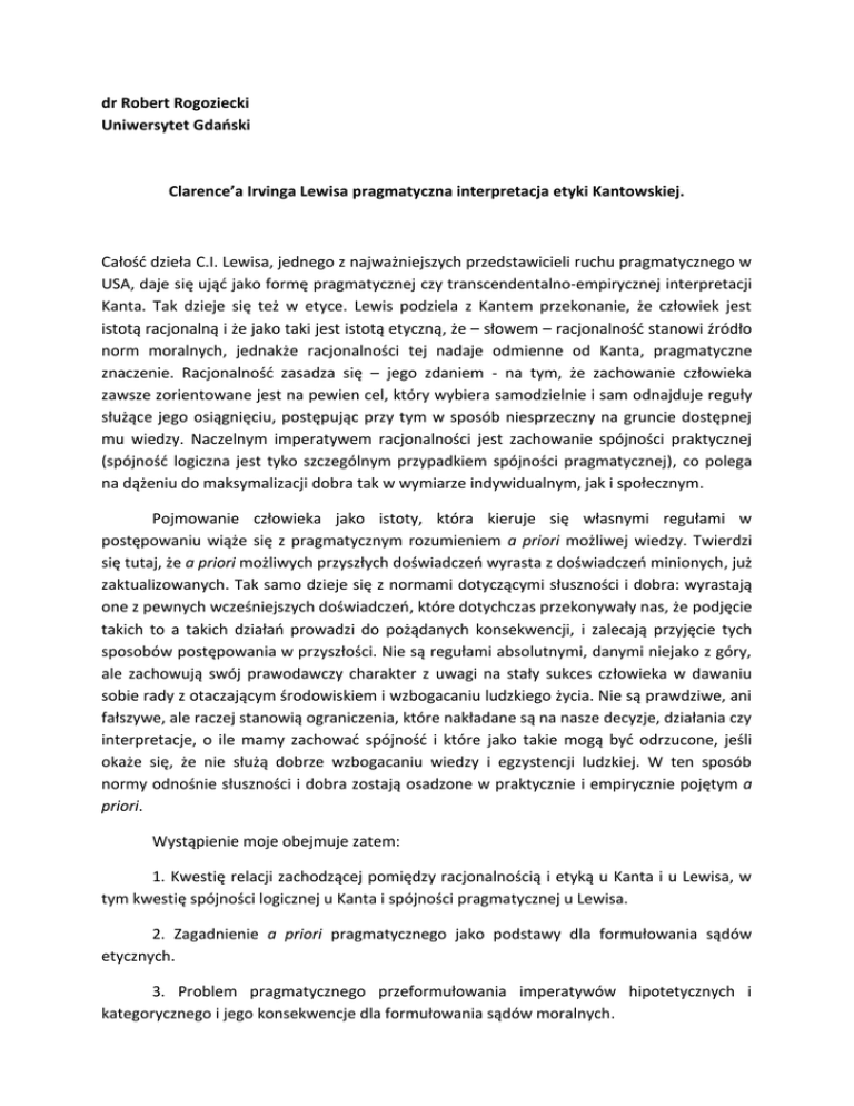 dr Robert Rogoziecki Uniwersytet Gdański Clarence’a Irvinga Lewisa pragmatyczna interpretacja etyki Kantowskiej. Całośd dzieła C.I. Lewisa, jednego z najważniejszych przedstawicieli ruchu pragmatycznego w USA, daje się ująd jako formę pragmatycznej czy transcendentalno-empirycznej interpretacji Kanta. Tak dzieje się też w etyce. Lewis podziela z Kantem przekonanie, że człowiek jest istotą racjonalną i że jako taki jest istotą etyczną, że – słowem – racjonalnośd stanowi źródło norm moralnych, jednakże racjonalności tej nadaje odmienne od Kanta, pragmatyczne znaczenie. Racjonalnośd zasadza się – jego zdaniem - na tym, że zachowanie człowieka zawsze zorientowane jest na pewien cel, który wybiera samodzielnie i sam odnajduje reguły służące jego osiągnięciu, postępując przy tym w sposób niesprzeczny na gruncie dostępnej mu wiedzy. Naczelnym imperatywem racjonalności jest zachowanie spójności praktycznej (spójnośd logiczna jest tyko szczególnym przypadkiem spójności pragmatycznej), co polega na dążeniu do maksymalizacji dobra tak w wymiarze indywidualnym, jak i społecznym. Pojmowanie człowieka jako istoty, która kieruje się własnymi regułami w postępowaniu wiąże się z pragmatycznym rozumieniem a priori możliwej wiedzy. Twierdzi się tutaj, że a priori możliwych przyszłych doświadczeo wyrasta z doświadczeo minionych, już zaktualizowanych. Tak samo dzieje się z normami dotyczącymi słuszności i dobra: wyrastają one z pewnych wcześniejszych doświadczeo, które dotychczas przekonywały nas, że podjęcie takich to a takich działao prowadzi do pożądanych konsekwencji, i zalecają przyjęcie tych sposobów postępowania w przyszłości. Nie są regułami absolutnymi, danymi niejako z góry, ale zachowują swój prawodawczy charakter z uwagi na stały sukces człowieka w dawaniu sobie rady z otaczającym środowiskiem i wzbogacaniu ludzkiego życia. Nie są prawdziwe, ani fałszywe, ale raczej stanowią ograniczenia, które nakładane są na nasze decyzje, działania czy interpretacje, o ile mamy zachowad spójnośd i które jako takie mogą byd odrzucone, jeśli okaże się, że nie służą dobrze wzbogacaniu wiedzy i egzystencji ludzkiej. W ten sposób normy odnośnie słuszności i dobra zostają osadzone w praktycznie i empirycznie pojętym a priori. Wystąpienie moje obejmuje zatem: 1. Kwestię relacji zachodzącej pomiędzy racjonalnością i etyką u Kanta i u Lewisa, w tym kwestię spójności logicznej u Kanta i spójności pragmatycznej u Lewisa. 2. Zagadnienie a priori pragmatycznego jako podstawy dla formułowania sądów etycznych. 3. Problem pragmatycznego przeformułowania imperatywów hipotetycznych i kategorycznego i jego konsekwencje dla formułowania sądów moralnych.
