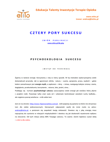 Edukacja Talenty Inwestycje Terapie Opieka www.etito.pl trener: [email protected] CZTERY PORY SUKCESU ZBIÓR PUBLIKACJI www.etito.pl/4b.php PSYCHOEKOLOGIA ( W S T Ę P D O SUKCESU T R E N I N G U ) Żyjemy w świecie energii. Korzystamy z niej w różny sposób. W tej metodzie wykorzystujemy wiele doświadczeń przyrody. Jak w ogromnym silniku natury – ssanie, sprężanie, praca, wydech – gdzie kołem zamachowym jest energia myśli, a zapłonem – iskrą – żniwa, następują kolejne zmiany: sianie, doglądanie, przekształcanie, korzystanie… wiosna, lato, jesień, zima… Poddając się nurtowi psychoekologii sukcesu zaoszczędzisz wiele energii jak wioślarz który płynie z prądem rzeki. Pozostaje tylko znać swój cel i właściwie kontrolować wiosłami ruchy kadłuba… ale najpierw poznaj wioślarza – zrób sobie test. Jest on na stronie: http://www.16personalities.com/pl . Jeśli pojawią się pytania na które nie otrzymasz tam dla siebie jednoznacznych, klarownych odpowiedzi wyślij do mnie maila na adres: [email protected], a postaram się zaspokoić twoją ciekawość. Dowiesz się z jaką energią masz najczęściej do czynienia w relacjach międzyludzkich i dowiesz się jak doskonalić wywieranie wpływu na otoczenie. Od tych relacji zależy 80% Twojego sukcesu. To ważne. Zanim będziesz czytać dalej – zrób to dla siebie. Obliczono, że ciało człowieka w sposób naturalny powinno żyć około 120 lat. Zatrucie środowiska na które nie masz indywidualnego wpływu zabiera Ci 20 lat – rozumiem ekologów, jest o co walczyć ! Pozostałe 100 lat to cztery kwartały w czasie których warto żyć w zgodzie naturalnym rytmem. Pierwsze 25 lat – zgodnie z energetyką wiosny – zasiewaj ziarno wiedzy, dbaj by w zdrowym ciele rozwijał się zdrowy duch, bądź ciekawym świata jak wartki górski strumień. Następne 25 lat przepracuj – jak w letnim pocie czoła – z pełnym zaangażowaniem, przewidywaniem skutków i w skupieniu. Jesień Twojego życia, to nie poetyckie szuranie nogami po liściach i emeryturka, tylko przekształcanie dotychczasowego dorobku w celu zwielokrotnienia go. Przez ostatnie 25 lat korzystaj i wypoczywaj tak jak to tylko możliwe dla maksymalnego wyzyskania zasobów jakie stworzyłeś. O wszystkie elementy zasobów składających się na Twój potencjał jakie zaniedbasz do pięćdziesiątego roku życia, będziesz musiał ciężką pracą i zaangażowaniem zadbać po pięćdziesiątce. Zaś wszystkie te, o które zadbasz do pięćdziesiątki – w tym zdrowe ciało i umysł, siły wolicjonalne, środki materialne, partnerzy i przyjaciele – zadbają o Ciebie w Twoim drugim półwieczu na pewno. Cały ten trening został zbudowany zgodnie z rytmem natury. Jego celem jest wykorzystanie jej praw by najniższym poziomem wydatkowanej energii uzyskać najwyższy poziom sukcesu. Dział I, to praktyczny poradnik korzystania z zawartej tu wiedzy. Jego zadaniem jest sianie zainteresowania tym tematem wśród odbiorców. Cztery pory roku jako kolejne fazy dnia pozwalają nam wejść w rytm i z właściwym nastawieniem uczestniczyć w zaplanowanych zajęciach. Dział II, to słownik pojęć zapisanych tłustym drukiem, wyjaśniający co jako autor mam na myśli. Są tam też krótkie przepisy i porady ułatwiające doglądanie Twoich działań. Zalecam zapoznanie się z tym metajęzykiem gdyż opisy są często dalekie od encyklopedycznych. Dział III, to szkice prelekcji, opisy treningów i artykuły w których zajmuję się konkretnymi tematami. Mają one ułatwić przekształcanie nabytej tu wiedzy na grunt praktyczny, a że należę do ludzi leniwych to i tu piszę tak, by nie męczyć Twoich oczu i nie zabierać Ci czasu. Dział IV, to odpowiedzi na pytania osób które zdecydowały się na korzystanie z tego treningu, a także ich własne doświadczenia, spostrzeżenia i uwagi. Na zakończenie podaję prawa i zasady sukcesu, a dla osób lubiących poszerzać swoją wiedzę, zalecane w treści lektury i autorów. Taka konstrukcja tego treningu pomaga szybko znajdować potrzebne w danej chwili treści, zaś dzięki spójności z porami roku, ułatwi Tobie uwalnianie Twojej magicznej mocy . Ten bogaty zbiór informacji to trening fizyczny, trening emocjonalny i trening mentalny w jednym. Jednoczesne zwrócenie Twojej uwagi na równoważne traktowanie ciała, umysłu i stanu ducha, to dopiero początek tego co możesz zrobić dla harmonijnego rozwoju osobistego. Życie jest jak podróż pociągiem. Kiedy się urodziłeś, wsiadłeś do tego pociągu. Pasażerowie opowiedzieli Ci o swoich doświadczeniach, więc dowiedziałeś się wiele – otrzymałeś bogaty zbiór informacji, ale sam tego nie doświadczyłeś – nie masz ich wiedzy. Tysiące ludzi mogło by opowiadać Tobie o czekoladzie, ale jej smak poznasz dopiero wtedy, gdy włożysz ją do swoich ust. Nadszedł czas życia własnym życiem – czas doświadczania. Najlepszy efekt uzyskasz wprowadzając w swoje życie rytuały. To wspaniały prezent od naszych praprzodków. Dzisiaj, po zmianach nazw spowodowanych chrystianizacją wyznaczniki pór roku: Wielkanoc, Dzień Świętojański, dożynki czy Boże Narodzenie to tylko namiastka całego bogactwa rytuałów okolicznościowych i codziennych. Od tego jak skutecznie będziesz wprowadzał wybrane przez siebie, zależy od kiedy będziesz takim jakim chcesz być i jaki chcesz mieć wpływ na rodzinę, przyjaciół i środowisko zawodowe. Zamiast marnować czas i energię ćwicząc na sobie metodą prób i błędów, warto zastosować się do sprawdzonych i potwierdzonych naukowo elementów tego treningu. Wprowadzając nie więcej niż jeden nowy rytuał miesięcznie, zacznij już teraz swoją drogę do sukcesu. Z całej proponowanej tu gamy, tylko jeden! – kolejny w następnym miesiącu! Możesz płynąć pod prąd, a możesz – w zgodzie z naturą – z prądem. Wybór zawsze należy do Ciebie. Czy wypełniłeś test i skopiowałe