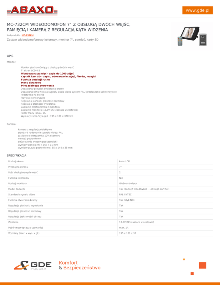 www.gde.pl MC-732CM WIDEODOMOFON 7" Z OBSŁUGĄ DWÓCH WEJŚĆ, PAMIĘCIĄ I KAMERĄ Z REGULACJĄ KĄTA WIDZENIA Kod produktu: MC-732CM Zestaw wideodomofonowy kolorowy, monitor 7", pamięć, karty SD OPIS Monitor: Monitor głośnomówiący z obsługą dwóch wejść 7" ekran LCD 4:3 Wbudowana pamięć - zapis do 1000 zdjęć Czytnik kart SD - zapis / odtwarzanie zdjęć, filmów, muzyki Funkcja detekcji ruchu Menu ekranowe Pilot zdalnego sterowania Dodatkowy przycisk otwierania bramy Dodatkowe dwa wejścia sygnału audio-video system PAL (przełączane sekwencyjnie) Podstawka na biurko Przyciski sensoryczne Regulacja jasności, głośności rozmowy Regulacja głośności wywołania Zasilanie elektrozamka z monitora Zasilanie monitora: 13,5V DC (zasilacz w zestawie) Pobór mocy : max. 1A Wymiary (szer./wys./gł.) : 195 x 131 x 37(mm) Kamera: kamera z regulacją obiektywu standard nadawania sygnału video: PAL zasilanie elektrozamka 12V z kamery montaż podtynkowy doświetlenie w nocy (podczerwień) wymiary panela: 97 x 167 x 11 mm wymiary puszki podtynkowej: 85 x 144 x 38 mm SPECYFIKACJA Rodzaj ekranu kolor LCD Przekątna ekranu 7" Ilość obsługiwanych wejść 2 Funkcja interkomu Nie Rodzaj monitora Głośnomówiący Moduł pamięci Tak (pamięć wbudowana + obsługa kart SD) Standard sygnału video PAL / NTSC Funkcja otwierania bramy Tak (styk NO) Regulacja głośności wywołania Tak Regulacja głośności rozmowy Tak Regulacja jaskrawości obrazu Tak Zasilanie 13,5V DC (zasilacz w zestawie) Pobór mocy (praca / czuwanie) max. 1A Wymiary (szer. x wys. x gł.) 195 x 131 x 37