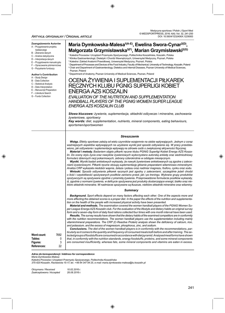 A Medycyna sportowa / Polish J Sport Med © MEDSPORTPRESS, 2016; 4(4); Vol. 32, 241-250 DOI: 10.5604/1232406X.1229083 /O Zaangażowanie Autorów A – Przygotowanie projektu badawczego B – Zbieranie danych C – Analiza statystyczna D – Interpretacja danych E – Przygotowanie manuskryptu F – Opracowanie piśmiennictwa G – Pozyskanie funduszy Author’s Contribution A – Study Design B – Data Collection C – Statistical Analysis D – Data Interpretation E – Manuscript Preparation F – Literature Search G – Funds Collection Maria Dymkowska-Malesa1(A-E), Ewelina Swora-Cynar2(D), Małgorzata Grzymisławska3(F), Marian Grzymisławski2(G) Katedra Procesów i Urządzeń Przemysłu Spożywczego, Politechnika Koszalińska, Koszalin, Polska Klinika Gastroenterologii, Dietetyki i Chorób Wewnętrznych, Uniwersytet Medyczny, Poznań, Polska 3 Katedra i Zakład Anatomii Prawidłowej, Uniwersytet Medyczny, Poznań, Polska 1 Department of Processes and Devices of the Food Industry, Faculty of Mechanical, University of Technology, Koszalin, Poland 2 Chair and Department of Gastroenterology, Dietetics and Internal Diseases, Poznan University of Medical Sciences, Poznan, Poland 3 Department of Anatomy, Poznan University of Medical Sciences, Poznan, Poland 1 2 OCENA ŻYWIENIA I SUPLEMENTACJI PIŁKAREK RĘCZNYCH KLUBU PGNIG SUPERLIGI KOBIET ENERGA AZS KOSZALIN EVALUATION OF THE NUTRITION AND SUPPLEMENTATION HANDBALL PLAYERS OF THE PGNIG WOMEN SUPER LEAGUE ENERGA AZS KOSZALIN CLUB Słowa kluczowe: żywienie, suplementacja, składniki odżywcze i mineralne, zachowania żywieniowe, sportowcy Key words: diet, supplementation, nutrients, mineral components, eating behaviours, sportsmen/sportswomen Streszczenie Wstęp. Efekty sportowe zależą od wielu czynników wzajemnie na siebie wpływających. Jednym z coraz ważniejszych aspektów wpływających na uzyskane wyniki jest sposób odżywiania się. W pracy przedstawiono, jak odżywianie i suplementacja wpływają na zdrowie osób o zwiększonej aktywności fizycznej. Materiał i metody. Badaniem objęto piłkarki ręczne klubu PGNiG Superligi Kobiet Energa AZS Koszalin. Do oceny stylu życia oraz nawyków żywieniowych wykorzystano autorską ankietę oraz siedmiodniowy formularz dziennych racji pokarmowych, zebrany czterokrotnie w odstępie miesięcznym. Wyniki. Wyniki badań ankietowych wykazały, że nawyki żywieniowe ankietowanych są zgodne z zaleceniami żywieniowymi. Piłkarki ręczne stosują suplementację głównie preparatami witaminowo-mineralnymi. Analiza CRP wykazała niedobór wapnia, żelaza i potasu oraz nadmiar magnezu, fosforu, cynku oraz sodu. Wnioski. Sposób odżywiania piłkarek ręcznych jest zgodny z zaleceniami, szczególnie jeżeli chodzi o ilość i częstotliwość spożywanych posiłków zarówno przed, jak i po treningu. Wybrane grupy produktów spożywczych są spożywane zgodnie z piramidą żywienia. Przeprowadzone formularze posiłków wykazały, iż, zgodnie z normami żywienia, w deficycie spożywana jest produkty dostarczające energii, białko oraz niektóre składniki mineralne. W nadmiarze spożywane są tłuszcze, niektóre składniki mineralne oraz witaminy. Summary Word count: Tables: Figures: References: 7692 0 3 22 Background. Sport effects depend on many factors affecting each other. One of the aspects more and more affecting the obtained scores is a proper diet. In the paper the effects of the nutrition and supplementation on the health of the people with increased physical activity have been presented. Material and methods. The examination covered the women handball players of the PGNiG Women Super League Energa AZS Koszalin club. For the evaluation of the lifestyle and dietary habits an original survey form and a seven-day form of daily food rations collected four times with one month interval have been used. Results. The survey results have shown that the dietary habits of the examined competitors are in conformity with the nutrition recommendations. The women handball players use the supplementation including mainly vitamin/mineral preparations. The CRP (C-Reactive Protein) analysis shown the deficiency of calcium, iron, and potassium, and the excess of magnesium, phosphorus, zinc, and sodium. Conclusions. The diet of the women handball players is in conformity with the recommendations, particularly as it comes to the quantity and frequency of consumed meals both before and after training. The selected groups of foodstuffs are consumed in accordance with diet pyramid. Analysed meal forms have shown that, in conformity with the nutrition standards, energy foodstuffs, proteins, and some mineral components are consumed insufficiently, whereas fats, some mineral components and vitamins are eaten in excess. Adres do korespondencji / Address for correspondence Maria Dymkowska-Malesa Katedra Procesów i Urządzeń Przemysłu Spożywczego, Politechnika Koszalińska 375-620 Koszalin, Racławicka 15-17, tel.: +48 94 347 84 25, e-mail: [email protected] Otrzymano / Received Zaakceptowano / Accepted 10.02.2016 r. 28.08.2016 r. 241 Dymkowska-Malesa M. i wsp. Żywienie i suplementacja piłkarek ręcznych Wstęp Background Sposób żywienia to jeden z kluczowych detali stylu życia, który oddziałuje na zdrowie człowieka i jego właściwe funkcjonowanie. Dla osób uprawiających sport, sposób żywienia odgrywa większą rolę i przyczynia się do ich wyników [1]. Zdrowe odżywianie może zwiększyć efektywność treningową oraz polepszyć osiągane wyniki. Stosowanie się do zasad właściwego żywienia jest podstawowym zadaniem osób realizujących procesy szkolenia treningowego, zawody czy odnowę potreningową. W obecnych czasach, kiedy w sporcie wysokokwalifikowanym poziom wyszkolenia jest bardzo podobny, żywienie jest czynnikiem, który może decydować o końcowym zwycięstwie. Uprawianie sportu cechuje się dużym natężeniem pracy, co powoduje zwiększenie się wydatków energetycznych [2,3