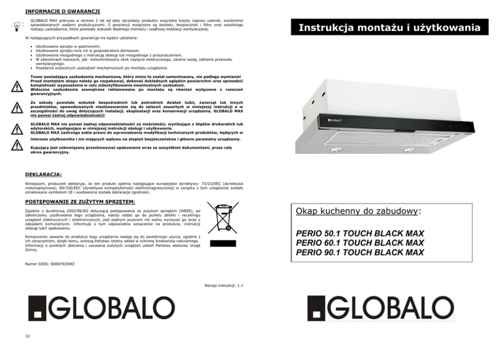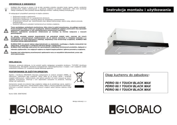 INFORMACJE O GWARANCJI GLOBALO MAX pokrywa w okresie 2 lat od daty sprzedaży produktu wszystkie koszty napraw usterek, ewidentnie spowodowanych wadami produkcyjnymi. Z gwarancji wyłączone są żarówki, bezpieczniki i filtry oraz wszelkiego rodzaju uszkodzenia, które powstały wskutek błędnego montażu i wadliwej instalacji wentylacyjnej. Instrukcja montażu i użytkowania W następujących przypadkach gwarancja nie będzie udzielana: Użytkowanie sprzętu w gastronomii. Użytkowanie sprzętu inne niż w gospodarstwie domowym. Użytkowania niezgodnego z instrukcją obsługi lub niezgodnego z przeznaczeniem. W zdarzeniach losowych, jak: niekontrolowany skok napięcia elektrycznego, zalanie wodą, zatkanie przewodu wentylacyjnego. Powstania widocznych uszkodzeń mechanicznych po montażu urządzenia. Towar posiadający uszkodzenia mechaniczne, który mimo to został zamontowany, nie podlega wymianie! Przed montażem okapu należy go rozpakować, dokonać dokładnych oględzin powierzchni oraz sprawdzić kompletność wyposażenia w celu zidentyfikowania ewentualnych uszkodzeń. Widoczne uszkodzenia zewnętrzne reklamowane po montażu są również wyłączone z roszczeń gwarancyjnych. Za szkody powstałe wskutek bezpośrednich lub pośrednich działań ludzi, zwierząt lub innych przedmiotów, spowodowanych niestosowaniem się do zaleceń zawartych w niniejszej instrukcji a w szczególności do uwag dotyczących instalacji, eksploatacji oraz konserwacji urządzenia, GLOBALO MAX nie ponosi żadnej odpowiedzialności! GLOBALO MAX nie ponosi żadnej odpowiedzialności za nieścisłości, wynikające z błędów drukarskich lub edytorskich, występujące w niniejszej instrukcji obsługi i użytkowania. GLOBALO MAX zastrzega sobie prawo do wprowadzania modyfikacji technicznych produktów, będących w interesie użytkownika i nie mających wpływu na stopień bezpieczeństwa i główne parametry urządzenia. Kupujący jest zobowiązany przechowywać opakowanie wraz ze wszystkimi dokumentami, przez cały okres gwarancyjny. DEKLARACJA: Niniejszym, producent deklaruje, że ten produkt spełnia następujące europejskie dyrektywy: 73/23/EEC (dyrektywa niskonapięciowa); 89/336/EEC (dyrektywa kompatybilności elektromagnetycznej) w związku z tym urządzenie zostało oznakowane symbolem CE i wystawiona została deklaracja zgodności. POSTĘPOWANIE ZE ZUŻYTYM SPRZĘTEM: Okap kuchenny do zabudowy: Zgodnie z dyrektywą 2002/96/EG dotyczącą postępowania ze zużytym sprzętem (WEEE), po zakończeniu użytkowania tego urządzenia, należy oddać go do punktu zbiórki i recyklingu urządzeń elektrycznych i elektronicznych, pod żadnym pozorem nie wolno wyrzucać go wraz z odpadami komunalnymi. Informuje o tym odpowiednie oznaczenie na produkcie, instrukcji obsługi lub/i opakowaniu. PERIO 50.1 TOUCH BLACK MAX PERIO 60.1 TOUCH BLACK MAX PERIO 90.1 TOUCH BLACK MAX Komponenty zawarte do produkcji tego urządzenia nadają się do powtórnego użycia, zgodnie z ich oznaczeniem, dzięki temu, wnoszą Państwo istotny wkład w ochronę środowiska naturalnego. Informacji o punktach zbierania i usuwania zużytych urządzeń udzieli Państwu właściwy Urząd Gminy. Numer GIOS: E0007925WZ Wersja instrukcji: 1.1 12 Spis treści Wymiary i dane techniczne: Serwis 4 Wskazówki dla poprawnej instalacji okapu Wskazania bezpieczeństwa przy użytkowaniu 5 5 Wymiana lampy halogenowej Wyjęcie metalowego filtra Czyszczenie metalowego filtra przeciwtłuszczowego 6 6 6 Konserwacja i czyszczenie Okresy międzykonserwacyjne Czyszczenie okapu Napięcie: 220 – 240V Częstotliwość: 50 Hz Moc silnika: 160 W 7 7 7 Ilość stopni prędkości 3 Obsługa okapu Panel obsługi Włączanie i wyłączanie silnika okapu Regulacja prędkości Włączanie i wyłączanie oświetlenia 8 8 8 8 8 Moc maksymalna: 230 W Klasa bezpieczeństwa: I Wydajność: 420 m3/h* Średnica wylotu: fi 120mm Montaż okapu 9 Wyjęcie filtra z węglem aktywnym 10 Wymiary i dane techniczne 11 Informacje o gwarancji Deklaracja Postępowanie ze zużytym sprzętem 12 12 12 Oświetlenie: 2 x 35 W (Żarówka halogenowa 230V/35W/GU 10 ew. GZ 10) *Błędne podłączenie przewodu wentylacyjnego powoduje spadek wydajności urządzenia, każde załamanie rury o 90 stopni powoduje spadek wydajności o około 10%. Każdy dodatkowy metr rury lub płaskiego kanału powoduje spadek wydajności o kolejne 5%. Zredukowanie średnicy przewodu poprzez redukcję pola przekroju poprzecznego - powoduje spadek wydajności urządzenia. Aby zachować fabryczne parametry urządzenia, należy tak planować montaż aby nie zmniejszać pola powierzchni wylotu turbiny okapu. Zamontowanie filtra węglowego w okapie obniża jego wydajność o około 25-30%. Każde stłumienie pracy silnika, spowoduje jego przyśpieszenie oraz zwiększenie głośności pracy! W ekstremalnych przypadkach, przy długotrwałej pracy na najwyższym stopniu prędkości i przy znacznie stłumionym ciągu, może doprowadzić nawet do spalenia silnika elektrycznego okapu. 2 11 Wymiana filtra z węglem aktywnym Typ filtra ASC 200 (tylko w trybie pochłaniacza z wewnętrznym obiegiem powietrza). ● Wyjąć wtyczkę z sieci względnie wyłączyć bezpiecznik w domowej instalacji elektrycznej! ● Filtr węglowy jest widoczny i dostępny po usunięciu filtrów metalowych. Szanowni Klienci, Gratulujemy Państwu dokonania trafnego wyboru i życzymy wiele satysfakcji w eksploatacji nowego okapu. Nasze urządzenia prezentują nie tylko dojrzałą technikę ale także funkcjonalność, innowacyjne wzornictwo i przemyślane rozwiązania konstrukcyjne. Prosimy o uważne zapoznanie się z niniejszą instrukcją a także o przestrzeganie zawartych w niej reguł bezpieczeństwa użytkowania. Zespół Firmy GLOBALO MAX Dla zapewnienia Państwu maksymalnego bezpieczeństwa w użytkowaniu zakupionego urządzenia, najważniejsze treści niniejszej instrukcji zostały wyróżnione następującymi symbolami: Symbol UWAGA, wska