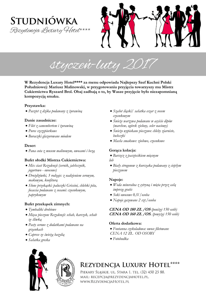 W Rezydencja Luxury Hotel**** za menu odpowiada Najlepszy Szef Kuchni Polski Południowej: Mariusz Malinowski, w przygotowaniu przyjęcia towarzyszy mu Mistrz Cukiernictwa Ryszard Brol. Obaj zadbają o to, by Wasze przyjęcie było niezapomnianą kompozycją smaku. Przystawka: Pasztet z dzika podawany z żurawiną Danie zasadnicze: Filet z camembertem i żurawiną Puree szczypiorkowe Buraczki glazurowane miodem Deser: Pana cota z musem malinowym, owocami i bezą Bufet słodki Mistrza Cukiernictwa: Mix ciast Rezydencji (sernik, jabłecznik, jogurtowo - owocowe) Drożdżówki, 3 rodzaje: z nadzieniem serowym, makowym, konfiturą Słone przekąski: paluszki Grissini, chlebki pita, focaccia podawane z sosami: czosnkowym, paprykowym Bufet przekąsek zimnych: Tymbaliki drobiowe Mięsa pieczone Rezydencji: schab, karczek, schab ze śliwką Pasty serowe z dodatkami podawane na grzankach Caprese ze świeżą bazylią Sałatka grecka Szałot śląski/ sałatka cezar z sosem czosnkowym Świeże warzywa podawane w asyście dipów (marchew, ogórek zielony, seler naciowy) Świeżo wypiekane pieczywo: chleby ziarniste, bułeczki Masła smakowe: ziołowe, czosnkowe Gorąca kolacja: Barszcz z pasztecikiem mięsnym lub Biały strogonow z kurczaka podawany z ciepłym pieczywem Napoje: Woda mineralna z cytryną i mięta przez całą imprezę gratis Soki owocowe 0,5l /osoba Napoje gazowane 2 szt./osoba CENA OD 180 ZŁ /OS (poniżej 150 osób) CENA OD 160 ZŁ /OS. (powyżej 150 osób) Oferta dodatkowa: Fontanna czekoladowa: owoce filetowane CENA 12 ZŁ OD OSOBY Fotobudka