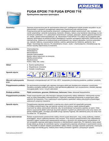 FUGA EPOXI 710 FUGA EPOXI 710 Epoksydowa zaprawa spoinująca Parametry: Zaprawa przeznaczona jest do spoinowania ściennych i podłogowych płytek przede wszystkim na powierzchniach o wysokich wymaganiach odporności chemicznej oraz mechanicznej. Przeznaczona jest do spoinowania ściennych i podłogowych płytek ceramicznych, płyt, kształtek z ceramiki szlachetnej i ceramiki budowlanej, kamionki, klinkieru, betonu oraz kamienia naturalnego na różnorodnych podłożach, m.in. jastrychach cementowych, tynkach, betonach, płytach gipsowo-kartonowych, metalu, płytach drewnopodobnych, itp. Stosowanie FUGI EPOXI 710 zaleca się szczególnie jako zaprawy spoinującej na powierzchniach stawiających wysokie wymagania odporności chemicznej oraz mechanicznej, zwłaszcza w budownictwie przemysłowym (np. baseny pływackie, kuchnie przemysłowe, natryski, balkony, oczyszczalnie ścieków, rzeźnie, galwanizernie, bielarnie, garbarnie, itp.). Wiąże i twardnieje bez skurczu. Po stwardnieniu mrozo-, wodo- i chemoodporna. Charakteryzuje się bardzo wysoką odpornością na ścieranie. Cechy produktu: Chemoodporna Wodoodporna Mrozoodporna Wysoka wytrzymałość Bardzo dobra odporność na ścieranie Gładka powierzchnia Bezskurczowa Kolory: biały, beż, szary Skład: ● Żywica epoksydowa ● Wypełniacze mineralne ● Dodatki modyfikujące Sposób użycia: Warunki wykonywania prac: Stosować w temperaturach od+10°C do +25°C, temperatury te dotyczą powietrza, podłoża i produktu. Przygotowanie podłoża: Do spoinowania przystąpić gdy zaprawa mocująca płytki jest dostatecznie związana i wyschnieta. Szczeliny pomiędzy płytkami powinny mieć jednakową głębokość, być oczyszczone z resztek zaprawy mocującej płytki, kurzu i innych zabrudzeń. Rodzaje podłoża: Płytki ceramiczne, gresowe, klinkierowe, betonowe i inne: stosować bezpośrednio Przygotowanie produktu: Przed rozpoczęciem prac oba tworzące zaprawę komponenty należy dokładnie i intensywnie wymieszać ze sobą mieszadłem wolnoobrotowym. Pojemniki zawierają komponenty w proporcjach odpowiednich do mieszania. Przy częściowym wykorzystaniu opakowań należy precyzyjnie przestrzegać zalecanych proporcji mieszania. Sposób użycia: Przygotowaną zaprawę wprowadzić w spoinę przy użyciu packi lub szpachelki gumowej. Po krótkim przeschnięciu fugi, jej nadmiar usuwać przy pomocy często płukanej gąbki. Czynność tą należy wykonywać ostrożnie, aby nie powodować wymywania zaprawy ze spoin. Ostateczne czyszczenie płytek wykonuje się przed upływem 2 godzin po zakończeniu prac przy użyciu wilgotnej miękkiej gąbki, usuwając pozostałe smugi zaprawy fugowej. Dla ułatwienia pracy do wody można dodać ok. 1% spirytusu. Uwagi wykonawcze: Świeżo wyspoinowane powierzchnie należy chronić przed deszczem, rosą, wodą użytkową, wiatrem, przeciągami, silnym nasłonecznieniem oraz mrozem. Przy dużych powierzchniach oraz odpowiednio szerokich fugach możliwe jest zastosowanie kartuszy z ręcznymi lub ciśnieniowymi wtryskarkami. W tym przypadku zaprawę spoinującą mieszamy w standardowym pojemniku. Po nałożeniu dyszy plastikowej należy ją obciąć do szerokości spoiny i przygotowaną zaprawę wtryskiwać w spoinowane szczeliny. Pozostałe na płytach zbędne pozostałości należy zebrać używając szpachli wykonanej z tworzywa sztucznego lub twardej gumy. Dalsze prace należy prowadzić zgodnie z powyższym opisem. Karta techniczna 06.02.2017 strona 1/2 FUGA EPOXI 710 FUGA EPOXI 710 Epoksydowa zaprawa spoinująca Przechowywanie: Do 12 miesięcy od daty produkcji w szczelnie zamkniętych opakowaniach i temperaturze od +5°C do +25°C, w miejscu niedostępnym dla dzieci, zabezpieczonym przed bezpośrednim nasłonecznieniem, z dala od źródeł ciepła i otwartego ognia. Można przewozić dowolnymi środkami transportu, w temp. nie niższej niż +5°. Nie podlega przepisom ADR. Ilość w opakowaniu ● 5 kg/opak., 60 szt./paleta Parametry techniczne Zużycie > 0.3 - < 3 kg/m² Wytrzymałość na ściskanie ≥45MPa Wytrzymałość na zginanie ≥30MPa Czas osiągnięcia wytrzymałości technologicznej po ok. 24h Czas osiągnięcia pełnej wytrzymałości mechanicznej po ok. 3 dniach Czas osiągnięcia pełnej odporności chemicznej po 7 dniach Odporność chemiczna 35% kwas siarkowy, 20% ług sodowy, 3% kwas solny, 10% kwas cytrynowy, 5% kwas mlekowy Odporność na temperatury o o od –40 C do +110 C Czas przydatności do użycia Do 60 minut Proporcje mieszania komponent A:B w proporcji wagowej 89:11 Szerokość spoiny Wskazówki ogólne: Karta techniczna 06.02.2017 do 10mm Ta karta zastępuje wszystkie poprzednie wersje. Informacje zawarte w niniejszej karcie technicznej reprezentuje naszą aktualną wiedzę i praktyczne doświadczenie. Są to jedynie ogólne informacje i nie stanowią o odpowiedzialności producenta za wykonawstwo i sposób użytkowania. Mogą bowiem występować różnice i specyficzne warunki sposobu wykonania. Produkt należy stosować zgodnie z wymaganą wiedzą techniczną, oraz zasadami BHP. Należy unikać kontaktu ze skórą oraz chronić oczy. W przypadku kontaktu z oczami, przemyć je obficie czystą wodą i zasięgnąć porady lekarza. Zaleca się używanie rękawic, okularów i odzieży ochronnej. strona 2/2