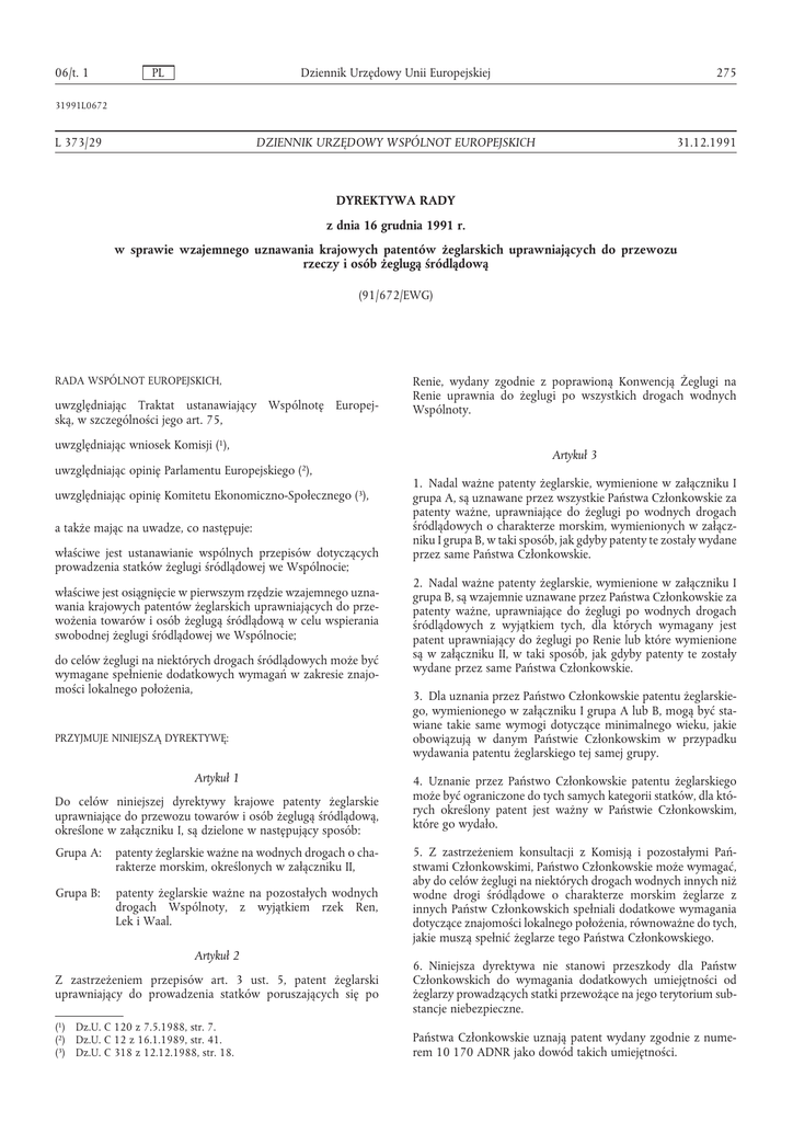 06/t. 1 Dziennik Urzędowy Unii Europejskiej PL 275 31991L0672 L 373/29 DZIENNIK URZĘDOWY WSPÓLNOT EUROPEJSKICH 31.12.1991 DYREKTYWA RADY z dnia 16 grudnia 1991 r. w sprawie wzajemnego uznawania krajowych patentów żeglarskich uprawniających do przewozu rzeczy i osób żeglugą śródlądową (91/672/EWG) RADA WSPÓLNOT EUROPEJSKICH, uwzględniając Traktat ustanawiający Wspólnotę Europejską, w szczególności jego art. 75, uwzględniając wniosek Komisji (1), Renie, wydany zgodnie z poprawioną Konwencją Żeglugi na Renie uprawnia do żeglugi po wszystkich drogach wodnych Wspólnoty. Artykuł 3 uwzględniając opinię Parlamentu Europejskiego (2), uwzględniając opinię Komitetu Ekonomiczno-Społecznego (3), a także mając na uwadze, co następuje: właściwe jest ustanawianie wspólnych przepisów dotyczących prowadzenia statków żeglugi śródlądowej we Wspólnocie; właściwe jest osiągnięcie w pierwszym rzędzie wzajemnego uznawania krajowych patentów żeglarskich uprawniających do przewożenia towarów i osób żeglugą śródlądową w celu wspierania swobodnej żeglugi śródlądowej we Wspólnocie; do celów żeglugi na niektórych drogach śródlądowych może być wymagane spełnienie dodatkowych wymagań w zakresie znajomości lokalnego położenia, PRZYJMUJE NINIEJSZĄ DYREKTYWĘ: Artykuł 1 Do celów niniejszej dyrektywy krajowe patenty żeglarskie uprawniające do przewozu towarów i osób żeglugą śródlądową, określone w załączniku I, są dzielone w następujący sposób: Grupa A: patenty żeglarskie ważne na wodnych drogach o charakterze morskim, określonych w załączniku II, Grupa B: patenty żeglarskie ważne na pozostałych wodnych drogach Wspólnoty, z wyjątkiem rzek Ren, Lek i Waal. Artykuł 2 1. Nadal ważne patenty żeglarskie, wymienione w załączniku I grupa A, są uznawane przez wszystkie Państwa Członkowskie za patenty ważne, uprawniające do żeglugi po wodnych drogach śródlądowych o charakterze morskim, wymienionych w załączniku I grupa B, w taki sposób, jak gdyby patenty te zostały wydane przez same Państwa Członkowskie. 2. Nadal ważne patenty żeglarskie, wymienione w załączniku I grupa B, są wzajemnie uznawane przez Państwa Członkowskie za patenty ważne, uprawniające do żeglugi po wodnych drogach śródlądowych z wyjątkiem tych, dla których wymagany jest patent uprawniający do żeglugi po Renie lub które wymienione są w załączniku II, w taki sposób, jak gdyby patenty te zostały wydane przez same Państwa Członkowskie. 3. Dla uznania przez Państwo Członkowskie patentu żeglarskiego, wymienionego w załączniku I grupa A lub B, mogą być stawiane takie same wymogi dotyczące minimalnego wieku, jakie obowiązują w danym Państwie Członkowskim w przypadku wydawania patentu żeglarskiego tej samej grupy. 4. Uznanie przez Państwo Członkowskie patentu żeglarskiego może być ograniczone do tych samych kategorii statków, dla których określony patent jest ważny w Państwie Członkowskim, które go wydało. 5. Z zastrzeżeniem konsultacji z Komisją i pozostałymi Państwami Członkowskimi, Państwo Członkowskie może wymagać, aby do celów żeglugi na niektórych drogach wodnych innych niż wodne drogi śródlądowe o charakterze morskim żeglarze z innych Państw Członkowskich spełniali dodatkowe wymagania dotyczące znajomości lokalnego położenia, równoważne do tych, jakie muszą spełnić żeglarze tego Państwa Członkowskiego. Z zastrzeżeniem przepisów art. 3 ust. 5, patent żeglarski uprawniający do prowadzenia statków poruszających się po 6. Niniejsza dyrektywa nie stanowi przeszkody dla Państw Członkowskich do wymagania dodatkowych umiejętności od żeglarzy prowadzących statki przewożące na jego terytorium substancje niebezpieczne. (1) Dz.U. C 120 z 7.5.1988, str. 7. (2) Dz.U. C 12 z 16.1.1989, str. 41. (3) Dz.U. C 318 z 12.12.1988, str. 18. Państwa Członkowskie uznają patent wydany zgodnie z numerem 10 170 ADNR jako dowód takich umiejętności. 276 Dziennik Urzędowy Unii Europejskiej PL Artykuł 4 Komisja w razie konieczności podejmuje niezbędne kroki w celu dostosowania wykazu patentów, znajdującego się w załączniku I, zgodnie z procedurą określoną w art. 7. Artykuł 5 Rada, stanowiąc większością kwalifikowaną, na wniosek Komisji przedłożony nie później niż do dnia 31 grudnia 1993 r. wydaje, nie później niż do dnia 31 grudnia 1994 r., decyzję w sprawie wspólnych przepisów dotyczących prowadzenia statków przewożących towary i osoby żeglugą śródlądową. Artykuł 6 Państwa Członkowskie wprowadzą w życie przepisy ustawowe, wykonawcze i administracyjne niezbędne do wykonania niniejszej dyrektywy najpóźniej do dnia 1 stycznia 1993 r. Niezwłocznie powiadomią o tym Komisję. Wymienione środki powinny zawierać odniesienie do niniejszej dyrektywy lub odniesienie to powinno towarzyszyć ich urzędowej publikacji. Metody dokonywania takiego odniesienia są określane przez Państwa Członkowskie. 06/t. 1 2. Przedstawiciel Komisji przedkłada komitetowi projekt zmiany załącznika I. Komitet wydaje opinię w sprawie projektu w terminie, który wyznacza przewodniczący w zależności od pilności sprawy. W przypadku decyzji, które Rada przyjmuje na wniosek Komisji, opinia wydawana jest większością głosów ustanowioną w art. 148 ust. 2 Traktatu. Głosy przedstawicieli Państw Członkowskich ważone są w sposób wymieniony w tym artykule. Przewodniczący nie bierze udziału w głosowaniu. Komisja przyjmuje zmianę do załącznika I, jeżeli jest zgodna z opinią komitetu. Jeżeli przewidywana zmiana nie jest zgodna z opinią komitetu albo opinia nie została wydana, Komisja niezwłocznie przedkłada Radzie wniosek dotyczący środków, jakie należy podjąć. Rada stanowi większością kwalifikowaną. Jeżeli w ciągu trzech miesięcy od daty przedłożenia takiego wniosku Radzie Rada nie stanowi, proponowana zmiana 