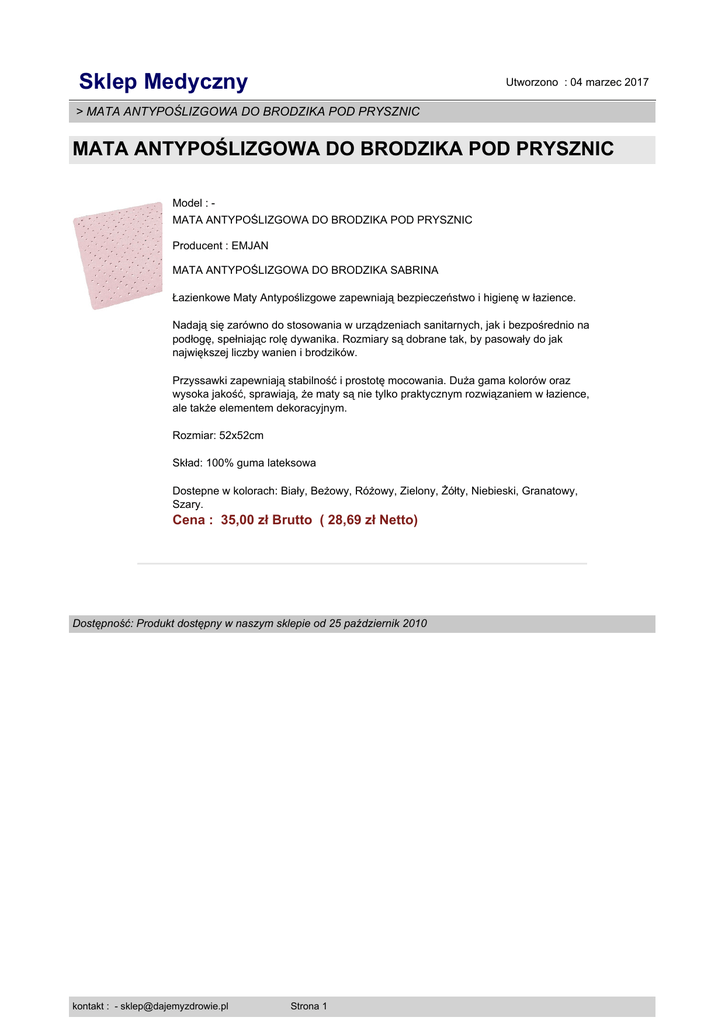 Sklep Medyczny Utworzono : 04 marzec 2017 > MATA ANTYPOŚLIZGOWA DO BRODZIKA POD PRYSZNIC MATA ANTYPOŚLIZGOWA DO BRODZIKA POD PRYSZNIC Model : MATA ANTYPOŚLIZGOWA DO BRODZIKA POD PRYSZNIC Producent : EMJAN MATA ANTYPOŚLIZGOWA DO BRODZIKA SABRINA Łazienkowe Maty Antypoślizgowe zapewniają bezpieczeństwo i higienę w łazience. Nadają się zarówno do stosowania w urządzeniach sanitarnych, jak i bezpośrednio na podłogę, spełniając rolę dywanika. Rozmiary są dobrane tak, by pasowały do jak największej liczby wanien i brodzików. Przyssawki zapewniają stabilność i prostotę mocowania. Duża gama kolorów oraz wysoka jakość, sprawiają, że maty są nie tylko praktycznym rozwiązaniem w łazience, ale także elementem dekoracyjnym. Rozmiar: 52x52cm Skład: 100% guma lateksowa Dostepne w kolorach: Biały, Beżowy, Różowy, Zielony, Żółty, Niebieski, Granatowy, Szary. Cena : 35,00 zł Brutto ( 28,69 zł Netto) Dostępność: Produkt dostępny w naszym sklepie od 25 październik 2010 kontakt : - [email protected] Strona 1
