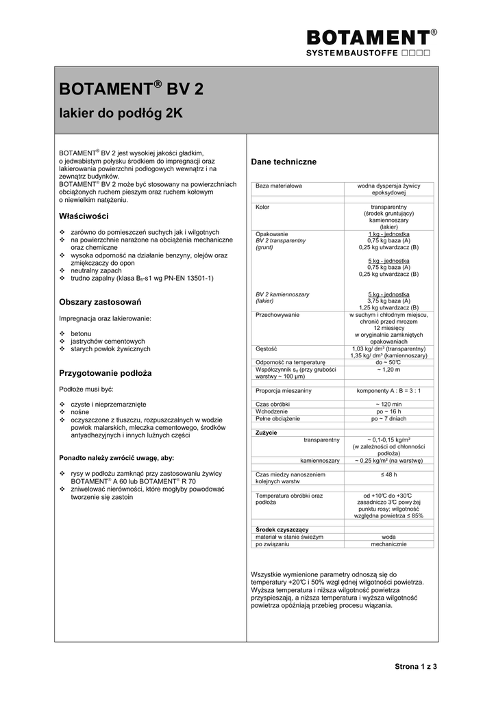 BOTAMENT BV 2 lakier do podłóg 2K BOTAMENT® BV 2 jest wysokiej jakości gładkim, o jedwabistym połysku środkiem do impregnacji oraz lakierowania powierzchni podłogowych wewnątrz i na zewnątrz budynków. BOTAMENT BV 2 może być stosowany na powierzchniach obciążonych ruchem pieszym oraz ruchem kołowym o niewielkim natężeniu. Dane techniczne Baza materiałowa wodna dyspersja żywicy epoksydowej Kolor transparentny (środek gruntujący) kamiennoszary (lakier) 1 kg - jednostka 0,75 kg baza (A) 0,25 kg utwardzacz (B) Właściwości zarówno do pomieszczeń suchych jak i wilgotnych na powierzchnie narażone na obciążenia mechaniczne oraz chemiczne wysoka odporność na działanie benzyny, olejów oraz zmiękczaczy do opon neutralny zapach trudno zapalny (klasa Bfl-s1 wg PN-EN 13501-1) Obszary zastosowań Impregnacja oraz lakierowanie: betonu jastrychów cementowych starych powłok żywicznych Opakowanie BV 2 transparentny (grunt) 5 kg - jednostka 0,75 kg baza (A) 0,25 kg utwardzacz (B) BV 2 kamiennoszary (lakier) Przechowywanie Gęstość Przygotowanie podłoża Odporność na temperaturę Współczynnik sd (przy grubości warstwy ~ 100 µm) Podłoże musi być: Proporcja mieszaniny czyste i nieprzemarznięte nośne oczyszczone z tłuszczu, rozpuszczalnych w wodzie powłok malarskich, mleczka cementowego, środków antyadhezyjnych i innych luźnych części Ponadto należy zwrócić uwagę, aby: rysy w podłożu zamknąć przy zastosowaniu żywicy BOTAMENT A 60 lub BOTAMENT R 70 zniwelować nierówności, które mogłyby powodować tworzenie się zastoin Czas obróbki Wchodzenie Pełne obciążenie 5 kg - jednostka 3,75 kg baza (A) 1,25 kg utwardzacz (B) w suchym i chłodnym miejscu, chronić przed mrozem 12 miesięcy w oryginalnie zamkniętych opakowaniach 1,03 kg/ dm³ (transparentny) 1,35 kg/ dm³ (kamiennoszary) do ~ 50°C ~ 1,20 m komponenty A : B = 3 : 1 ~ 120 min po ~ 16 h po ~ 7 dniach Zużycie transparentny kamiennoszary ~ 0,1-0,15 kg/m² (w zależności od chłonności podłoża) ~ 0,25 kg/m² (na warstwę) Czas miedzy nanoszeniem kolejnych warstw ≤ 48 h Temperatura obróbki oraz podłoża od +10°C do +30°C zasadniczo 3°C powy żej punktu rosy; wilgotność względna powietrza ≤ 85% Środek czyszczący materiał w stanie świeżym po związaniu woda mechanicznie Wszystkie wymienione parametry odnoszą się do temperatury +20°C i 50% wzgl ędnej wilgotności powietrza. Wyższa temperatura i niższa wilgotność powietrza przyspieszają, a niższa temperatura i wyższa wilgotność powietrza opóźniają przebieg procesu wiązania. Strona 1 z 3 BOTAMENT BV 2 lakier do podłóg 2K Obróbka Gruntowanie BOTAMENT BV 2 transparentnym: komponent B należy dodać do komponentu A i mieszać wolnoobrotowym mieszadłem przez min. 3 min. aby zapewnić równomierne rozłożenie składników BOTAMENT BV 2, materiał należy przelać do czystego pojemnika (opakowanie dokładnie opróżnić) i ponownie zamieszać tak przygotowany materiał rozprowadzić równomiernie przy użyciu wałka z owczej wełny o krótkim włosiu Jako środek gruntujący BOTAMENT BV 2 nanosi się w jednej lub dwóch warstwach w zależności od właściwości podłoża. Lakierowanie BOTAMENT BV 2 kamiennoszarym: komponent B należy dodać do komponentu A i mieszać wolnoobrotowym mieszadłem przez min. 3 min. aby zapewnić równomierne rozłożenie składników BOTAMENT BV 2, materiał należy przelać do czystego pojemnika (opakowanie dokładnie opróżnić) i ponownie zamieszać tak przygotowany materiał rozprowadzić równomiernie na zagruntowaną i wyschniętą powierzchnię, przy użyciu wałka z owczej wełny o krótkim włosiu warstwę wierzchnią nanosić na wyschniętą warstwę bazową przy użyciu wałka z owczej wełny o krótkim włosiu Lakierowanie przy zastosowaniu BOTAMENT BV 2 należy przeprowadzać nanosząc minimum dwie warstwy materiału. W przypadku powierzchni przewidzianych jako antypoślizgowe, bezpośrednio po nałożeniu pierwszej warstwy BOTAMENT BV 2, należy wykonać posypkę z suszonego piasku kwarcowego o uziarnieniu 0,1-0,3 mm (np. mieszanka H 32). Po związaniu BOTAMENT BV 2 należy w całości usunąć luźne pozostałości piasku. W celu zachowania działania antypoślizgowego, podczas nanoszenia warstwy wierzchniej należy zwrócić uwagę, aby nie pokryć całkowicie wykonanej posypki. W miarę możliwości należy obrabiać całe opakowania BOTAMENT BV 2. Należy unikać zawilgocenia działającego od strony podłoża. W przypadku zastosowania BOTAMENT BV 2 w tzw. pomieszczeniach mokrych należy zwrócić uwagę aby materiał nanosić cało powierzchniowo (zwarta barwna powłoka). Aby zapewnić optymalną przyczepność, między nanoszeniem kolejnych warstw BOTAMENT BV 2, powierzchnie podłogi należy chronić przed kurzem i zabrudzeniami. BOTAMENT BV 2 należy stosować wyłącznie z dodatkami wymienionymi w niniejszej karcie technicznej. Do czyszczenia powierzchni pokrytych BOTAMENT BV 2 można używać neutralnych lub lekko alkaicznych środków czyszczących. W przypadku zastosowania BOTAMENT BV 2 na zewnątrz budynków (obciążenia promieniowaniem UV) po pewnym czasie może dojść do zmiany barwy. Efekt ten nie ma jednak żadnego wpływu na funkcjonalność powłoki. Niekiedy może dojść do odbarwienia powłoki na skutek działania miękkich opon pojazdów. U osób wrażliwych podczas obróbki materiałów na bazie żywic reaktywnych mogą wystąpić podrażnienia alergiczne. Aby uniknąć bezpośredniego kontaktu ze skórą, w czasie pracy należy nosić odzież ochronną oraz przestrzegać pozostałych przepisów BHP. Podczas stosowania BOTAMENT® BV 2 należy zapewnić odpowiednią wentylację pomieszczenia. BOTAMENT BV 2 jest przeznaczony do użytku jedynie przez osoby odpowiednio wykwalifikowane. Karta charakterystyki produktu dostępna jest na stronie internetowej www.botament.com. W celu osiągnięcia optymalnych parametrów technicznych, przed zas