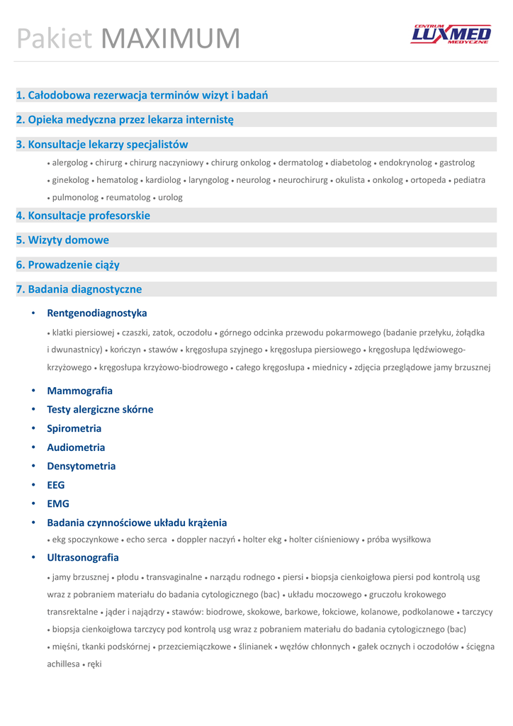 Pakiet MAXIMUM 1. Całodobowa rezerwacja terminów wizyt i badań 2. Opieka medyczna przez lekarza internistę 3. Konsultacje lekarzy specjalistów ● alergolog ● chirurg ● chirurg naczyniowy ● chirurg onkolog ● dermatolog ● diabetolog ● endokrynolog ● gastrolog ● ginekolog ● hematolog ● kardiolog ● laryngolog ● neurolog ● neurochirurg ● okulista ● onkolog ● ortopeda ● pediatra ● pulmonolog ● reumatolog ● urolog 4. Konsultacje profesorskie 5. Wizyty domowe 6. Prowadzenie ciąży 7. Badania diagnostyczne • Rentgenodiagnostyka ● klatki piersiowej ● czaszki, zatok, oczodołu ● górnego odcinka przewodu pokarmowego (badanie przełyku, żołądka i dwunastnicy) ● kończyn ● stawów ● kręgosłupa szyjnego ● kręgosłupa piersiowego ● kręgosłupa lędźwiowegokrzyżowego ● kręgosłupa krzyżowo-biodrowego ● całego kręgosłupa ● miednicy ● zdjęcia przeglądowe jamy brzusznej • Mammografia • Testy alergiczne skórne • Spirometria • Audiometria • Densytometria • EEG • EMG • Badania czynnościowe układu krążenia ● • ekg spoczynkowe ● echo serca ● doppler naczyń ● holter ekg ● holter ciśnieniowy ● próba wysiłkowa Ultrasonografia ● jamy brzusznej ● płodu ● transvaginalne ● narządu rodnego ● piersi ● biopsja cienkoigłowa piersi pod kontrolą usg wraz z pobraniem materiału do badania cytologicznego (bac) ● układu moczowego ● gruczołu krokowego transrektalne ● jąder i najądrzy ● stawów: biodrowe, skokowe, barkowe, łokciowe, kolanowe, podkolanowe ● tarczycy ● biopsja cienkoigłowa tarczycy pod kontrolą usg wraz z pobraniem materiału do badania cytologicznego (bac) ● mięśni, tkanki podskórnej ● przezciemiączkowe ● ślinianek ● węzłów chłonnych ● gałek ocznych i oczodołów ● ścięgna achillesa ● ręki • Badania endoskopowe ● • gastroskopia ● rektoskopia ● sigmoidoskopia ● kolonoskopia Tomografia komputerowa ● głowy ● oczodołów ● twarzoczaszki ● zatok ● kości skroniowej ● nosogardła ● żuchwy ● szczęki ● krtani ● szyi ● klatki piersiowej ● kręgosłupa ● jamy brzusznej ● miednicy ● kończyn dolnych ● kończyn górnych ● stawów • Rezonans magnetyczny ● głowy ● oczodołów ● twarzoczaszki ● zatok ● kości skroniowej ● nosogardła ● żuchwy ● szczęki ● krtani ● szyi ● klatki piersiowej ● kręgosłupa ● jamy brzusznej ● miednicy ● kończyn dolnych ● kończyn górnych ● stawów 8. Badania laboratoryjne • Badania biochemiczne ● amylaza/diastaza ● azot mocznikowy bezpośrednia ● bilirubina pośrednia wątrobowe ● mleczanowa ● mocznik ● próby proteinogram ● crp ● czynnik reumatoidalny ● dehydrogenaza fosfotaza alkaliczna/zasadowa ● fosfotaza kwaśna całkowita ● fosfotaza kwaśna sterczowa ● kinaza fosfokreatynowa izoenzym ● ● fosfor kwas moczowy ● magnez ● wapń ceruloplazmina ● lipaza ● homocysteina cholesterol całkowity ● cholesterol hdl ● cholesterol ldl ● triglicerydy ● lipidogram TSH ● TT3 ● fT3 ● TT4 ● fT4 glukoza ● krzywa cukrowa ● hemoglobina glikowana całkowita zdolność wiązania ● żelazo ● CEA ● PSA całkowity ● PSA wolny ● AFP ● transferyna ● kwas foliowy CA 125 ● CA 15-3 ● CA 19-9 Badania hematologiczne ● czas kaolinowo-kefalinowy trombinowy • ● Markery nowotworowe ● • ● ● kreatynina ● klirens kreatyniny bilirubina Diagnostyka niedokrwistości ● • albumina ● Diagnostyka cukrzycy ● • ● bilirubina całkowita Diagnostyka chorób tarczycy ● • żelazo ● ● Diagnostyka miażdżycy ● • ● ● alat ● aspat ● białko całkowite chlorki ● ggtp ● glukoza kinaza fosfokreatynowa/kreatynowa całkowity • sód ● potas ● ● ● ● morfologia ● ob ● rozmaz krwi wskaźnik quicka/inr ● fibrynogen ● IgA ● IgG ● IgE ● IgM retikulocyty ● czas krwawienia ● czas krzepnięcia ● czas grupa krwi ● odczyn coombsa Badania immunologiczne oraz diagnostyka alergii ● ● ● fdp ● antytrombina iii • Badania serologiczne ● odczyn Waalera-Rosego ● ASO ● WR ● mioglobina ● antygen HBs ● p.ciała anty-HCV ● Helicobacter pylorii ● P.ciała anty HIV , HIV2 ● p.ciała anty toxoplasma gondii IgG, IgM ● p.ciała ● p.ciała anty-CMV IgG, IgM ● p.ciała anty-HBs anty rubella IgG, IgM • Badania hormonalne ● • • • • estradiol ● estriol ● progesteron ● prolaktyna ● testosteron ● beta – HCG ● FSH ● LH ● TSH ● kortyzol ● parathormon Posiewy bakteriologiczne z antybiogramem ● moczu ● kału ● z jamy ustnej ● z kanału szyjki macicy ● z nosa ● z oka ● z pochwy ● z rany ● z ucha ● ze zmian skórnych ● salmonella – shigella ● krwi ● plwociny ● ze zmiany ropnej ● z czyraka ● z cewki moczowej ● z gardła Badanie mykologiczne w kierunku drożdży, grzybów, pleśni z antybiogramem ● ze zmiany ropnej ● z czyraka ● z cewki moczowej ● z gardła ● z jamy ustnej ● z kanału szyjki macicy ● z nosa ● z oka ● z pochwy ● z rany ● z ucha ● ze zmian skórnych Badania moczu ● amylaza/diastaza ● klirens kreatyniny ● ● badanie ogólne moczu ● glukoza ● sód liczba addisa ● ● potas ● wapń ● fosfor ● kreatynina ● kwas moczowy magnez ● mocznik Badanie kału ● badanie ogólne kału ● jaja pasożytów ● kał na krew utajoną ● cysty lamblii ● badanie kału w kierunku Shigella Salmonella • Badania cytologiczne i histopatologiczne ● badanie cytologiczne ● badanie cytohormonalne ● badanie histopatologiczne 9. Szczepienia ochronne ● konsultacja lekarska przed szczepieniem ● szczepienie przeciwko grypie ● podanie anatoksyny p. tężcowej 10. Ambulatoryjna opieka pielęgniarska ● pomiar ciśnienia tętniczego ● iniekcje dożylne, domięśniowe, podskórne ● założenie lub zmiana opatrunku pro