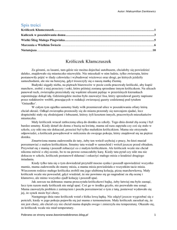 Autor: Maksymilian Zienkiewicz Spis treści Króliczek Kłamczuszek ..........................................................................................................................1 Kuliczek w poszukiwaniu domu ............................................................................................................3 Wielki Ślizg Małego Pingwinka .............................................................................................................5 Marzenia o Wielkim Świecie .................................................................................................................6 Nietutejsza .............................................................................................................................................10 Króliczek Kłamczuszek Za górami, za lasami, tam gdzie nie można dojechać autobusem, chciałoby się powiedzieć daleko, znajdowało się miasteczko niezwykłe. Nie mieszkali w nim ludzie, tylko zwierzęta, które postanowiły pójść w ślady człowieka i wybudować wieżowce oraz drogi, po których jeździły samochodami, ale nie na benzynę, gdyż troszczyły się o naszą matkę Ziemię. Budynki sięgały nieba, na piętrach biurowców w pocie czoła pracowały króliczki, aby kupić marchew, zrobić z niej przeciery i soki, które później zostaną sprzedane innym króliczkom. Na ulicach panował ruch, zwierzątka przeciskały się wąskimi ulicami pędząc w przeróżnych kierunkach zapominając dokąd idą. Gdzieniegdzie można było zauważyć lisa, który sprzedawał gazety napisane przez redaktorów wróbli, pracujących w redakcji zwierzęcej gazety codziennej pod tytułem ‘Gniazdko’. W całym tym zgiełku samotny biały wilk przemierzał ulice w poszukiwaniu ofiary którą chciał okraść. Odkąd zwierzątka przenosiły się do miasta przestały się nawzajem zjadać, lecz drapieżniki stały się złodziejami i łobuzami, którzy żyli kosztem innych, pracowitych mieszkańców miasteczka. Mały króliczek wracał zatłoczoną ulicą do domku za szkoły. Tego dnia dostał złą ocenę i był bardzo smutny. Kiedy dotarł do domu z buzią na kwintę, mama od razu zapytała czy coś się stało w szkole, czy nikt mu nie dokuczał, przecież był tylko malutkim króliczkiem. Mama nie otrzymała odpowiedzi, a króliczek powędrował w milczeniu do swojego pokoju, który znajdował się na piętrze domku. Zmartwiona mama zadzwoniła do taty, żeby ten wrócił szybciej z pracy, bo ktoś musiał porozmawiać z małym króliczkiem. Smutny tata wsiadł w samochód i wrócił jeszcze przed obiadem. Przywitał się z mamą i poszedł zobaczyć co z małym króliczkiem. Ale króliczek wcale nie chciał nikomu mówić o złej ocenie, bo to na pewno oznaczałoby karę. Kiedy tata pytał czy nikt mu nie dokucza w szkole, króliczek postanowił skłamać i oskarżyć małego misia o kradzież drugiego śniadania. Kiedy tylko tata się o tym dowiedział przytulił mocno synka i poszedł opowiedzieć wszystko mamie, mama zadzwoniła do mamy misia, a mama misia powiedziała o wszystkim tacie misia. Wieczorem rodzice małego króliczka zrobili mu jego ulubioną kolację, pizzę marchewkową. Mały króliczek wcale nie poweselał, gdyż wiedział, że nie powinno się go nagradzać za złą ocenę i kłamstwo, ale mimo wszystko zjadł kolację i poszedł spać. Jak zawsze na dobranoc mama przeczytała króliczkowi bajkę, żeby łatwiej mu było zasnąć, lecz tym razem mały króliczek nie mógł spać. Coś go w środku gryzło, nie pozwalało mu usnąć. Mama zauważyła problem z zaśnięciem i poszła porozmawiać o tym z tatą, ponieważ wydawało się jej, że synek może być chory. Następnego dnia rano króliczek wstał z łóżka lewą łapką. Nie zdążył jeszcze wygrzebać się z pościeli, kiedy w jego pokoju pojawiła się już mama z termometrem. Mały króliczek zarzekał się, że nie jest chory, ale chciał czy nie chciał mama dopięła swego i zmierzyła mu temperaturę. Okazało się, że króliczek wcale nie miał temperatury. Pobrano ze strony www.basnienadobranoc.blog.pl 1 Autor: Maksymilian Zienkiewicz Zmartwiona mama nie wiedziała już co ma zrobić, żeby jej synek wreszcie poczuł się lepiej. Po śniadaniu tata pojechał do pracy przy okazji odwożąc króliczka do szkoły. W drodze samochodem poprosił on synka, żeby powiedział pani albo rodzicom, jeżeli ktokolwiek będzie mu dokuczał. W szkole mały króliczek zauważył, że miś siedzi bardzo przygnębiony. Na przerwie obiadowej, kiedy wszyscy jedli drugie śniadanie misiowi tylko burczało w brzuszku, gdyż nie dostał nic do jedzenia z domu. Małemu króliczkowi zrobiło się bardzo smutno. Chciał podzielić się swoim posiłkiem z poszkodowanym misiem, ale przecież misie nie jedzą marchewek. Kolejny raz mały króliczek wracał zasmucony do domu. W domu czekała na niego zmartwiona mama. Okazało się, że dzwoniła do niej pani nauczycielka. Mały króliczek przestraszył się, gdyż obawiał się, że jego kłamstewka wyjdą na jaw. Nauczycielka dzwoniła, aby poinformować mamę króliczka, że jej syn nie może skupić się na lekcji, ma problemy z odnalezieniem się w klasie i cały czas chodzi smutny. Mama pytała dlaczego tak się dzieje, ale jej synek tylko mamrotał, że to dlatego, ponieważ wstał lewą łapką. I tej nocy mały króliczek nie mógł zasnąć. Myślał o głodnym misiu, zmartwionej mamie, smutnym tacie i problemach w szkole. Króliczek chciał się do wszystkiego przyznać, ale było tego tak dużo. Teraz na pewno czekała go porządna kara. Zamiast powiedzieć o wszystkim rodzicom króliczek poprosił mamę o kieszonkowe. Chciał za nie kupić misiowi garnuszek miodku w szkolnym sklepiku. Zmartwiona mama zgodziła się dać małemu króliczkowi pieniążki w nadziei, że to go rozweseli. Następnego dnia mały króliczek poszedł sam do szkoły. Pierwsze co chciał zrobić to kupić miodek misiowi, nie 