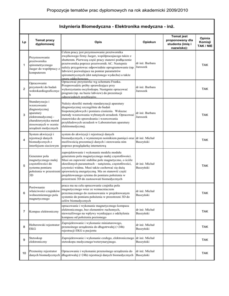 Propozycje tematów prac dyplomowych na rok akademicki 2009/2010 Inżynieria Biomedyczna - Elektronika medyczna - inż. Lp Temat pracy dyplomowej Opis Celem pracy jest przystosowanie przetwornika zwężkowego firmy Jaeger, współpracujacego także z Przystosowanie shutterem. Pierwszą część pracy stanowi podłączenie przetwornika przetwornika poprzez przetwornik AC. Nastepnie spirometrycznego Jaeger do współpracy z należy przygotowac odpowiednie oprogramowanie (np. labview) pozwalajace na pomiar parametrów komputerem spirometrycznych (dot natężonego wydechu) a także oporu oddechowego. Opracować przystawke wg schematu Franka. Opracowanie Przeprowadzic próby sprawdzające przy przystawki do badań wykorzystaniu oscyloskopu. Następnie opracować wektokardiograficznyc program (np. na bazie labview) do prezentacji h odpowiednich przebiegów. Opiekun Temat jest proponowany dla studenta (imię i nazwisko): Opinia Komisji TAK / NIE dr inż. Barbara Juroszek TAK dr inż. Barbara Juroszek TAK 3 Standaryzacja i wzorcowanie diagnostycznej aparatury elektromedycznej charakterystyka metod stosowanych w ocenie urządzeń medycznych Należy określić metody standaryzacji aparatury diagnostycznej szczególnie do badań biopotencjałowych i pomiaru cisnienia. Wskazac dr inż. Barbara metody wzorcowania wybranych urzadzeń. Opracować Juroszek stanowisko do sprawdzania i wzorcowania przykładowych urzadzeń w Laboratorium aparatury elektromedycznej. TAK 4 System akwizycji i rejestracji danych biomedycznych z interfejsem sieciowym system do akwizycji i rejestracji danych biomedycznych, z wymiennym nośnikiem pamięci oraz dr inż. Michał możliwością prezentacji danych i sterowania nim Baszyński poprzez przeglądarkę internetową TAK 5 Generator pola magnetycznego małej częstotliwości do systemu pomiaru położenia w przestrzeni 3D zaprojektowanie i wykonanie modelu modułu generatora pola magnetycznego małej częstotliwości. Musi on zapewnić stabilne pole magnetyczne, o ściśle określonych parametrach – natężeniu, częstotliwości, czystości widma. Musi także cechować się dużą sprawnością energetyczną. Ma on stanowić część projektowanego sytemu do pomiaru położenia w przestrzeni 3D do zastosowań biomedycznych dr inż. Michał Baszyński TAK 6 praca ma na celu opracowanie czujnika pola Porównanie magnetycznego wraz ze wzmacniaczem właściwości czujników przeznaczonego do zastosowania w projektowanym wolnozmiennego pola systemie do pomiaru położenia w przestrzeni 3D do magnetycznego celów biomedycznych dr inż. Michał Baszyński TAK 7 opracowanie i wykonanie magnetycznego kompasu elektronicznego, bez elementów ruchomych, Kompas elektroniczny niewrażliwego na wpływy wynikające z odchylenia kompasu od położenia poziomego dr inż. Michał Baszyński TAK 8 Zaprojektowanie i wykonanie miniaturowego, Holterowski rejestrator przenośnego urządzenia do długotrwałej (>24h) EKG rejestracji EKG u pacjenta dr inż. Michał Baszyński TAK 9 Stetoskop elektroniczny Zaprojektowanie i wykonanie czułego, elektronicznego dr inż. Michał stetoskopu medycznego/weterynaryjnego. Baszyński TAK 10 Przenośny rejestrator Opracowanie i wykonanie przenośnego urządzenia do dr inż. Michał danych biomedycznych długotrwałej (>24h) rejestracji danych biomedycznych Baszyński TAK 1 2 Propozycje tematów prac dyplomowych na rok akademicki 2009/2010 Miniaturowy przyrząd do pomiaru impedancji Opracowanie i wykonanie przenośnego urządzenia dr inż. Michał służącego do analizy impedancji elektrycznej tkanek w 11 elektrycznej w Baszyński zastosowaniach paśmie częstotliwości do 100kHz biomedycznych TAK Mikroprocesorowy 12 analizator EKG oprogramowanie Celem pracy jest przygotowanie oprogramowania dla istniejącego modelu analizatora EKG z mikroprocesorem 80535. Część teoretyczna pracy dr inż.. Jerzy powinna zawierać przegląd stanu techniki i procedur Kolanko stosowanych w inteligentnych analizatorach EKG oraz własne aplikacje wzorca adaptacyjnego pracy serca i wykrywania arytmii. TAK Bezprzewodowy wzmacniacz sygnału 13 EKG dla mikroprocesorowego analizator EKG Celem pracy jest projekt i konstrukcja bezprzewodowego wzmacniacza do analizatora EKG. Projekt ma zawierać przegląd metod i układów transmisji danych pracujących w zasięgu do 50 m. dr inż.. Jerzy Kolanko TAK dr inż.. Jerzy Kolanko TAK dr inż.. Jerzy Kolanko TAK dr inż Mirosław Łątka TAK dr inż Mirosław Łątka TAK 14 Stymulacja elektryczna obszarów mózgowych Stymulacja elektryczna długoterminowa, 15 konstrukcja stymulatorów 16 Zwierzęce modele krwiaków mózgowych Multimodalny 17 monitoring noworodków Celem pracy jest zebranie wiadomości na temat wpływu mikropola elektrycznego na różne obszary mózgowe. Istotnym jest poznanie mechanizmów depolaryzacji komórek mózgowych. Celem praktycznym pracy jest opracowanie programów terapii w schorzeniach układu nerwowego. Celem pracy jest zebranie wiadomości na temat konstrukcji stymulatorów bateryjnych o działaniu długoterminowym oraz doskonalenie konstrukcji poprzez aplikację własnego opracowania. wymagane są predyspozycje do udziału w neurochirgicznych badaniach wpływu krwiaków mózgowych na przepływy mózgowe (LabView, Matlab) Akwizycja i analiza sygnałów biomedycznych noworodków z niskim APGAR (ABP, EKG, EEG, etc) rejestrowanych na oddziale intensywnej opieki medycznej Badanie właściwości optycznych srebra i 18 dwutlenku tytanu w zolu krzemionkowym Poszukiwanie korelacji pomiędzy właściwościami optycznymi materiałow krzemiokowych otrzymywanych metodą przejścia zolu w żel a stężeniem nanocząstek srebra i stężeniem dwutlenku tytanu w zolu krzemionkowym. Praca w laboratorium "mokrej chemii" oraz samodzielne pomiary spektroskopowe. Temat przeznaczony dla osób cierpliwych ze znajomością języka angielskiego. dr inż. Agnieszka Ulatowska-Jarża TAK Mikroskopia sond skanujących na 19 przykładzie Kel