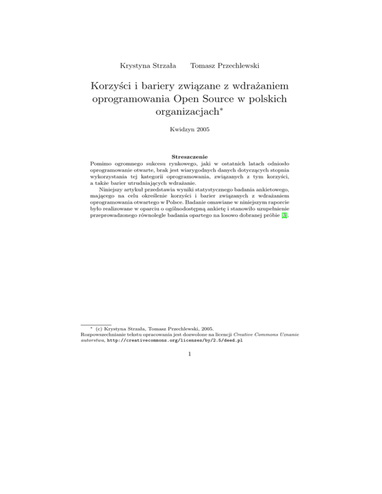 Krystyna Strzała Tomasz Przechlewski Korzyści i bariery związane z wdrażaniem oprogramowania Open Source w polskich organizacjach∗ Kwidzyn 2005 Streszczenie Pomimo ogromnego sukcesu rynkowego, jaki w ostatnich latach odniosło oprogramowanie otwarte, brak jest wiarygodnych danych dotyczących stopnia wykorzystania tej kategorii oprogramowania, związanych z tym korzyści, a także barier utrudniających wdrażanie. Niniejszy artykuł przedstawia wyniki statystycznego badania ankietowego, mającego na celu określenie korzyści i barier związanych z wdrażaniem oprogramowania otwartego w Polsce. Badanie omawiane w niniejszym raporcie było realizowane w oparciu o ogólnodostępną ankietę i stanowiło uzupełnienie przeprowadzonego równolegle badania opartego na losowo dobranej próbie [3]. ∗ (c) Krystyna Strzała, Tomasz Przechlewski, 2005. Rozpowszechnianie tekstu opracowania jest dozwolone na licencji Creative Commons Uznanie autorstwa, http://creativecommons.org/licenses/by/2.5/deed.pl 1 1. Charakterystyka oprogramowania otwartego Oprogramowanie otwarte to programy rozpowszechniane na licencji, która musi spełniać następujące warunki: swoboda rozpowszechniania programu, dostępność kodu źródłowego oraz możliwość tworzenia dzieł pochodnych. Sukces oprogramowania otwartego spowodował, że stało się ono już przedmiotem licznych badań i studiów, przy czym większość z nich koncentruje się raczej na fenomenie jego tworzenia: motywacji twórców, koordynacji projektów itp. Stosunkowo mniejsza część jest związana z wykorzystaniem tej kategorii oprogramowania w przedsiębiorstwach. Oprogramowanie wykorzystywane we współczesnej organizacji cechuje duża różnorodność, co wynika z zastosowania systemów IT do wspomagania działalności organizacji w różnych aspektach. Z reguły większość organizacji wykorzystuje gotowe produkty zakupione od dostawców bądź integratorów. W przypadku większych firm, posiadających wykwalifikowanych pracowników w dziale IT, część oprogramowania jest wytwarzana, integrowana lub adaptowana we własnym zakresie. Oprogramowanie open source eksploatowane w organizacji może być albo komponentem zintegrowanym z zakupioną aplikacją, np. Linux jako platforma systemowa, albo może być adaptacją, przez pracowników działu IT lub przez firmę zewnętrzną, systemu/systemów open source na potrzeby organizacji, np. adaptacja systemu zarządzania treścią na potrzeby organizacji. Podstawą infrastruktury IT każdej organizacji jest system operacyjny, którego zadaniem jest integracja i zarządzanie zasobami sprzętowymi oraz oprogramowaniem. Pierwszym masowym zastosowaniem Linuksa w działalności komercyjnej było właśnie wykorzystanie tego systemu w charakterze platformy systemowej [1]. Bazy danych są współcześnie kluczowym elementem infrastruktury IT każdego przedsiębiorstwa. Na licencji open source dostępnych jest kilka systemów zarządzania bazami danych. Do najczęściej wykorzystywanych należą: PostgreSQL, MySQL oraz Firebird. W wielu przypadkach system zarządzania bazami danych jest zintegrowany z aplikacją biznesową wykorzystywaną w organizacji. Aplikacja ta może wykorzystywać system komercyjny, ale może też być oparta o aplikację open source. Innym ważnym obszarem zastosowań IT są aplikacje webowe, tj. narzędzia do tworzenia i zarządzania witrynami WWW oraz usługami udostępnianymi poprzez Sieć. Ten obszar zastosowań systemów IT jest w dużym stopniu zdominowany przez systemy open source. Ostatnim ważnym obszarem zastosowań systemów IT w organizacji jest oprogramowanie desktopowe, tj. programy wykorzystywane przez użytkowników końcowych w organizacji. Istnieje ogromna różnorodność aplikacji desktopowych, jednak większość użytkowników ogranicza się do posługiwania się programami biurowymi (edytor, arkusz kalkulacyjny, tworzenie prezentacji) oraz oprogramowaniem komunikacyjnym (przeglądarka internetowa, klient poczty 2 elektronicznej oraz komunikator). W przypadku tej kategorii oprogramowania ważne znaczenie, decydujące o jego popularności, ma łatwość posługiwania się systemem i zgodność z dominującymi standardami (danych i interfejsu). Współcześnie faktycznym standardem aplikacji biurowych jest pakiet Office firmy Microsoft (Word, Excel oraz PowerPoint), zaś w przypadku programów komunikacyjnych, programy Internet Explorer oraz Outlook tejże firmy. 2. Opis badania i charakterystyka respondentów W celu określenia zakresu wykorzystania oprogramowania otwartego w Polsce, korzyści z jego stosowania i barier utrudniających jego akceptację przeprowadzone zostały we wrześniu i październiku 2005 r. dwa badania ankietowe. Podstawową formą zbierania danych w obu sondażach była samodzielnie wypełniana przez respondentów ankieta elektroniczna, której skrócona wersja znajduje się w załączniku A. Badanie omawiane w niniejszym raporcie było badaniem realizowane w oparciu o ogólnodostępną ankietę, zamieszczoną na stronie http://bwo.kwidzyn.edu.pl. Informacja o badaniu została ogłoszona w serwisie http://7thguard.net/, który jest często odwiedzany/czytany przez użytkowników oprogramowania otwartego. Omawiana ankieta była badaniem uzupełniającym do przeprowadzonego równolegle badania opartego na losowo dobranej próbie średnich i dużych organizacji, opisanego w [3]. Wynikający głównie z ograniczeń finansowych sposób doboru respondentów powoduje, że omawiane badanie nie może być traktowane za reprezentatywne ani dla wszystkich polskich przedsiębiorstw i instytucji, ani nawet dla tych z nich, które wykorzystują oprogramowanie otwarte. Pomimo wyżej opisanych niedoskonałości metodologicznych otrzymane wyniki mogą – zdaniem autorów – stanowić cenne uzupełnienie badania [3], np. z uwagi na duży udział w próbie przedsiębiorstw z branż wykorzystujących wysokie technologie (sekcja K klasyfikacji EKD) 