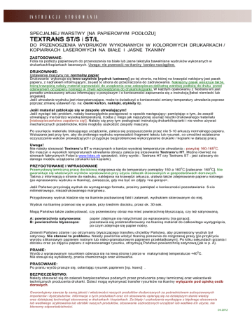 INSTRUKCJA STOSOWANIA SPECJALNEJ WARSTWY [NA PAPIEROWYM POD U] TEXTRANS ST/S i ST/L DO PRZENOSZENIA WYDRUKÓW WYKONANYCH W KOLOROWYCH DRUKARKACH / KOPIARKACH LASEROWYCH NA BIA E I JASNE TKANINY ZASTOSOWANIE: Folia na pod u papierowym do przenoszenia na bia e lub jasne tekstylia bawe niane wydruków wykonanych w drukarkach/kopiarkach laserowych. Uwaga: nie przenosi na tkaniny bardzo rozci gliwe. DRUKOWANIE: Ustawienie maszyny na: normalny papier Drukowanie wykonuje si lewo-czytelnie [wydruk lustrzany] po tej stronie, na której na kraw dzi naklejony jest pasek papieru, z nadrukiem informuj cym, e jest to strona do przeznaczona do zadrukowania. Naklejony pasek wskazuje tak e, któr kraw dzi nale y materia wprowadzi do urz dzenia oraz zabezpiecza delikatn warstw pod a do druku przed oderwaniem od papieru no nego w chwili wprowadzania do drukarki/kopiarki. W ka dym opakowaniu z Textrans’em jest ponadto umieszczony arkusz informuj cy o powy szym i o konieczno ci zapoznania si z instrukcj [tekst niemiecki lub angielski]. Je li utrwalanie wydruku jest niewystarczaj ce, mo e to wiadczy o konieczno ci zmiany temperatury utrwalania poprzez poprzez zmian ustawie np. na: cienki karton, naklejki, etykiety itp. Je li materia zablokuje si w zespole utrwalaj cym! Je li wyst pi taki problem, nale y bezwzgl dnie post powa w sposób nast puj cy: pami taj c o tym, e zespó utrwalaj cy ma bardzo wysok temperatur , trzeba z niego jak najszybciej usun resztki drukowanego materia u [niebezpiecze stwo zapalenia si !]. Nale y si przy tym pos ugiwa instrukcj drukarki/kopiarki i nie wolno u ywa mechanicznych przedmiotów, które mog yby uszkodzi zespo y maszyny. Po usuni ciu materia u blokuj cego urz dzenie, zaleca si przepuszczenie przez nie 5-10 arkuszy normalnego papieru. Wskazane jest przy tym, aby do próbnego wydruku wprowadzi fragment tekstu lub rysunek, co umo liwi ostateczne oczyszczenie walców prowadz cych i przygotuje bezproblemowe wykorzystanie drukarki / kopiarki w dalszej pracy. Uwaga! Nie nale y stosowa Textrans’u ST w maszynach o bardzo wysokiej temperaturze utrwalania - powy ej 160-1650 C. Do maszyn o wysokich temperaturach utrwalania obrazu zaleca si stosowanie Textrans’u HT. Mo na równie na stronach fabrycznych Folex’a www.folex.ch sprawdzi , który wyrób - Textrans HT czy Textrans ST - jest zalecany do danego modelu urz dzenia (drukarki lub kopiarki). PRZYGOTOWANIE I WPRASOWANIE Przemys ow termiczn pras dociskow rozgrzewa si do temperatury pomi dzy 150 a 1600 C [zalecane: 1600 C]. Nie gwarantuje si w ciwych wyników wprasowania przy u yciu elazek stosowanych w gospodarstwach domowych. Ta ma z informacj o stronie do nadruku, naklejona na kraw dzi arkusza, u atwia tak e zdejmowanie papieru no nego (po wprasowaniu wydruku w tkanin ), zw aszcza, gdy ma by on zdj ty <na gor co>. Je li Pa stwo przycinaj wydruk do wymaganego formatu, prosimy pami ta o konieczno ci pozostawienia 5-cio milimetrowego, niezadrukowanego marginesu. Przygotowany wydruk k adzie si na tkaninie pozbawionej fa d i za ama , wydrukiem skierowanym do niej. Wydruk na tkanin przenosi si w prasie, przy rednim docisku, przez ok. 30 sek. Mog Pa stwo tak e zadecydowa , czy przeniesiony obraz ma mie powierzchni b yszcz A: powierzchnia satynowana: B: powierzchnia b yszcz ca: , czy te satynowan . papier zdejmuje si natychmiast po wprasowaniu [na gor co]. pozostawia si przetransferowany na tkanin materia do ca kowitego wystygni cia, po czym zdejmuje si papier no ny. Zmienili Pa stwo zdanie i po otrzymaniu b yszcz cego transferu chcieliby Pa stwo, aby przeniesiony wydruk by satynowy. Nie stanowi to problemu. Nale y powtórnie w tkanin ponownie do rozgrzanej prasy [po przykryciu wyrobu silikonowym papierem no nym lub nisko-gramaturowym papierem przek adkowym]. Po kilku sekundach grzania i docisku oraz po zdj ciu papieru z wprasowanego rysunku, otrzymuj Pa stwo powierzchni satynow (jak w p. A). PRANIE: Wyrób z wprasowanym rysunkiem odwraca si na lew stron i pierze w maksymalnej temperaturze +400C. Nie stosuje si wybielaczy, prania chemicznego oraz wirowania. PRASOWANIE: Po praniu wyrób prasuje si , os aniaj c rysunek papierem [np. ksero] . BEZPIECZE STWO: Nale y stosowa si do zalece bezpiecze stwa podanych przez producenta prasy termicznej oraz wskazówek technicznych producenta drukarki. Dzieci mog wykonywa transfer rysunków na tkaniny wy cznie pod opiek osób doros ych. Gwarantujemy zawsze t sam jako i w ciwo ci naszych produktów dostarczanych za po rednictwem autoryzowanych importerów i dystrybutorów. Informacje o tych produktach oraz ich stosowaniu opieraj si na dzisiejszym stanie wiedzy oraz dzisiejszej technologii stosowanej w drukarkach i kopiarkach. Za b dy i uszkodzenia wynikaj ce z b dnego stosowania lub wadliwego u ytkowania lub obróbki naszych produktów, stosowanie uszkodzonych urz dze lub wadliwe ich u ycie, nie bierzemy odpowiedzialno ci. 04.2012