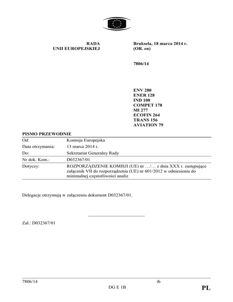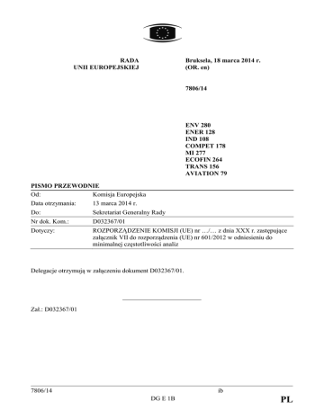 RADA UNII EUROPEJSKIEJ Bruksela, 18 marca 2014 r. (OR. en) 7806/14 ENV 280 ENER 128 IND 108 COMPET 178 MI 277 ECOFIN 264 TRANS 156 AVIATION 79 PISMO PRZEWODNIE Od: Komisja Europejska 13 marca 2014 r. Data otrzymania: Do: Sekretariat Generalny Rady Nr dok. Kom.: D032367/01 Dotyczy: ROZPORZĄDZENIE KOMISJI (UE) nr …/… z dnia XXX r. zastępujące załącznik VII do rozporządzenia (UE) nr 601/2012 w odniesieniu do minimalnej częstotliwości analiz Delegacje otrzymują w załączeniu dokument D032367/01. Zał.: D032367/01 7806/14 ib DG E 1B PL KOMISJA EUROPEJSKA Bruksela, dnia XXX r. D032367/1 […](2014) XXX draft ROZPORZĄDZENIE KOMISJI (UE) nr …/… z dnia XXX r. zastępujące załącznik VII do rozporządzenia (UE) nr 601/2012 w odniesieniu do minimalnej częstotliwości analiz (Tekst mający znaczenie dla EOG) PL PL ROZPORZĄDZENIE KOMISJI (UE) nr …/… z dnia XXX r. zastępujące załącznik VII do rozporządzenia (UE) nr 601/2012 w odniesieniu do minimalnej częstotliwości analiz (Tekst mający znaczenie dla EOG) KOMISJA EUROPEJSKA, uwzględniając Traktat o funkcjonowaniu Unii Europejskiej, uwzględniając dyrektywę 2003/87/WE Parlamentu Europejskiego i Rady z dnia 13 października 2003 r. ustanawiającą system handlu przydziałami emisji gazów cieplarnianych we Wspólnocie oraz zmieniającą dyrektywę Rady 96/61/WE 1, w szczególności jej art. 14 ust. 1, a także mając na uwadze, co następuje: (1) W załączniku VII do rozporządzenia Komisji (UE) nr 601/2012 2 określono minimalną częstotliwość analiz odnośnych paliw i materiałów, która ma być stosowana przez prowadzących instalacje w celu wyznaczania współczynników obliczeniowych. (2) Art. 35 rozporządzenia (UE) nr 601/2012 stanowi, że załącznik VII do tego rozporządzenia ma być poddawany regularnie przeglądowi, po raz pierwszy nie później niż dwa lata po wejściu w życie rozporządzenia (UE) nr 601/2012. (3) Załącznik VII do rozporządzenia (UE) nr 601/2012 należy zmienić, aby wyjaśnić klasyfikację i kategoryzację paliw i materiałów w nim wymienionych w celu poprawy spójności w zakresie stosowania odnośnych współczynników wykorzystywanych do obliczania emisji. (4) W celu zachowania przejrzystości należy zastąpić załącznik VII do rozporządzenia (UE) nr 601/2012. (5) Należy zatem odpowiednio zmienić rozporządzenie (UE) nr 601/2012. (6) Środki przewidziane w niniejszym rozporządzeniu są zgodne z opinią Komitetu ds. Zmian Klimatu, 1 Dz.U. L 275 z 25.10.2003, s. 32. Rozporządzenie Komisji (UE) nr 601/2012 z dnia 21 czerwca 2012 r. w sprawie monitorowania i raportowania w zakresie emisji gazów cieplarnianych zgodnie z dyrektywą 2003/87/WE Parlamentu Europejskiego i Rady (Dz.U. L 181 z 12.7.2012, s. 30). 2 PL 2 PL PRZYJMUJE NINIEJSZE ROZPORZĄDZENIE: Artykuł 1 Załącznik VII do rozporządzenia (UE) nr 601/2012 zastępuje się tekstem znajdującym się w załączniku do niniejszego rozporządzenia. Artykuł 2 Niniejsze rozporządzenie wchodzi w życie dwudziestego dnia po jego opublikowaniu w Dzienniku Urzędowym Unii Europejskiej. Niniejsze rozporządzenie wiąże w całości i jest bezpośrednio stosowane we wszystkich państwach członkowskich. Sporządzono w Brukseli dnia […] r. W imieniu Komisji Przewodniczący José Manuel BARROSO PL 3 PL