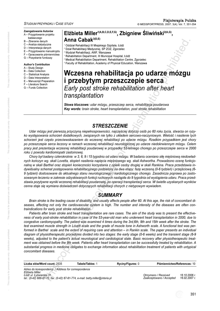 Fizjoterapia Polska STUDIUM PRZYPADKU / CASE STUDY 1 Oddzia³ Rehabilitacji III Miejskiego Szpitala, £ódŸ Dzia³ Rehabilitacji Medycznej, SP ZOZ, Zgorzelec 3 Wydzia³ Rehabilitacji, AWF, Warszawa 1 Rehabilitation Department, III Municipal Hospital, £ódŸ 2 Medical Rehabilitation Department, Rehabilitation Centre, Zgorzelec 3 Faculty of Rehabilitation, Academy of Physical Education, Warszawa tio np roh ibit 2 Author’s Contribution A – Study Design B – Data Collection C – Statistical Analysis D – Data Interpretation E – Manuscript Preparation F – Literature Search G – Funds Collection Wczesna rehabilitacja po udarze mózgu i przebytym przeszczepie serca Early post stroke rehabilitation after heart transplantation ibu -d istr STRESZCZENIE on al us eo nly Udar mózgu jest pierwsz¹ przyczyn¹ niepe³nosprawnoœci, najczêœciej dotyczy osób po 60 roku ¿ycia, stwarza on ryzyko wystêpowania schorzeñ dodatkowych, zwi¹zanych nie tylko z uk³adem sercowo-naczyniowym. Wieloœæ i nasilenie tych schorzeñ jest czêsto przeciwwskazaniem do wczesnej rehabilitacji po udarze mózgu. Rzadkim przypadkiem jest chory po przeszczepie serca leczony w ramach wczesnej rehabilitacji neurologicznej po udarze niedokrwiennym mózgu. Celem pracy jest prezentacja wczesnej rehabilitacji poudarowej w przypadku 53-letniego chorego po przeszczepie serca w 2000 roku z powodu kardiomiopatii zastoinowej. Chory by³ badany czterokrotnie: w 3, 6, 9 i 15 tygodniu od udaru mózgu. W badaniu oceniano si³ê miêœniow¹ niedow³adnych koñczyn wg. skali Lovetta, stopieñ nasilenia napiêcia miêœniowego wg. skali Ashwortha. Prowadzono ocenê funkcjonaln¹ w skali Barthel oraz stopieñ koniecznoœci korzystania z opieki osoby drugiej w skali Rankina. Praca przedstawia indywidualny schemat postêpowania rehabilitacyjnego podzielony na dwa etapy: fazê wczesn¹ (0-6 tydzieñ) i przejœciow¹ (69 tydzieñ) dostosowane do aktualnego stanu neurologicznego i kardiologicznego chorego. Zasadnicza poprawa po zastosowanym leczeniu w zakresie odzyskiwanych funkcji ruchowych nast¹pi³a do 9 tygodnia od wyst¹pienia udaru. Praca przedstawia pozytywne wyniki wczesnej rehabilitacji poudarowej, po operacji transplantacji serca. W œwietle uzyskanych wyników cenna staje siê wymiana doœwiadczeñ dotycz¹cych rehabilitacji chorych z nietypowym wywiadem. pe rs SUMMARY is c op y is for Brain stroke is the leading cause of disability, and usually affects people after 60. At this age, the risk of concomitant diseases, affecting not only the cardiovascular system is high. The number and intensity of the diseases are often contraindications for early post stroke rehabilitation. Patients after brain stroke and heart transplantation are rare cases. The aim of the study was to present the effectiveness of early post-stroke rehabilitation in case of the 53-year-old man who underwent heart transplantation in 2000, due to congestive cardiomyopathy. The patient was examined 4 times during the 3rd,6th, 9th and 15th week after the stroke. The test examined muscle strength in Lovett scale and the grade of muscle tone in Ashworth scale. A functional test was performed in Barthel scale and the extent of requiring care and attention – in Rankin scale. The paper presents an individual diagram of physiotherapeutic procedures divided into two stages: the early stage (0-6 weeks) and the transient stage (6-9 weeks), adjusted to the patient's actual neurological and cardiological state. Basic recovery after physiotherapeutic treatment was obtained before the 9th week. Patients after heart transplantation can be successfully treated by rehabilitation. A substantial progress in medicine obligates to exchange information about rehabilitation treatment of patients with untypical concomitant diseases. Liczba s³ów/Word count: 2535 Tabele/Tables: 1 Adres do korespondencji / Address for correspondence El¿bieta Miller £ódŸ ul. £y¿wiarska 31 tel.: (0-42) 688-87-70, fax: (0-42) 67-61-774, e-mail: [email protected] Th This copy is for personal use only - distribution prohibited. This copy is for personal use only - distribution prohibited. - S³owa kluczowe: udar mózgu, przeszczep serca, rehabilitacja poudarowa Key words: brain stroke, heart transplantation, post stroke rehabilitation Ryciny/Figures: 0 Piœmiennictwo/References: 10 Otrzymano / Received Zaakceptowano / Accepted 18.10.2006 r. 16.02.2007 r. - This copy is for personal use only - distribution prohibited. ed . El¿bieta Miller1(A,B,C,D,E,F,G), Zbigniew Œliwiñski2(A,G), Anna Cabak3(D,E) Zaanga¿owanie Autorów A – Przygotowanie projektu badawczego B – Zbieranie danych C – Analiza statystyczna D – Interpretacja danych E – Przygotowanie manuskryptu F – Opracowanie piœmiennictwa G – Pozyskanie funduszy - This copy is for personal use only - distribution prohibited. - © MEDSPORTPRESS, 2007; 3(4); Vol. 7, 351-354 351 BACKGROUND Brain stroke most often concerns people over 60 [1,2,3, 4,5] and entails the risk of concomitant diseases. affecting not only the cardiovascular system. The number and intensity of such diseases is often contraindication for early rehabilitation after brain stroke [[6]. A history of cardiological or oncological conditions may be problematic, not only for disease qualification, but also for potential rehabilitation treatment. Patients after heart transplantation, undergoing early neurological rehabilitation treatment after ischemic brain stroke are rare cases. In Poland in 2004 105 heart transplantations were performed. Presently, in Poland, the results of heart transplantation are very good [7]. tio np roh ibit ed . WSTÊP Udar mózgu najczêœciej dotyczy osób po 60 roku ¿ycia [1,2,3,4,5], stwarza ryzyko wystêpowania dodatkowych schorzeñ, zwi¹zanych nie tylko z uk³adem sercowo-naczyniowym. Wieloœæ i nasilenie tych schorzeñ jest czêsto przeciwwskazaniem do wczesnej rehabilitacji po udarze mózgu [6]. Wspó³istniej¹cy obci¹¿ony wywi