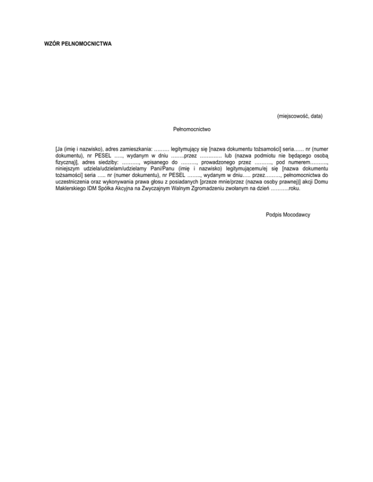WZÓR PEŁNOMOCNICTWA (miejscowość, data) Pełnomocnictwo [Ja (imię i nazwisko), adres zamieszkania: ……… legitymujący się [nazwa dokumentu tożsamości] seria…… nr (numer dokumentu), nr PESEL ….., wydanym w dniu ……..przez …………. lub (nazwa podmiotu nie będącego osobą fizyczną)], adres siedziby: ………., wpisanego do ………, prowadzonego przez ………., pod numerem………., niniejszym udziela/udzielam/udzielamy Pani/Panu (imię i nazwisko) legitymującemu/ej się [nazwa dokumentu tożsamości] seria ….. nr (numer dokumentu), nr PESEL …….., wydanym w dniu….. przez………, pełnomocnictwa do uczestniczenia oraz wykonywania prawa głosu z posiadanych [przeze mnie/przez (nazwa osoby prawnej)] akcji Domu Maklerskiego IDM Spółka Akcyjna na Zwyczajnym Walnym Zgromadzeniu zwołanym na dzień ………..roku. Podpis Mocodawcy