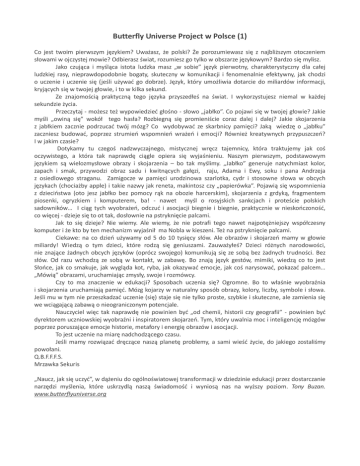 Butterfly Universe Project w Polsce (1) Co jest twoim pierwszym językiem? Uważasz, że polski? Że porozumiewasz się z najbliższym otoczeniem słowami w ojczystej mowie? Odbierasz świat, rozumiesz go tylko w obszarze językowym? Bardzo się mylisz. Jako czująca i myśląca istota ludzka masz „w sobie” język pierwotny, charakterystyczny dla całej ludzkiej rasy, nieprawdopodobnie bogaty, skuteczny w komunikacji i fenomenalnie efektywny, jak chodzi o uczenie i uczenie się (jeśli używać go dobrze). Język, który umożliwia dotarcie do miliardów informacji, kryjących się w twojej głowie, i to w kilka sekund. Ze znajomością praktyczną tego języka przyszedłeś na świat. I wykorzystujesz niemal w każdej sekundzie życia. Przeczytaj - możesz też wypowiedzieć głośno - słowo „jabłko”. Co pojawi się w twojej głowie? Jakie myśli „owiną się” wokół tego hasła? Rozbiegną się promieniście coraz dalej i dalej? Jakie skojarzenia z jabłkiem zacznie podrzucać twój mózg? Co wydobywać ze skarbnicy pamięci? Jaką wiedzę o „jabłku” zaczniesz budować, poprzez strumień wspomnień wrażeń i emocji? Również kreatywnych przypuszczeń? I w jakim czasie? Dotykamy tu czegoś nadzwyczajnego, mistycznej wręcz tajemnicy, która traktujemy jak coś oczywistego, a która tak naprawdę ciągle opiera się wyjaśnieniu. Naszym pierwszym, podstawowym językiem są wielozmysłowe obrazy i skojarzenia – bo tak myślimy. „Jabłko” generuje natychmiast kolor, zapach i smak, przywodzi obraz sadu i kwitnących gałęzi, raju, Adama i Ewy, soku i pana Andrzeja z osiedlowego straganu. Zamigocze w pamięci urodzinowa szarlotka, cydr i stosowne słowa w obcych językach (chociażby apple) i takie nazwy jak reneta, makintosz czy „papierówka”. Pojawią się wspomnienia z dzieciństwa (oto jesz jabłko bez pomocy rąk na obozie harcerskim), skojarzenia z grdyką, fragmentem piosenki, ogryzkiem i komputerem, ba! - nawet myśl o rosyjskich sankcjach i proteście polskich sadowników… I ciąg tych wyobrażeń, odczuć i asocjacji biegnie i biegnie, praktycznie w nieskończoność, co więcej - dzieje się to ot tak, dosłownie na pstryknięcie palcami. Jak to się dzieje? Nie wiemy. Ale wiemy, że nie potrafi tego nawet najpotężniejszy współczesny komputer i że kto by ten mechanizm wyjaśnił ma Nobla w kieszeni. Też na pstryknięcie palcami. Ciekawe: na co dzień używamy od 5 do 10 tysięcy słów. Ale obrazów i skojarzeń mamy w głowie miliardy! Wiedzą o tym dzieci, które rodzą się geniuszami. Zauważyłeś? Dzieci różnych narodowości, nie znające żadnych obcych języków (oprócz swojego) komunikują się ze sobą bez żadnych trudności. Bez słów. Od razu wchodzą ze sobą w kontakt, w zabawę. Bo znają język gestów, mimiki, wiedzą co to jest Słońce, jak co smakuje, jak wygląda kot, ryba, jak okazywać emocje, jak coś narysować, pokazać palcem… „Mówią” obrazami, uruchamiając zmysły, swoje i rozmówcy. Czy to ma znaczenie w edukacji? Sposobach uczenia się? Ogromne. Bo to właśnie wyobraźnia i skojarzenia uruchamiają pamięć. Mózg kojarzy w naturalny sposób obrazy, kolory, liczby, symbole i słowa. Jeśli mu w tym nie przeszkadzać uczenie (się) staje się nie tylko proste, szybkie i skuteczne, ale zamienia się we wciągającą zabawą o nieograniczonym potencjale. Nauczyciel więc tak naprawdę nie powinien być „od chemii, historii czy geografii” - powinien być dyrektorem uczniowskiej wyobraźni i inspiratorem skojarzeń. Tym, który uwalnia moc i inteligencję mózgów poprzez poruszające emocje historie, metafory i energię obrazów i asocjacji. To jest uczenie na miarę nadchodzącego czasu. Jeśli mamy rozwiązać dręczące naszą planetę problemy, a sami wieść życie, do jakiego zostaliśmy powołani. Q.B.F.F.F.S. Mrzawka Sekuris „Naucz, jak się uczyć”, w dążeniu do ogólnoświatowej transformacji w dziedzinie edukacji przez dostarczanie narzędzi myślenia, które uskrzydlą naszą świadomość i wyniosą nas na wyższy poziom. Tony Buzan. www.butterflyuniverse.org
