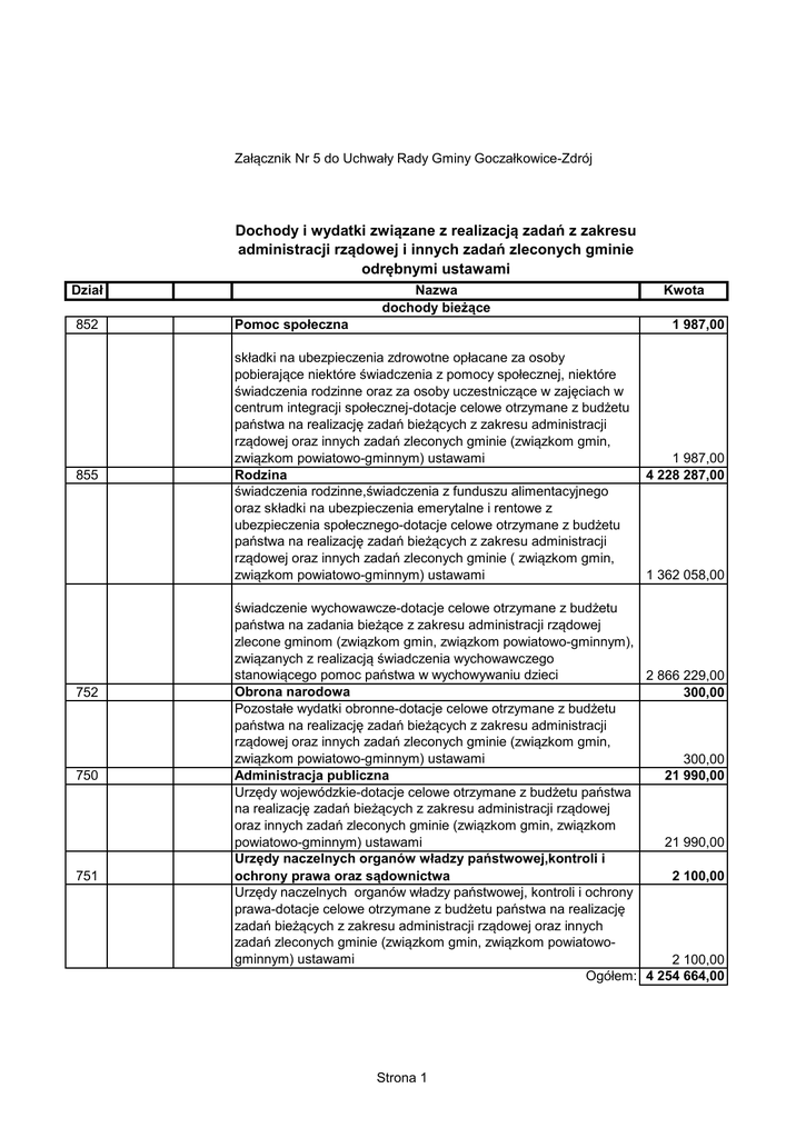 Załącznik Nr 5 do Uchwały Rady Gminy Goczałkowice-Zdrój Dochody i wydatki związane z realizacją zadań z zakresu administracji rządowej i innych zadań zleconych gminie odrębnymi ustawami Dział 852 855 752 750 751 Nazwa dochody bieżące Pomoc społeczna Kwota 1 987,00 składki na ubezpieczenia zdrowotne opłacane za osoby pobierające niektóre świadczenia z pomocy społecznej, niektóre świadczenia rodzinne oraz za osoby uczestniczące w zajęciach w centrum integracji społecznej-dotacje celowe otrzymane z budżetu państwa na realizację zadań bieżących z zakresu administracji rządowej oraz innych zadań zleconych gminie (związkom gmin, związkom powiatowo-gminnym) ustawami Rodzina świadczenia rodzinne,świadczenia z funduszu alimentacyjnego oraz składki na ubezpieczenia emerytalne i rentowe z ubezpieczenia społecznego-dotacje celowe otrzymane z budżetu państwa na realizację zadań bieżących z zakresu administracji rządowej oraz innych zadań zleconych gminie ( związkom gmin, związkom powiatowo-gminnym) ustawami 1 987,00 4 228 287,00 1 362 058,00 świadczenie wychowawcze-dotacje celowe otrzymane z budżetu państwa na zadania bieżące z zakresu administracji rządowej zlecone gminom (związkom gmin, związkom powiatowo-gminnym), związanych z realizacją świadczenia wychowawczego stanowiącego pomoc państwa w wychowywaniu dzieci 2 866 229,00 Obrona narodowa 300,00 Pozostałe wydatki obronne-dotacje celowe otrzymane z budżetu państwa na realizację zadań bieżących z zakresu administracji rządowej oraz innych zadań zleconych gminie (związkom gmin, związkom powiatowo-gminnym) ustawami 300,00 Administracja publiczna 21 990,00 Urzędy wojewódzkie-dotacje celowe otrzymane z budżetu państwa na realizację zadań bieżących z zakresu administracji rządowej oraz innych zadań zleconych gminie (związkom gmin, związkom powiatowo-gminnym) ustawami 21 990,00 Urzędy naczelnych organów władzy państwowej,kontroli i ochrony prawa oraz sądownictwa 2 100,00 Urzędy naczelnych organów władzy państwowej, kontroli i ochrony prawa-dotacje celowe otrzymane z budżetu państwa na realizację zadań bieżących z zakresu administracji rządowej oraz innych zadań zleconych gminie (związkom gmin, związkom powiatowogminnym) ustawami 2 100,00 Ogółem: 4 254 664,00 Strona 1 WYDATKI: Dział Rozdział 852 85213 855 85501 85502 752 75212 750 75011 751 75101 Nazwa wydatki bieżące Kwota Pomoc społeczna składki na ubezpieczenia zdrowotne opłacane za osoby pobierające niektóre świadczenia z pomocy społecznej, niektóre świadczenia rodzinne oraz za osoby uczestniczące w zajęciach w centrum integracji społecznej wydatki związane z realizacją zadań statutowych jednostek budżetowych Rodzina świadczenie wychowawcze świadczenia na rzecz osób fizycznych wynagrodzenia i składki od nich naliczane wydatki związane z realizacją zadań statutowych jednostek budżetowych świadczenia rodzinne,świadczenia z funduszu alimentacyjnego oraz składki na ubezpieczenia emerytalne i rentowe z ubezpieczenia społecznego świadczenia na rzecz osób fizycznych wynagrodzenia i składki od nich naliczane Obrona narodowa Pozostałe wydatki obronne wydatki związane z realizacją zadań statutowych jednostek budżetowych Administracja publiczna Urzędy wojewódzkie wynagrodzenia i składki od nich naliczane wydatki związane z realizacją zadań statutowych jednostek budżetowych Urzędy naczelnych organów władzy państwowej, kontroli i ochrony prawa oraz sądownictwa Urzędy naczelnych organów władzy państwowej kontroli i ochrony prawa wynagrodzenia i składki od nich naliczane 1 987,00 1 987,00 1 987,00 4 228 287,00 2 866 229,00 2 823 871,00 31 980,00 10 378,00 1 362 058,00 1 278 021,00 84 037,00 300,00 300,00 300,00 21 990,00 21 990,00 21 615,00 375,00 2 100,00 2 100,00 2 100,00 Ogółem: 4 254 664,00 Plan dochodów budżetu państwa związany z realizacją zadań zleconych gminie Dział rozdział 750 855 Nazwa dochody bieżące kwota Administracja publiczna wpływy z różnych opłat 59,00 59,00 15 218,00 Rodzina wpływy z tytułu zwrotów wypłaconych świadczeń z funduszu alimentacyjnego różnych dochodów wpływy z tytułu wydania duplikatu karty rodziny wielodzietnej Strona 2 15 200,00 18,00