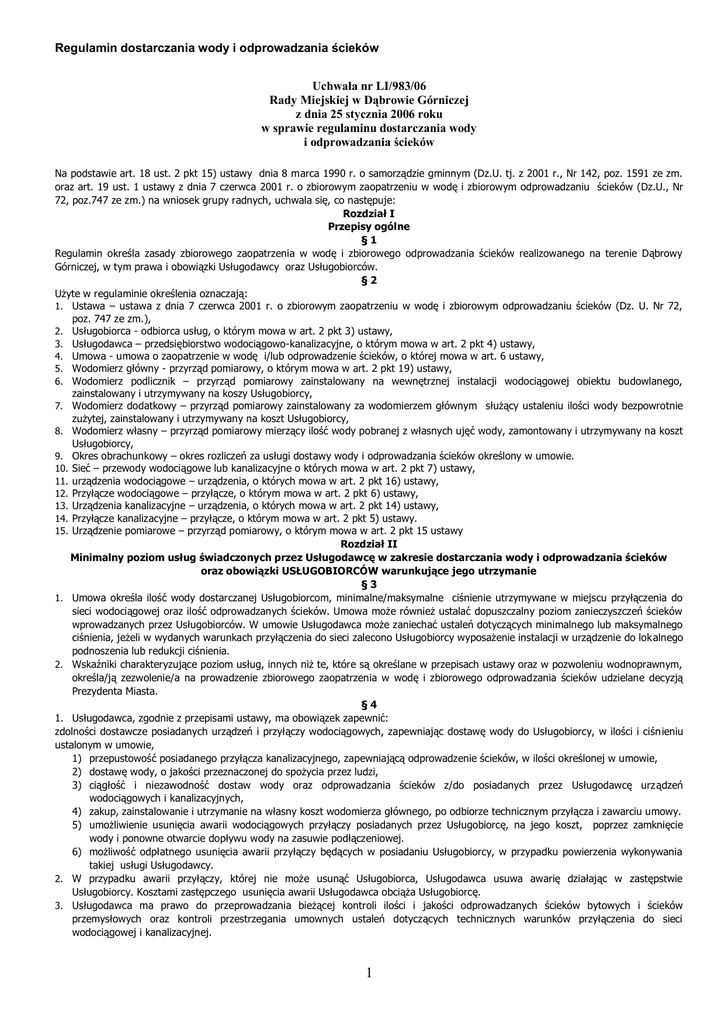Regulamin dostarczania wody i odprowadzania ścieków Uchwała nr LI/983/06 Rady Miejskiej w Dąbrowie Górniczej z dnia 25 stycznia 2006 roku w sprawie regulaminu dostarczania wody i odprowadzania ścieków Na podstawie art. 18 ust. 2 pkt 15) ustawy dnia 8 marca 1990 r. o samorządzie gminnym (Dz.U. tj. z 2001 r., Nr 142, poz. 1591 ze zm. oraz art. 19 ust. 1 ustawy z dnia 7 czerwca 2001 r. o zbiorowym zaopatrzeniu w wodę i zbiorowym odprowadzaniu ścieków (Dz.U., Nr 72, poz.747 ze zm.) na wniosek grupy radnych, uchwala się, co następuje: Rozdział I Przepisy ogólne §1 Regulamin określa zasady zbiorowego zaopatrzenia w wodę i zbiorowego odprowadzania ścieków realizowanego na terenie Dąbrowy Górniczej, w tym prawa i obowiązki Usługodawcy oraz Usługobiorców. §2 Użyte w regulaminie określenia oznaczają: 1. Ustawa – ustawa z dnia 7 czerwca 2001 r. o zbiorowym zaopatrzeniu w wodę i zbiorowym odprowadzaniu ścieków (Dz. U. Nr 72, poz. 747 ze zm.), 2. Usługobiorca - odbiorca usług, o którym mowa w art. 2 pkt 3) ustawy, 3. Usługodawca – przedsiębiorstwo wodociągowo-kanalizacyjne, o którym mowa w art. 2 pkt 4) ustawy, 4. Umowa - umowa o zaopatrzenie w wodę i/lub odprowadzenie ścieków, o której mowa w art. 6 ustawy, 5. Wodomierz główny - przyrząd pomiarowy, o którym mowa w art. 2 pkt 19) ustawy, 6. Wodomierz podlicznik – przyrząd pomiarowy zainstalowany na wewnętrznej instalacji wodociągowej obiektu budowlanego, zainstalowany i utrzymywany na koszy Usługobiorcy, 7. Wodomierz dodatkowy – przyrząd pomiarowy zainstalowany za wodomierzem głównym służący ustaleniu ilości wody bezpowrotnie zużytej, zainstalowany i utrzymywany na koszt Usługobiorcy, 8. Wodomierz własny – przyrząd pomiarowy mierzący ilość wody pobranej z własnych ujęć wody, zamontowany i utrzymywany na koszt Usługobiorcy, 9. Okres obrachunkowy – okres rozliczeń za usługi dostawy wody i odprowadzania ścieków określony w umowie. 10. Sieć – przewody wodociągowe lub kanalizacyjne o których mowa w art. 2 pkt 7) ustawy, 11. urządzenia wodociągowe – urządzenia, o których mowa w art. 2 pkt 16) ustawy, 12. Przyłącze wodociągowe – przyłącze, o którym mowa w art. 2 pkt 6) ustawy, 13. Urządzenia kanalizacyjne – urządzenia, o których mowa w art. 2 pkt 14) ustawy, 14. Przyłącze kanalizacyjne – przyłącze, o którym mowa w art. 2 pkt 5) ustawy. 15. Urządzenie pomiarowe – przyrząd pomiarowy, o którym mowa w art. 2 pkt 15 ustawy Rozdział II Minimalny poziom usług świadczonych przez Usługodawcę w zakresie dostarczania wody i odprowadzania ścieków oraz obowiązki USŁUGOBIORCÓW warunkujące jego utrzymanie §3 1. Umowa określa ilość wody dostarczanej Usługobiorcom, minimalne/maksymalne ciśnienie utrzymywane w miejscu przyłączenia do sieci wodociągowej oraz ilość odprowadzanych ścieków. Umowa może również ustalać dopuszczalny poziom zanieczyszczeń ścieków wprowadzanych przez Usługobiorców. W umowie Usługodawca może zaniechać ustaleń dotyczących minimalnego lub maksymalnego ciśnienia, jeżeli w wydanych warunkach przyłączenia do sieci zalecono Usługobiorcy wyposażenie instalacji w urządzenie do lok alnego podnoszenia lub redukcji ciśnienia. 2. Wskaźniki charakteryzujące poziom usług, innych niż te, które są określane w przepisach ustawy oraz w pozwoleniu wodnoprawnym, określa/ją zezwolenie/a na prowadzenie zbiorowego zaopatrzenia w wodę i zbiorowego odprowadzania ścieków udzielane decyzją Prezydenta Miasta. §4 1. Usługodawca, zgodnie z przepisami ustawy, ma obowiązek zapewnić: zdolności dostawcze posiadanych urządzeń i przyłączy wodociągowych, zapewniając dostawę wody do Usługobiorcy, w ilości i ciśn ieniu ustalonym w umowie, 1) przepustowość posiadanego przyłącza kanalizacyjnego, zapewniającą odprowadzenie ścieków, w ilości określonej w umowie, 2) dostawę wody, o jakości przeznaczonej do spożycia przez ludzi, 3) ciągłość i niezawodność dostaw wody oraz odprowadzania ścieków z/do posiadanych przez Usługodawcę urz ądzeń wodociągowych i kanalizacyjnych, 4) zakup, zainstalowanie i utrzymanie na własny koszt wodomierza głównego, po odbiorze technicznym przyłącza i zawarciu umowy. 5) umożliwienie usunięcia awarii wodociągowych przyłączy posiadanych przez Usługobiorcę, na jego koszt, poprzez zamknięcie wody i ponowne otwarcie dopływu wody na zasuwie podłączeniowej. 6) możliwość odpłatnego usunięcia awarii przyłączy będących w posiadaniu Usługobiorcy, w przypadku powierzenia wykonywania takiej usługi Usługodawcy. 2. W przypadku awarii przyłączy, której nie może usunąć Usługobiorca, Usługodawca usuwa awarię działając w zastępstwie Usługobiorcy. Kosztami zastępczego usunięcia awarii Usługodawca obciąża Usługobiorcę. 3. Usługodawca ma prawo do przeprowadzania bieżącej kontroli ilości i jakości odprowadzanych ścieków bytowych i ścieków przemysłowych oraz kontroli przestrzegania umownych ustaleń dotyczących technicznych warunków przyłączenia do sieci wodociągowej i kanalizacyjnej. 1 4. W sytuacji wystąpienia awarii skutkującej zagrożeniem dla środowiska lub utratą mienia o znacznej wartości, Usługodawca ma prawo wejścia na teren, po którym przebiegają urządzania wodno – kanalizacyjne, celem natychmiastowego podjęcia działań. Po rzeprowadzonych pracach Usługodawca jest zobowiązany do przywrócenia terenu do stanu poprzedniego. §5 1. Usługobiorcy są zobowiązani do korzystania z zaopatrzenia w wodę i odprowadzania ścieków w sposób nie powodujący pogorszenia jakości usług świadczonych przez Usługodawcę, a w szczególności do: 1) utrzymania, eksploatacji i remontów posiadanych przyłączy, w tym także usuwania ich awarii 2) powierzenia usuwania awarii osobom posiadającym odpowiednie uprawnienia i kwalifikacje 3) natychmiastowego powiadomienia Usługodawcy ( fax, telefon ) o aw