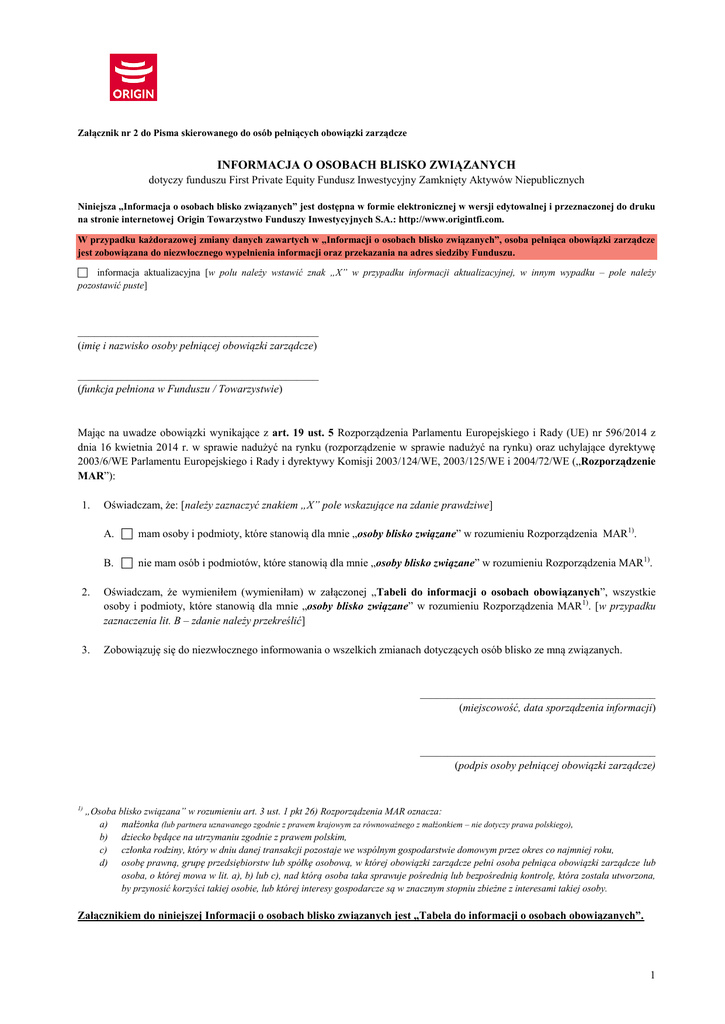 Załącznik nr 2 do Pisma skierowanego do osób pełniących obowiązki zarządcze INFORMACJA O OSOBACH BLISKO ZWIĄZANYCH dotyczy funduszu First Private Equity Fundusz Inwestycyjny Zamknięty Aktywów Niepublicznych Niniejsza „Informacja o osobach blisko związanych” jest dostępna w formie elektronicznej w wersji edytowalnej i przeznaczonej do druku na stronie internetowej Origin Towarzystwo Funduszy Inwestycyjnych S.A.: http://www.origintfi.com. W przypadku każdorazowej zmiany danych zawartych w „Informacji o osobach blisko związanych”, osoba pełniąca obowiązki zarządcze jest zobowiązana do niezwłocznego wypełnienia informacji oraz przekazania na adres siedziby Funduszu. informacja aktualizacyjna [w polu należy wstawić znak „X” w przypadku informacji aktualizacyjnej, w innym wypadku – pole należy pozostawić puste] ____________________________________________ (imię i nazwisko osoby pełniącej obowiązki zarządcze) ____________________________________________ (funkcja pełniona w Funduszu / Towarzystwie) Mając na uwadze obowiązki wynikające z art. 19 ust. 5 Rozporządzenia Parlamentu Europejskiego i Rady (UE) nr 596/2014 z dnia 16 kwietnia 2014 r. w sprawie nadużyć na rynku (rozporządzenie w sprawie nadużyć na rynku) oraz uchylające dyrektywę 2003/6/WE Parlamentu Europejskiego i Rady i dyrektywy Komisji 2003/124/WE, 2003/125/WE i 2004/72/WE („Rozporządzenie MAR”): 1. Oświadczam, że: [należy zaznaczyć znakiem „X” pole wskazujące na zdanie prawdziwe] A. mam osoby i podmioty, które stanowią dla mnie „osoby blisko związane” w rozumieniu Rozporządzenia MAR1). B. nie mam osób i podmiotów, które stanowią dla mnie „osoby blisko związane” w rozumieniu Rozporządzenia MAR1). 2. Oświadczam, że wymieniłem (wymieniłam) w załączonej „Tabeli do informacji o osobach obowiązanych”, wszystkie osoby i podmioty, które stanowią dla mnie „osoby blisko związane” w rozumieniu Rozporządzenia MAR1). [w przypadku zaznaczenia lit. B – zdanie należy przekreślić] 3. Zobowiązuję się do niezwłocznego informowania o wszelkich zmianach dotyczących osób blisko ze mną związanych. ___________________________________________ (miejscowość, data sporządzenia informacji) ___________________________________________ (podpis osoby pełniącej obowiązki zarządcze) 1) „Osoba blisko związana” w rozumieniu art. 3 ust. 1 pkt 26) Rozporządzenia MAR oznacza: a) małżonka (lub partnera uznawanego zgodnie z prawem krajowym za równoważnego z małżonkiem – nie dotyczy prawa polskiego), b) dziecko będące na utrzymaniu zgodnie z prawem polskim, c) członka rodziny, który w dniu danej transakcji pozostaje we wspólnym gospodarstwie domowym przez okres co najmniej roku, d) osobę prawną, grupę przedsiębiorstw lub spółkę osobową, w której obowiązki zarządcze pełni osoba pełniąca obowiązki zarządcze lub osoba, o której mowa w lit. a), b) lub c), nad którą osoba taka sprawuje pośrednią lub bezpośrednią kontrolę, która została utworzona, by przynosić korzyści takiej osobie, lub której interesy gospodarcze są w znacznym stopniu zbieżne z interesami takiej osoby. Załącznikiem do niniejszej Informacji o osobach blisko związanych jest „Tabela do informacji o osobach obowiązanych”. 1
