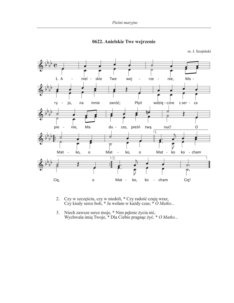 Pieśni maryjne 0622. Anielskie Twe wejrzenie m. J. Szopiński 1. A - niel - skie Twe wej - rze - nie, Ma - ry - jo, na mnie zwróć; Płyń wdzię - czne z ser - ca pie - nie, Ma du - szo, pieśń twą nuć! O Mat - ko, o Mat - ko, o Mat - ko ko - cham Cię, o Mat - ko, ko - cham Cię! 2. Czy w szczęściu, czy w niedoli, * Czy radość czuję wraz, Czy kiedy serce boli, * Ja wołam w każdy czas; * O Matko... 3. Niech zawsze serce moje, * Nim pęknie życia nić, Wychwala imię Twoje, * Dla Ciebie pragnąc żyć. * O Matko...