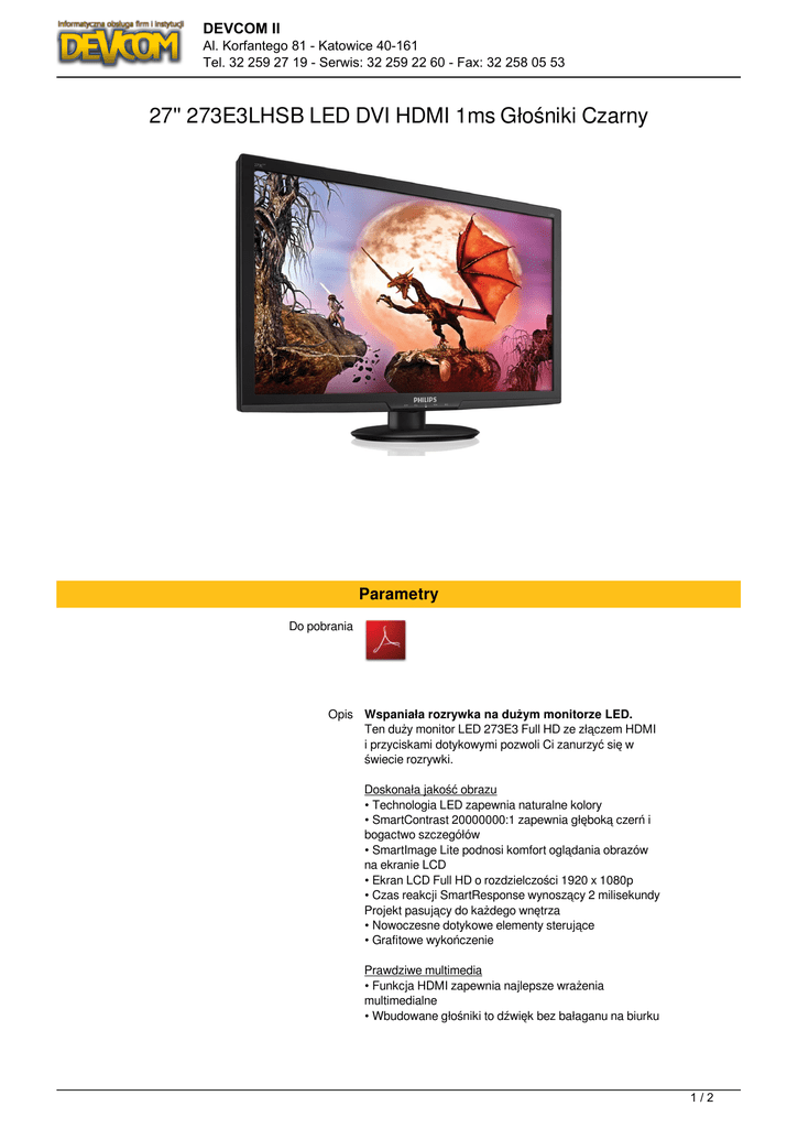 DEVCOM II Al. Korfantego 81 - Katowice 40-161 Tel. 32 259 27 19 - Serwis: 32 259 22 60 - Fax: 32 258 05 53 27'' 273E3LHSB LED DVI HDMI 1ms Głośniki Czarny Parametry Do pobrania Opis Wspaniała rozrywka na dużym monitorze LED. Ten duży monitor LED 273E3 Full HD ze złączem HDMI i przyciskami dotykowymi pozwoli Ci zanurzyć się w świecie rozrywki. Doskonała jakość obrazu • Technologia LED zapewnia naturalne kolory • SmartContrast 20000000:1 zapewnia głęboką czerń i bogactwo szczegółów • SmartImage Lite podnosi komfort oglądania obrazów na ekranie LCD • Ekran LCD Full HD o rozdzielczości 1920 x 1080p • Czas reakcji SmartResponse wynoszący 2 milisekundy Projekt pasujący do każdego wnętrza • Nowoczesne dotykowe elementy sterujące • Grafitowe wykończenie Prawdziwe multimedia • Funkcja HDMI zapewnia najlepsze wrażenia multimedialne • Wbudowane głośniki to dźwięk bez bałaganu na biurku 1/2 DEVCOM II Al. Korfantego 81 - Katowice 40-161 Tel. 32 259 27 19 - Serwis: 32 259 22 60 - Fax: 32 258 05 53 Duża wygoda • Łatwe dostrajanie parametrów wyświetlania dzięki SmartControl Lite • Łatwe sterowanie formatem obrazu dzięki funkcji przełączania między trybem panoramicznym i formatem 4:3 Model 273E3LHSB Format ekranu Przekątna ekranu Typ matrycy Ekran dotykowy Technologia podświetlania Obszar widzialny Panoramiczny 27" TFT-TN Nie Diody LED 597,6 (poz.) x 336,2 (pion.) mm Plamka matrycy 0.311 Rozdzielczość 1920 x 1080 (HD 1080) Czas reakcji 3.5 Jasność 300 Częstotliwość pozioma 30–83 kHz Częstotliwość pionowa 56–75 Hz Kąt widzenia poziomy 178 Kąt widzenia pionowy 170 Ilość kolorów Gniazda we/wy Gniazda we/wy Gniazda we/wy Wbudowane głośniki Pivot Standard VESA Pobór mocy 16,7 mln 1 x 15-pin D-Sub 1 x DVI-D 1 x HDMI Tak Nie 100 x 100 20.4 Wymiary 642 x 391 x 64 mm Waga 6.5 Wbudowany tuner TV Nie 2/2 Powered by TCPDF (www.tcpdf.org)