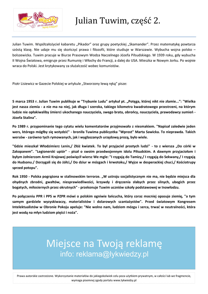 Julian Tuwim, część 2. Julian Tuwim. Współzałożyciel kabaretu „Pikador” oraz grupy poetyckiej „Skamander”. Przez matematykę powtarza szóstą klasę. Nie udaje mu się skooczyd prawa i filozofii, które studiuje w Warszawie. Wybucha wojna polsko – bolszewicka. Tuwim pracuje w Biurze Prasowym Wodza Naczelnego Józefa Piłsudskiego. W 1939 roku, gdy wybucha II Wojna Światowa, emigruje przez Rumunię i Włochy do Francji, a dalej do USA. Mieszka w Nowym Jorku. Po wojnie wraca do Polski. Jest krytykowany za służalczośd wobec komunistów. Piotr Lisiewicz w Gazecie Polskiej w artykule „Stworzony lewą ręką” pisze: 5 marca 1953 r. Julian Tuwim publikuje w "Trybunie Ludu" artykuł pt. „Potęga, której nikt nie złamie...”: "Wielka jest nasza ziemia - a nie ma na niej, jak długa i szeroka, takiego kilometra kwadratowego przestrzeni, na którym ludzie nie opłakiwaliby śmierci ukochanego nauczyciela, swego brata, obroocy, nauczyciela, prawodawcy sumieo Józefa Stalina". Po 1989 r. przypominanie tego cytatu wielu komentatorów przyjmowało z niesmakiem. "Napisał zaledwie jeden wers, którego mógłby się wstydzid" - broniła Tuwima publicystka "Wprost" Marta Sawicka. To nieprawda. Takich wersów - zarówno tych rymowanych, jak i wygłaszanych urzędową prozą, było wiele. "Gdzie mieszkał Włodzimierz Lenin,/ Złóż kwiatek. To był przyjaciel prostych ludzi" - to z wiersza „Do córki w Zakopanem”. "Legionerski upiór" - pisał o swoim przedwojennym idolu Piłsudskim. A dawnym przyjaciołom i byłym żołnierzom Armii Krajowej poświęcił wiersz We mgle: "I rzygają do Tamizy,/ I rzygają do Sekwany,/ I rzygają do Hudsonu./ Dorzygali się do żółci,/ Do dziur w mózgach i krwotoku,/ Wyjce w desperackiej chuci,/ Kościotrupy sprzed potopu". Rok 1950 - Polska pogrążona w stalinowskim terrorze. „W ustroju socjalistycznym nie ma, nie będzie miejsca dla ohydnych zbrodni, gwałtów, niesprawiedliwości, krzywdy i dręczenia słabych przez silnych, ubogich przez bogatych, miłosiernych przez okrutnych" - przekonuje Tuwim uczniów szkoły podstawowej w Inowłodzu. Po połączeniu PPR i PPS w PZPR mówi o polskim ogniwie łaocucha, który coraz mocniej opasuje ziemię, "a tym samym gardziele wyzyskiwaczy, materialistów i dolarowych szantażystów". Przed światowym Kongresem Intelektualistów w Obronie Pokoju apeluje: "Nie wolno nam, ludziom mózgu i serca, trwad w neutralności, która jest wodą na młyn ludziom pięści i noża". Prawa autorskie zastrzeżone. Wykorzystanie materiałów do jakiegokolwiek celu poza użytkiem prywatnym, w całości lub we fragmencie, wymaga pisemnej zgody portalu www.lykwiedzy.pl Gdy do Warszawy przyjechał Aleksander Surkow, sekretarz generalny Związku Pisarzy ZSRR, na zebranie spędzono polskich pisarzy. Jak wspominał Aleksander Wat, nagle "(...) z pierwszego rzędu zrywa się wielki polski poeta, podbiega do grafomana-czekisty i w ekstazie klaszcze". Nie ze służalczości. Bo Tuwim "(...) był ekstatykiem (...) żył tylko chwilami tych uniesieo i tylko dzięki tym chwilom". Władza potrafiła odwdzięczyd się Tuwimowi. Nie szczędziła mu odznaczeo. Jak zauważa Bohdan Urbankowski w Czerwonej Mszy, najważniejszymi lekturami szkolnymi czasów stalinowskich były książki O Wielkim Stalinie oraz Soso. "W dalszej dopiero kolejności uwzględniane były takie dzieła, jak: „Murzynek Bambo” Tuwima, „Lenin wśród dzieci” Krzemienieckiej czy „Kaczka Dziwaczka” Brzechwy. Ta mieszanina wytwarzała w młodych umysłach przeświadczenie, iż Stalin jest kimś najważniejszym na świecie, ale już Lenin jest jakimś bytem pośrednim między Murzynkiem Bambo a Kaczką Dziwaczką. Na koniec - niestety nie w całości - ot, tak dla przyjemności. Najsłynniejszy wiersz jegomości Tuwima. Rzecz skandalizująca, która przyniosła mu popularnośd, czyli „Bal w operze”. Dzisiaj wielki bal w Operze. Sam Potężny Archikrator Dał najwyższy protektorat, Wszelka dziwka majtki pierze I na kredyt kiecki bierze, Na ulicach ścisk i zator, Ustawili się żołnierze, Błyszczą kaski kirasjerskie, Błyszczą buty oficerskie, Konie pienią się i rżą, Ryczą auta, tłumy prą, W kordegardzie wojska mrowie, Wszędzie ostre pogotowie, Prawa autorskie zastrzeżone. Wykorzystanie materiałów do jakiegokolwiek celu poza użytkiem prywatnym, w całości lub we fragmencie, wymaga pisemnej zgody portalu www.lykwiedzy.pl Niecierpliwe wina wrą, U fryzjerów ludzie mdleją, Czekający za koleją, Dziwkom łydki słodko drżą. Na afiszu - Archikrator, Więc na schodach marmurowych Leży chodnik purpurowy, Ustawiono oleandry, Ochrypł szef-organizator, Wyfraczony krępy mandryl, Klamki, zamki lśnią na glanc, W blasku las ułaoskich lanc, Szef policji pierś wysadza I spod marsa sypiąc skry, Prężnym krokiem się przechadza... Co za gracja! Co za władza! Co za pompa! Jezu Chry...! Zajeżdżają futra, fraki, Lśniące laki, szapoklaki, Uwijają się tajniaki W paltocikach Burberry. Szofer szofra macią ruga, Prawa autorskie zastrzeżone. Wykorzystanie materiałów do jakiegokolwiek celu poza użytkiem prywatnym, w całości lub we fragmencie, wymaga pisemnej zgody portalu www.lykwiedzy.pl Na tajniaka tajniak mruga... No jadź, jadź! bedziesz tu stad? Caf się, frrruwa twoja mad! Zajeżdżają gronostaje I brajtszwance, Barbarossy, oyenstierny I braganze, Zajeżdżają Buicki, Royce'y I Hispany, Wielkie wstęgi, śnieżne gorsy, Szambelany, I buldogi pełnomocne I terriery I burbony i szynszyle I ordery I sobole i gr and-diuki I goeringi, Akselbanty i lampasy I wikingi, Admirały, generały, Bojarowie, Bambirały, grubasowie, Am! Prawa autorskie zastrzeżone. Wykorzystanie materiałów do jakiegokolwiek celu poza użytkiem prywatnym, w całości lub we fragmencie, wymaga pisemnej zgody portalu www.lykwiedzy.pl Ba! Sado! Rowie ! Raz ! Dwa ! Hurra, panowie! Hurra, panowie! Hurra, panowie! W szatni tłok, W lustrach - setki, P