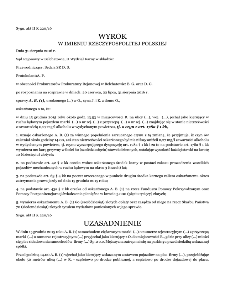 Sygn. akt II K 220/16 WYROK W IMIENIU RZECZYPOSPOLITEJ POLSKIEJ Dnia 31 sierpnia 2016 r. Sąd Rejonowy w Bełchatowie, II Wydział Karny w składzie: Przewodniczący: Sędzia SR D. S. Protokolant:A. P. w obecności Prokuratorów Prokuratury Rejonowej w Bełchatowie: B. G. oraz D. G. po rozpoznaniu na rozprawie w dniach: 20 czerwca, 22 lipca, 31 sierpnia 2016 r. sprawy A. B. (1), urodzonego (...) w O., syna J. i K. z domu O., oskarżonego o to, że: w dniu 15 grudnia 2015 roku około godz. 13.53 w miejscowości R. na ulicy (...), woj. (...), jechał jako kierujący w ruchu lądowym pojazdem marki (...) o nr rej. (...) z przyczepą (...) o nr rej. (...) znajdując się w stanie nietrzeźwości z zawartością 0,27 mg/l alkoholu w wydychanym powietrzu, tj. o czyn z art. 178a § 1 kk, 1. uznaje oskarżonego A. B. (1) za winnego popełnienia zarzucanego czynu z tą zmianą, że przyjmuje, iż czyn ów zaistniał około godziny 14.00, zaś stan nietrzeźwości oskarżonego był nie niższy aniżeli 0,27 mg/l zawartości alkoholu w wydychanym powietrzu, tj. czynu wyczerpującego dyspozycję art. 178a § 1 kk i za to na podstawie art. 178a § 1 kk wymierza mu karę grzywny w ilości 60 (sześćdziesięciu) stawek dziennych, ustalając wysokość każdej stawki na kwotę 10 (dziesięciu) złotych; 2. na podstawie art. 42 § 2 kk orzeka wobec oskarżonego środek karny w postaci zakazu prowadzenia wszelkich pojazdów mechanicznych w ruchu lądowym na okres 3 (trzech) lat; 3. na podstawie art. 63 § 4 kk na poczet orzeczonego w punkcie drugim środka karnego zalicza oskarżonemu okres zatrzymania prawa jazdy od dnia 15 grudnia 2015 roku; 4. na podstawie art. 43a § 2 kk orzeka od oskarżonego A. B. (1) na rzecz Funduszu Pomocy Pokrzywdzonym oraz Pomocy Postpenitencjarnej świadczenie pieniężne w kwocie 5.000 (pięciu tysięcy) złotych; 5. wymierza oskarżonemu A. B. (1) 60 (sześćdziesiąt) złotych opłaty oraz zasądza od niego na rzecz Skarbu Państwa 70 (siedemdziesiąt) złotych tytułem wydatków poniesionych w jego sprawie. Sygn. akt II K 220/16 UZASADNIENIE W dniu 15 grudnia 2015 roku A. B. (1) samochodem ciężarowym marki (...) o numerze rejestracyjnym (...) z przyczepą marki (...) o numerze rejestracyjnym (...) przyjechał jako kierujący z O. do miejscowości R., gdzie przy ulicy (...) mieści się plac składowania samochodów firmy (...) Sp. z o.o. Mężczyzna zatrzymał się na parkingu przed siedzibą wskazanej spółki. Przed godziną 14.00 A. B. (1) wjechał jako kierujący wskazanym zestawem pojazdów na plac firmy (...), przejeżdżając około 50 metrów ulicą (...) w R. - częściowo po drodze publicznej, a częściowo po drodze dojazdowej do placu. Następnie udał się do biura celem pobrania dokumentów upoważniających go do załadunku na lawetę trzech samochodów. Dokumenty te otrzymał od jednego z pracowników i rozpoczął załadunek. Po załadowaniu dwóch pojazdów, tj. po dokonaniu wjazdu nimi na lawetę, mężczyzna ponownie udał się do biura i zgłosił, że trzeci z samochodów nie mieści się na przyczepie. Kierownik ds. transportu krajowego firmy (...) - rozmawiał z nim, by ustalić możliwość załadunku trzeciego pojazdu. W pewnym momencie wyczuł on z ust A. B. (1) woń alkoholu. Ł. P. (1) zwrócił się z prośbą do kierownika placu, A. M. (1), o zbadanie stanu trzeźwości kierowcy z O.. Badanie owo przeprowadził A. M. (1), posługująca się urządzeniem typu alkomat. Asystował przy nim Ł. P. (1). Przeprowadzone badanie wykazało, że zawartość alkoholu w powietrzu wydychanym przez A. B. (1) wynosiła ponad 0,5 promila. Pracownicy firmy (...) byli bardzo zdziwieni tym, że w tak dużym stanie nietrzeźwości na plac wjechał kierowca ciężarówki. Zapytany o spożywanie alkoholu, A. B. (1), oświadczył, że poprzedniego dnia wieczorem wypił kilka piw. Ł. P. (1) przeraził się tym, iż w takim stanie mężczyzna ów kierował samochodem ciężarowym z przyczepą, pokonując drogę z O. do (...) R.. Około godziny 15.00 pracownicy spółki (...) wezwali na miejsce zdarzenia patrol policji. Do momentu przyjazdu funkcjonariuszy A. B. (1) nie spożywał żadnego alkoholu. /częściowo wyjaśnienia oskarżonego A. B. k. 12-13 zbioru A; zeznania świadka Ł. P. k. 7-8 zbioru C oraz k. 20 odwrót-21 akt II K 220/16; zeznania świadka A. M. k. 28-28 odwrót akt II K 220/16; notatka urzędowa k. 1 zbioru A / Po przyjeździe funkcjonariuszy policji na teren firmy (...), poddali oni A. B. (1) badaniu stanu trzeźwości na urządzeniu A.-Sensor IV. Badanie wykazało: w I pomiarze o godz. 15:42 - 0,27 mg/l zawartości alkoholu w wydychanym powietrzu, w II pomiarze o godz. 16:00 - 0,25 mg/l zawartości alkoholu w wydychanym powietrzu. Po ukończeniu czynności na miejscu zdarzenia policjanci wraz z A. B. (1) udali się do KPP w B., gdzie kierowca został poddany badaniu na urządzeniu Alkometr A 2.0 i uzyskał wyniki: o godz. 16:32 - 0,14 mg/l, o godz. 16:37 - 0,13 mg/l, o godz. 16:42 – 0,12 mg/l , o godz. 16:55 -0,10 mg/l i o godz. 17:25 - 0,06 mg/l - zawartości alkoholu w wydychanym powietrzu. /zeznania świadka K. K. k. 18-19 zbioru C oraz k. 26-26 odwrót akt II K 220/16; protokoły z przebiegu badania stanu trzeźwości urządzeniem elektronicznym k. 2- 4 zbioru A; świadectwa wzorcowania k. 5-6 zbioru A; opis techniczny i instrukcja obsługi A. k. 28-40 zbioru A; opis techniczny i instrukcja obsługi A.-Sensora k. 41-60 zbioru A/ A. B. (1) posiada wykształcenie średnie - mechanik pojazdów samochodowych. Jest rozwiedziony. Na utrzymaniu posiada jedno dziecko w wieku 13 lat, wobec którego ciąży na nim obowiązek alimentacyjny w kwocie 390 złotych miesięcznie. Obecnie jest on osobą bezrobotną. Przyznano mu zasiłek dla bezrobotnych w wysokości 600 złotych miesięcznie. Oskarżony posiada prawo jazdy kategorii B, C, E. /oświadczenie oskarżonego A. B. (1) k. 20 akt II K 220/16; wyjaśnienia oskarżonego A. B. (1) k. 20 odwrót;
