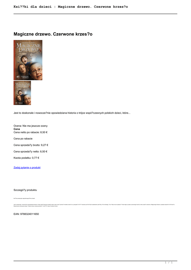 Ksi??ki dla dzieci : Magiczne drzewo. Czerwone krzes?o Magiczne drzewo. Czerwone krzes?o Jest to doskonale i nowocze?nie opowiedziana historia o trójce wspó?czesnych polskich dzieci, które... Ocena: Nie ma jeszcze oceny Cena Cena netto po rabacie: 8,50 € Cena po rabacie Cena sprzeda?y brutto: 9,27 € Cena sprzeda?y netto: 8,50 € Kwota podatku: 0,77 € Zadaj pytanie o produkt Szczegó?y produktu Ksi??ka scenarzysty nagrodzonego Emmy Award Jest to doskonale i nowocze?nie opowiedziana historia o trójce wspó?czesnych polskich dzieci, które musz? pokona? mnóstwo trudno?ci, by odzyska? mi?o?? rodziców poch?oni?tych zarabianiem pieni?dzy. W los Kukiego, Tosi i Filipa mocno wplata si? ?wiat magii w postaci czerwonego krzes?a, które zosta?o zrobione z Magicznego Drzewa i posiada niezwyk?e w?a?ciwo?ci. Niesamowicie intensywna akcja i ?wietne tempo narracji powoduj?, ?e ksi??k? czyta si? jednych tchem. EAN: 9788324011650 1 / 1 Powered by TCPDF (www.tcpdf.org)