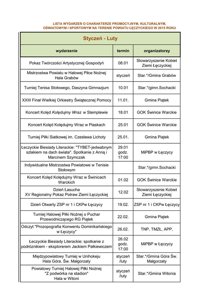 LISTA WYDARZEŃ O CHARAKTERZE PROMOCYJNYM, KULTURALNYM, OŚWIATOWYM I SPORTOWYM NA TERENIE POWIATU ŁĘCZYCKIEGO W 2015 ROKU Styczeń - Luty wydarzenie termin organizatorzy Pokaz Twórczości Artystycznej Gospodyń 08.01 Stowarzyszenie Kobiet Ziemi Łęczyckiej Mistrzostwa Powiatu w Halowej Piłce Nożnej Hala Grabów styczeń Star.*/Gmina Grabów Turniej Tenisa Stołowego, Daszyna Gimnazjum 10.01 Star.*/gimn.Sochacki XXIII Finał Wielkiej Orkiestry Świątecznej Pomocy 11.01. Gmina Piątek Koncert Kolęd Kolędujmy Wraz w Stemplewie 18.01 GOK Świnice Warckie Koncert Kolęd Kolędujmy Wraz w Piaskach 25.01 GOK Świnice Warckie Turniej Piłki Siatkowej im. Czesława Lichoty 25.01. Gmina Piątek Łeczyckie Biesiady Literackie: "TYBET-jedwabnym szlakiem na dach świata". Spotkanie z Anną i Marcinem Szymczak 29.01 godz. 17:00 MiPBP w Łęczycy Indywidualne Mistrzostwa Powiatowe w Tenisie Stołowym Star.*/gimn.Sochacki Koncert Kolęd Kolędujmy Wraz w Świnicach Warckich 01.02 GOK Świnice Warckie Dzień Łasucha XV Regionalny Pokaz Potraw Ziemi Łęczyckiej 12.02 Stowarzyszenie Kobiet Ziemi Łęczyckiej Dzień Otwarty ZSP nr 1 i CKPw Łęczycy 19.02. ZSP nr 1 i CKPw Łęczycy Turniej Halowej Piłki Nożnej o Puchar Przewodniczącego RG Piątek 22.02. Gmina Piątek Odczyt "Prozopografia Konwentu Dominikańskiego w Łęczycy" 26.02. TNP, TMZŁ, APP, Łeczyckie Biesiady Literackie: spotkanie z podróznikiem - eksplorerem Jackiem Pałkiewiczem 26.02 godz. 17:00 MiPBP w Łęczycy Międzypowiatowy Turniej w Unihokeju Hala Góra. Św. Małgorzaty styczeń /luty Star.*/Gmina Góra Św. Małgorzaty Powiatowy Turniej Halowej Piłki Nożnej "Z podwórka na stadion" Hala w Witoni styczeń /luty Star.*/Gmina Witonia Turniej Piłki Siatkowej o Puchar Starosty LZS+Sam Hala Grabów luty /październ ik Star.*/Gmina Grabów Powiatowy Turniej Tańca Towarzyskiego Hala w Topoli Królewskiej luty /marzec Star.*/Gmina Łęczyca Mistrzostwa Powiatowe w Tenisie Stołowym Mazew, Szkoła Podstawowa luty /marzec Star.*/SP*/Lipczyński wydarzenie termin organizatorzy II Rajd "Kobiet" Teren Gminy Uniejów 07.03 PTTK Oddział "Ziemi Łęczyckiej" Spotkanie twórców ludowych w Goślubiu 08.03. Gmina Piątek Marzec Konkurs plastyczny na temat “Ochrony Przeciwpożarowej”. ZOSPRP Powiatowe Eliminacje Ogólnopolskiego Konkursu Recytatorskiego Dom Kultury w Łęczycy Spotkanie Integracyjne "Dzień Kobiet dla Zdrowia" szkolenie z zakresu profilaktyki zdrowotnej kobiet "Cholesterol to twój wróg" 11.03 Stowarzyszenie Kobiet Ziemi Łęczyckiej Odczyt dr Tomasza Piekarskiego: Dzieje, Zadania, Funkcje Archiwum Państwowego w Płocku. 12.03 Archiwum Państwowe w Płocku oddz. Łęczyca, TNP oddz. Łęczyca, TMZŁ VII Łęczyckie Mistrzostwa Ortogafii 19.03 Dom Kultury Łeczyckie Spotkania Literackie: Spotkanie z podróżnikami Alicją Rapasiewicz i Andrzejem Brudnikiem: Chiny 19.03 godz. 17:00 MiPBP w Łęczycy Otwarcie sezonu w Łęczyckiej Zagrodzie Chłopskiej 21.03 MAiE w Łodzi XIV Rajd „Powitanie wiosny na Ziemi Łęczyckiej” Gmina Grabów 21.03 PTTK Oddział "Ziemi Łęczyckiej" Warsztaty rękodzielnicze "Jajka i inne ozdoby wielkanocne" 26.03 godz. 13:00 MiPBP w Łęczycy Dzień Trzeźwości biuro otwarte od godz. 10:00-20:00 30.03 Stowarzyszenie "Przebudzenie" Pokaz stroików i innych dekoracji Wielkanocnych 31.03 Stowarzyszenie Kobiet Ziemi Łęczyckiej wydarzenie termin organizatorzy XXXVII Powiatowy Konkurs Recytatorski „Pięknie być człowiekiem” dla uczniów klas gimnazjum z Powiatu Łęczyckiego, Czytelnia MiPBP w Łęczycy 09.04 godz. 09:00 MiPBP w Łęczycy Wycieczka 8 dni: Objazd - Egipt 23.04-30.04 Stowarzyszenie Kobiet Ziemi Łęczyckiej Łęczyckie Biesiady Literackie: Spotkanie z podróżnikami Katarzyną i Andrzejem Mazurkiewiczami: Indie 16.04 godz. 17:00 MiPBP w Łęczycy Wycieczka krajoznawcza Okolice Kalisza, Wrocławia 18-19.04 PTTK Oddział "Ziemi Łęczyckiej" Kwiecień Odczyt „Władysław Garbacz, ostatni książę łęczycki (zm.1352 r.)” – prelegent: prof. dr hab. Jan Szymczak Miejsce odczytu: APP OŁ, ul. Belwederska 38. XXXVII Powiatowy Konkurs Recytatorski „Pięknie być człowiekiem” dla uczniów klas I-VI szkół podstawowych z Powiatu Łęczyckiego, Czytelnia MiPBP w Łęczycy Spotkanie autorskie z Wojciechem Widłakiem autorem książek dla dzieci TMZŁ, Towarzystwo Naukowe Płockie Oddział 21.04 w Łęczycy i Archiwum godz. 16:30 Państwowe w Płocku Oddział w Łęczycy 23.04 godz. 09:00 MiPBP w Łęczycy 24.04 Oddział dla dzieci MiPBP godz. 09:00 w Łęczycy Św. Jan Paweł II w naszym życiu GOK Świnice Warckie Turniej na rozpoczęcie sezonu sportowego na Orliku GOK Świnice Warckie Mistrzostwa Powiatu w Halowej Piłce Nożnej Grabów Hala Star.*/Gmina Grabów Maj wydarzenie termin organizatorzy Dzień otwarty MMKT, możliwość gry z Burmistrzem Łęczycy 01.05 MMKT Święto Konstytucji 3 Maja 03.05 godz. 11:30 UM Łęczyca Powiatowy Międzyszkolny Przegląd Piosenki ŻACZEK Dom Kultury w Łęczycy Łęczyckie Biesiady Literackie: spotkanie godz. 17:00 MiPBP w Łęczycy Piknik w Piaskach maj/ czerwiec GOK Świnice Warckie Wiosenny Turniej Seniorów 50+ GOK Świnice Warckie Turniej Piłki Nożnej GOK Świnice Warckie Rodzinny bieg po zdrowie GOK Świnice Warckie Gminne obchody 224 rocznicy Konstytucji 3 Maja, Dnia Strażaka GOK Świnice Warckie Msza św. w intencji Synów Ziemi Łęczyckiej. Kościół parafialny pw. św. Andrzeja Apostoła w Łęczycy 04.05 godz. 18,00 TMZŁ Święto Strażaka 10.05. Gmina Piątek Plener rzeźbiarski 06-10.05. Gmina Piątek VI Przegląd Ruchu Artystycznego Seniora "Nutki Złotej Jesieni" Dom Kultury w Ł-cy XXXV Zlot do Środka Polski 09.05. PTTK* "Noc ze sportem w Bibliotece" 15.05 Oddział dla Dzieci MiPBP w Łęczycy Majówka na Sportowo, ORLIK w Łęczycy 19.05 godz. 15:00 Star.* Spotkanie autorskie z Józefem Borówką "Przemiany społeczno-gospodarcze na obszarze historycznej Ziemi Łęczyckiej w okresieklasycznego stal