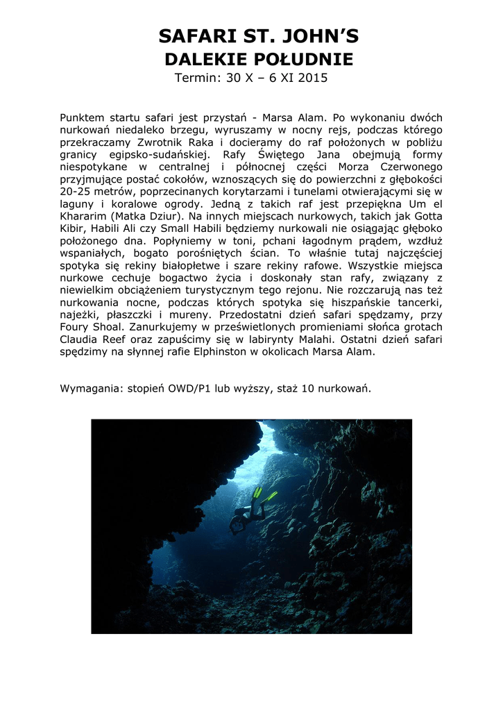 SAFARI ST. JOHN’S DALEKIE POŁUDNIE Termin: 30 X – 6 XI 2015 Punktem startu safari jest przystań - Marsa Alam. Po wykonaniu dwóch nurkowań niedaleko brzegu, wyruszamy w nocny rejs, podczas którego przekraczamy Zwrotnik Raka i docieramy do raf położonych w pobliżu granicy egipsko-sudańskiej. Rafy Świętego Jana obejmują formy niespotykane w centralnej i północnej części Morza Czerwonego przyjmujące postać cokołów, wznoszących się do powierzchni z głębokości 20-25 metrów, poprzecinanych korytarzami i tunelami otwierającymi się w laguny i koralowe ogrody. Jedną z takich raf jest przepiękna Um el Khararim (Matka Dziur). Na innych miejscach nurkowych, takich jak Gotta Kibir, Habili Ali czy Small Habili będziemy nurkowali nie osiągając głęboko położonego dna. Popłyniemy w toni, pchani łagodnym prądem, wzdłuż wspaniałych, bogato porośniętych ścian. To właśnie tutaj najczęściej spotyka się rekiny białopłetwe i szare rekiny rafowe. Wszystkie miejsca nurkowe cechuje bogactwo życia i doskonały stan rafy, związany z niewielkim obciążeniem turystycznym tego rejonu. Nie rozczarują nas też nurkowania nocne, podczas których spotyka się hiszpańskie tancerki, najeżki, płaszczki i mureny. Przedostatni dzień safari spędzamy, przy Foury Shoal. Zanurkujemy w prześwietlonych promieniami słońca grotach Claudia Reef oraz zapuścimy się w labirynty Malahi. Ostatni dzień safari spędzimy na słynnej rafie Elphinston w okolicach Marsa Alam. Wymagania: stopień OWD/P1 lub wyższy, staż 10 nurkowań. Ramowy plan safari: Dzień 1- Przylot z Polski. Transfer na łódź. Dzień 2 - wypłynięcie z portu, check dive Shab Marsa Alam, Abu Galawa, rejs na St. Johns- 2 nurkowania Dzień 3 - Habili Ali, Um el Eroug, Dangeraous reef - 3/4 nurkowań Dzień 4 - Habiley Ali, Big Gotta, Erg Abu Baslla, - 3/4 nurkowania Dzień 5 - Small Gotta, Um el Khararim, Sernaka island - 3/4 nurkowania Dzień 6 - Foury Shoal - Claudia, Malahai, Shaab Sharm - 3/4 nurkowania Dzień 7 - Elphinstone Reef - 2 nurkowania Dzień 8 - transfer na lotnisko, wylot do Polski Powyższy plan ma charakter orientacyjny. Realna trasa safari jest zawsze uzależniona od warunków pogodowych i kwalifikacji uczestników. Cena safari: 780 EUR + 1550 PLN Cena safari obejmuje: transfer na trasie: lotnisko - łódź - lotnisko, 7 noclegów, z czego pierwszy lub ostatni może mieć miejsce w hotelu, trzy posiłki dziennie oraz owoce i przekąski (w pierwszym dniu posiłki zaczynają się kolacją, a w ostatnim dniu kończą się śniadaniem), polski przewodnik nurkowy, butle 11l (oraz ich napełnianie), balast (bez taśm lub kieszeni balastowych), napoje: kawa, herbata, napoje gazowane, 2-3 nurkowania pierwszego dnia,3-4 nurkowania w dniach 2-5, 2 nurkowania ostatniego dnia, ubezpieczenie KL, NW uwzględniające wypadki nurkowe, przelot Polska-HRG/RMF – Polska JACHT MOTOROWY "Star Jet" Opis łodzi • • • • • • • standard 5 * przestronny stalowy dla 26 nurków 2-osobowe kajuty z AC długość 35 m 4 pokłady Mocna, metalowa konstrukcja i wysoka dzielność morska gwarantują bezpieczeństwo rejsu z dala od brzegu. Estetyczne wykończenie wnętrz, przestronne kajuty, tekowy pokład i ergonomiczne rozplanowanie pokładu nurkowego zapewniają komfortowy pobyt oraz dużą swobodę w przygotowaniu do nurkowania na safari. Łódź posiada licencję na wszystkie trasy safari realizowane w Egipskiej części Morza Czerwonego. Infrastruktura socjalna Łódź safari ”Star Jet” oferuje 13 klimatyzowanych, dwuosobowych kabin, każda z własną łazienką oraz dwoma rozdzielonymi łóżkami. Do dyspozycji gości są pokład słoneczny, jadalnia, klimatyzowany salon wyposażony w sprzęt audio i DVD. Pościel i ręczniki w cenie. Załoga Załoga „Star Jet” składa się z 10 osób. W jej skład wchodzą: kapitan, zastępca, kucharz, asystent kucharza, steward, mechanik, zastępca mechanika, 3 marynarzy. W rejsie safari zawsze bierze udział polski instruktor nurkowania oraz egipski przewodnik z wieloletnim doświadczeniem, do którego mamy pełne zaufanie! Specyfikacja techniczna łodzi Klasyfikacja łodzi: 5* Ilość osób: 26 + 2 przewodników Długość: 35 m, Szerokość 8,5 m Silniki: 2x 1025 HP Catepillar Generatory: 2 x 60kW Nawigacja: GPS, radar, echosonda, kompas Komunikacja: Marine VHF, tel. satelitarny Woda: zbiornik 25 ton + odsalarka Tlen: 2 x butla 40l. Wyposażenie ratunkowe kamizelki tratwy ratunkowe Ponton: 2x 25 HP Yamaha Wyposażenie nurkowe kompresor: 2 x Coltrisub 190l/min butle: aluminiowe 12 l z zaworami DIN twinsety na zamówienie system mieszania NITROKSU sprzęt nurkowy na zamówienie Cena safari nie obejmuje: wizy egipskiej - 25 USD, napiwku dla załogi - 30 EUR, dodatkowych posiłków poza łodzią, pozostałego sprzętu nurkowego, opłaty Reef Protection Fee - 15 EUR. Serdecznie zapraszamy!!! Rezerwacja tel. 691-43-77-66