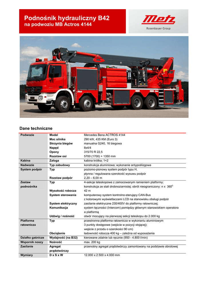 Podnośnik hydrauliczny B42 na podwoziu MB Actros 4144 Dane techniczne Podwozie Kabina Nadwozie System podpór Zestaw podnośnika Model Moc silnika Skrzynia biegów Napęd Opony Rozstaw osi Załoga Typ zabudowy Typ Rozstaw podpór Typ Wysokość robocza System sterowania System elektryczny Komunikacja Platforma ratownicza Działko gaśnicze Wspornik noszy Zasilanie Wymiary Udźwig / nośność Typ Obciążenie Wydajność (na B32) Nośność Agregat prądotwórczy DxSxW Mercedes Bena ACTROS 4144 290 kW, 435 KM (Euro 3) manualna G240, 16 biegowa 8x4/4 315/70 R 22,5 5700 (1700) + 1350 mm kabina krótka; 1+2 konstrukcja aluminiowa; wykonanie antypoślizgowe poziomo-pionowy system podpór typu H, płynna / regulowana szerokość wysuwu podpór 2,20 – 6,00 m 4-sekcje teleskopowe z zamocowanym ramieniem platformy; konstrukcja ze stali drobnoziarnistej; obrót nieograniczony: n x 3600 42 m komputerowy system kontrolno-sterujący CAN-Bus z kolorowymi wyświetlaczami LCD na stanowisku obsługi podpór zasilanie elektryczne 230/400V do platformy ratowniczej; system łączności (Intercom) pomiędzy głównym stanowiskiem operatora a platformą otwór mocujący na pierwszej sekcji teleskopu do 2.000 kg przestronna platforma ratownicza w wykonaniu aluminiowym 3 punkty dostępowe (wejście w pozycji stojącej); wejście z przodu o szerokości 90 cm) ładowność robocza 400 kg – zależna od wyposażenia kierowane zdalnie lub ręcznie (950 - 4.800 l/min) max. 200 kg przenośny agregat prądotwórczy zamontowany na podstawie obrotowej 12.000 x 2.500 x 4.000 mm Podnośnik hydrauliczny B42 na podwoziu MB Actros 4144 Dodatkowe wyposażenie pojazdu Główny panel sterowania umieszczony po lewej stronie podnośnika Reflektor pogorzeliskowy 230V / 1000W Punkt zaczepowy na platformie dla linkowego urządzenia ewakuacyjnego (do 150 kg) Rękaw ratowniczy Przenośny agregat prądotwórczy z silnikiem spalinowym Platforma wyposażona w linię szybkiego natarcia na zwijadle (20 m, wąż 1”) Anemometr (miernik siły wiatru) Oświetlenie pola pracy podnośnika Autopompa normalnociśnieniowa Rosenbauer model R600 (6.000 l/min) z pompką zasysającą Dozownik środka pianotwórczego Rosenbauer RVMA 500 Zbiornik wody: 4.000 l Zbiornik środka pianotwórczego: 500 l 2 linie szybkiego natarcia (prawa i lewa strona) Opcje Drabina ratownicza wzdłuż wysięgnika System pneumatyczny powietrza oddechowego na platformie Awaryjna pompa hydrauliczna 400 V System kolorowych kamer wideo w koszu Dodatkowe opcje na życzenie Klienta Kontakt METZ Aerials GmbH & Co. KG Carl-Metz-Strasse 9 76185 Karlsruhe, Niemcy Tel.: + 49 (0)721 5965-0 Fax: + 49 (0)721 5965-238 www.metz-aerials.com Tekst i ilustracje nie są wiążące. Zdjęcia i rysunki mogą ukazywać opcjonalne wyposażenie, dostępne wyłącznie za dodatkową opłatą. Rosenbauer rezerwuje sobie prawo do zmian w powyższej specyfikacji i wymiarów bez wcześniejszego powiadomienia. BIURO HANDLOWE: ul. Konarskiego 50 05-092 Łomianki tel./fax. (022) 751-68-95 [email protected] www.steo.com.pl