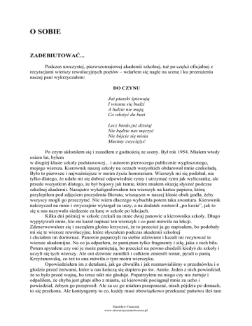 O SOBIE ZADEBIUTOWAĆ... Podczas uroczystej, pierwszomajowej akademii szkolnej, tuż po części oficjalnej z recytacjami wierszy rewolucyjnych poetów – wdarłem się nagle na scenę i ku przerażeniu naszej pani wykrzyczałem: DO CZYNU Już ptaszki śpiewają I wiosna się budzi A ludzie nie mają Co włożyć do buzi Lecz bieda już dzisiaj Nie będzie nas męczyć Nie bójcie się misia Musimy zwyciężyć Po czym ukłoniłem się i zszedłem z godnością ze sceny. Był rok 1954. Miałem wtedy osiem lat, byłem w drugiej klasie szkoły podstawowej... i autorem pierwszego publicznie wygłoszonego, mojego wiersza. Kierownik naszej szkoły na oczach wszystkich obdarował mnie czekoladą. Było to pierwsze i najważniejsze w moim życiu honorarium. Wierszyk mi się podobał, nie tylko dlatego, że udało mi się dobrać odpowiednie rymy i utrzymać rytm jak wyliczankę, ale przede wszystkim dlatego, że był bojowy jak tamte, które miałem okazję słyszeć podczas szkolnej akademii. Nazajutrz wykaligrafowałem ten wierszyk na kartce papieru, którą przylepiłem pod zdjęciem prezydenta Bieruta, wiszącym w naszej klasie obok godła, żeby wszyscy mogli go przeczytać. Nie wiem dlaczego wybuchła potem taka awantura. Kierownik nakrzyczał na mnie i zwyczajnie wytargał za uszy, a na dodatek zostawił ,,po kozie”, jak to się u nas nazywało siedzenie za karę w szkole po lekcjach. Kilka dni później w szkole czekali na mnie dwaj panowie u kierownika szkoły. Długo wypytywali mnie, kto mi kazał napisać ten wierszyk i co pani mówiła na lekcji. Zdenerwowałem się i zacząłem głośno krzyczeć, że to przecież ja go napisałem, bo podobały mi się te wiersze rewolucyjne, które słyszałem podczas akademii szkolnej i chciałem im dorównać. Panowie popatrzyli na siebie zdziwieni i kazali mi recytować te wiersze akademijne. Na co ja odparłem, że pamiętam tylko fragmenty i siłę, jaka z nich biła. Potem spytałem czy oni je może pamiętają, bo przecież na pewno chodzili kiedyś do szkoły i uczyli się tych wierszy. Ale oni dziwnie zamilkli i całkiem zmienili temat, pytali o panią Krzyżanowską, co też to ona mówiła o tym moim wierszyku. Opowiedziałem im z detalami, jak go chwaliła i jak rozmawialiśmy o przednówku i o głodzie przed żniwami, które u nas kończą się dopiero po św. Annie. Jeden z nich powiedział, że to było przed wojną, bo teraz nikt nie głoduje. Popatrzyłem na niego czy nie żartuje i odpaliłem, że chyba jest głupi albo z miasta, aż kierownik pociągnął mnie za ucho i powiedział, żebym go przeprosił. Ale za co go miałem przepraszać, niech pójdzie po domach, to się przekona. Ale kontyngenty to co, każdy musi obowiązkowo przekazać państwu ileś tam Stanisław Franczak www.stowarzyszenietworcze.pl kilo ziemniaków, zboża i świń. Nie bardzo wiedziałem gdzie to państwo jest, ale pewnie w mieście, bo tam ludzie nie orzą i nie sieją, a muszą jeść. Wychodziło na to, że my musimy na nich pracować i dlatego jest ten przednówek. Wyłożyłem im to wszystko jak głupim, ale oni tylko kręcili głowami i powiedzieli, że ze mnie nic dobrego nie wyrośnie. No masz, komu tu wierzyć, pani czy im? Na szczęście pani Krzyżanowska była starsza i mądrzejsza, a oni nawet wierszy rewolucyjnych nie umieli, widać, że źle się musieli uczyć w szkole, to jak im teraz wierzyć? Zresztą kierownik też nic nie mówił, to utwierdziło mnie w przekonaniu, że to jakieś gamonie. Już miałem zapytać skąd oni są, ale szczęściem zobaczyłem pistolet za pazuchą u jednego i wtedy dopiero domyśliłem się, że to przecież tajniacy. A tacy to nic dobrego, chodzą węszą i nic innego nie robią. Kto wie, czy w ogóle chodzili do jakiejś szkoły. Kierownik kazał mi już iść, a ten wyższy powiedział, żebym więcej nie pisał podejrzanych wierszyków, nie wieszał ich w klasie, ani nie wypisywał kredą na murze czy moście, bo pójdę za to do więzienia. Podejrzanych, tak powiedział! Chciałem go zapytać, co to są te podejrzane wierszyki, ale kierownik popatrzył na mnie groźnie i ofuknął mnie, żebym już poszedł nareszcie i że on ze mną jeszcze pogada, a teraz obniża mi stopień z zachowania. No wiecie, coś podobnego? Byłem tak zaskoczony, że stałem jak wryty i kierownik musiał mnie pchnąć do drzwi, żebym wyszedł. Ale nie na tym koniec. Ci smutni tajniacy, bo oni nigdy się nie uśmiechają, kazali przyjść do kierownika naszej pani Krzyżanowskiej. Zabrało jej to sporo czasu, bo schody do kancelarii kierownika są wysokie, a pani kuleje i nie może tak szybko wyjść jak każdy inny, choć zawsze jej ktoś z nas pomaga. Długo jej nie było i mieliśmy wolne, opowiedziałem wszystkim, o co mnie pytali, czym mi grozili. Klasa podzieliła się, jedni byli za tym, żebym dalej pisał wierszyki, inni zaś żeby dać sobie spokój, bo nas wszystkich zaaresztują. W dodatku wróciła zapłakana pani Krzyżanowska i nic nie chciała mówić, tak że już cała klasa była przeciw mnie, bo to wszystko przeze mnie. Pod koniec lekcji pani już nie smarkała w chustkę i nie płakała, ale kazała mi podejść i na oczach klasy przytuliła mnie i powiedziała, żebym był sobą i pisał dalej wierszyki, a może i książki. Nikt w klasie już nie wiedział, czy to dobrze, czy źle, ale ja wiedziałem jedno, że będę pisać i wiersze, i dziennik, że będę sobą, tak jak powiedziała to pani, będę pisać uczciwie o wszystkim, co jest ważne w życiu. I że kiedyś napiszę książkę o Bieńkówce, o szkole i o naszej klasie. Alw na długo wywietrzała mi z głowy wszelka poezja, choć jeszcze raz czy dwa zbierałem jej gorzkie żniwo. A to wtedy, gdy nasmarowałem na murze szkoły jakiś dwuwiersz, to znów wtedy, gdy na poręczy drewnianego mostu zrymowały mi się dwa słowa: Dyrek–syrek. Rzecz w tym, że to nasza wychowawczyni tak się nazywała. za każdym razem odsiadywałem swoje ,,po