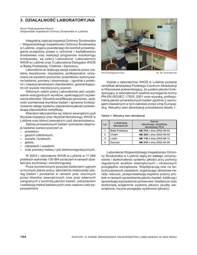 3. DZIAŁALNOŚĆ LABORATORYJNA Anna Pastuszewska-Paruch (Wojewódzki Inspektorat Ochrony Środowiska w Lublinie) Integralną częścią Inspekcji Ochrony Środowiska – Wojewódzkiego Inspektoratu Ochrony Środowiska w Lublinie, organu powołanego do kontroli przestrzegania przepisów prawa o ochronie i kształtowaniu środowiska oraz realizacji programów monitoringu środowiska, są cztery Laboratoria: Laboratorium WIOŚ w Lublinie oraz 3 Laboratoria Delegatur WIOŚ w Białej Podlaskiej, Chełmie i Zamościu. Laboratoria te realizują swoje zadania przez rzetelne, bezstronne, niezależne, profesjonalne, utrzymane na wysokim poziomie i prawidłowo wykonywane badania, pomiary i obserwacje – zgodnie z polskimi i międzynarodowymi standardami, gwarantującymi ich wysoki merytoryczny poziom. Głównym celem pracy Laboratoriów jest uzyskiwanie wiarygodnych wyników, spełniających oczekiwania klientów. Wysokie kwalifikacje personelu, spójność pomiarową wyników badań i sprawne funkcjonowanie całego systemu zapewnienia jakości potwierdzają odpowiednie certyfikaty. Klientami laboratoriów są: klienci wewnętrzni czyli Wydział Inspekcji oraz Wydział Monitoringu WIOŚ w Lublinie oraz klienci zewnętrzni czyli zleceniodawcy. Zakres prowadzonych badań i pomiarów obejmuje badanie zanieczyszczeń w: – powietrzu – gazach odlotowych, – wodzie i ściekach, – glebie, – odpadach i osadach, – oraz pomiary hałasu i pól elektromagnetycznych. W 2003 r. laboratoria WIOŚ w Lublinie w 11 586 próbkach wykonały 130 064 oznaczeń w ramach działalności kontrolnej i monitoringowej. Poza wymienionymi powyżej badaniami ujętymi w rocznym planie pracy, laboratoria realizowały szereg badań i pomiarów w ramach prac zleconych przez klientów zewnętrznych oraz prac własnych związanych z kontrolą jakości badań, wdrażaniem i walidacją metod badawczych oraz nadzoru nad wyposażeniem. 164 Chromatograf jonowy fot. M. Domalewski Każde z laboratoriów WIOŚ w Lublinie posiada certyfikat akredytacji Polskiego Centrum Akredytacji w Warszawie potwierdzający, że system jakości funkcjonujący w laboratoriach spełnia wymagania normy PN-EN ISO/IEC 17025: 2001 oraz wysoką, profesjonalną jakość prowadzonych badań zgodnie z wymogami stawianymi w tym zakresie przez Unię Europejską. Aktualny stan akredytacji przedstawia tabela 1. Tabela 1. Aktualny stan akredytacji ! " # #$ ! ! Laboratoria Wojewódzkiego Inspektoratu Ochrony Środowiska w Lublinie dążą do stałego utrzymywania i doskonalenia systemu jakości przy pomocy regularnych auditów wewnętrznych i okresowych przeglądów zarządzania. Współpracują one na dotychczasowych zasadach, organizując okresowe narady robocze, przeprowadzają wspólne pobory próbek w ramach sprawdzenia jakości badań, kalibrują i sprawdzają wyposażenie pomiarowe i badawcze oraz doskonalą wzajemnie systemy jakości (audity wewnętrzne, roczne przeglądy systemów jakości). RAPORT O STANIE ŚRODOWISKA WOJEWÓDZTWA LUBELSKIEGO W 2003 ROKU