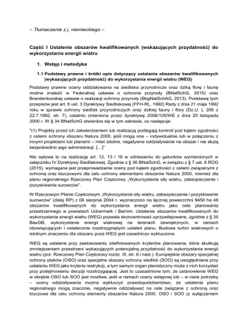 – Tłumaczenie z j. niemieckiego – Część I Ustalenie obszarów kwalifikowanych (wskazujących przydatność) do wykorzystania energii wiatru 1. Wstęp i metodyka 1.1 Podstawy prawne i krótki opis dotyczący ustalania obszarów kwalifikowanych (wykazujących przydatność) do wykorzystania energii wiatru (WEG) Podstawy prawne oceny oddziaływania na siedliska przyrodnicze oraz dziką florę i faunę można znaleźć w Federalnej ustawie o ochronie przyrody (BNatSchG, 2015) oraz Brandenburskiej ustawie o realizacji ochrony przyrody (BbgNatSchAG, 2013). Podstawą tych przepisów jest art. 6 ust. 3 Dyrektywy Siedliskowej (FFH-RL, 1992) Rady z dnia 21 maja 1992 roku w sprawie ochrony siedlisk przyrodniczych oraz dzikiej fauny i flory (Dz.U. L 206 z 22.7.1992, str. 7), ostatnio zmieniona przez dyrektywę 2006/105/WE z dnia 20 listopada 2000 r. W § 34 BNatSchG stwierdza się w tym zakresie, co następuje: "(1) Projekty przed ich zatwierdzeniem lub realizacją podlegają kontroli pod kątem zgodności z celami ochrony obszaru Natura 2000, jeśli mogą one – indywidualnie lub w połączeniu z innymi projektami lub planami – mieć istotne, negatywne oddziaływanie na obszar i nie służą bezpośrednio jego administracji. […]“ Nie wpływa to na realizację art. 12, 13 i 16 w odniesieniu do gatunków wymienionych w załączniku IV Dyrektywy Siedliskowej. Zgodnie z § 36 BNatSchG, w związku z § 7 ust. 6 ROG (2015), wymagane jest przeprowadzenie oceny pod kątem zgodności z celami związanymi z ochroną oraz kluczowymi dla celu ochrony elementami obszarów Natura 2000, również dla planu regionalnego Rzeczowy Plan Częściowy „Wykorzystanie siły wiatru, zabezpieczenie i pozyskiwanie surowców”. W Rzeczowym Planie Częściowym „Wykorzystanie siły wiatru, zabezpieczenie i pozyskiwanie surowców” (dalej RP) z 06 sierpnia 2004 r. wyznaczono na łącznej powierzchni 9450 ha 48 obszarów kwalifikowanych do wykorzystania energii wiatru jako cele planowania przestrzennego w powiatach Uckermark i Barnim. Ustalenie obszarów kwalifikowanych do wykorzystania energii wiatru (WEG) pozwala skoncentrować uprzywilejowane, zgodnie z § 35 BauGB, wykorzystanie energii wiatrowej na terenach zewnętrznych, w ramach obowiązujących i ostatecznie rozstrzygniętych ustaleń planu. Budowa turbin wiatrowych o istotnym znaczeniu dla obszaru poza WEG jest zasadniczo wykluczona. WEG są ustalane przy zastosowaniu zdefiniowanych kryteriów planowania, które skutkują zmniejszeniem przestrzeni wykazujących potencjalną przydatność do wykorzystania energii wiatru (por. Rzeczowy Plan Częściowy rozdz. III, str. 8 i nast.). Europejskie obszary specjalnej ochrony ptaków (OSO) oraz specjalne obszary ochrony siedlisk (SOO) są uwzględniane przy ustalaniu WEG jako kryteria restrykcji, a tym samym organ planistyczny może z nich korzystać przy podejmowaniu decyzji rozstrzygającej. Jest to uzasadnione tym, że ustanowienie WEG w obrębie OSO lub SOO jest możliwe, jeśli w ramach oceny wstępnej lub – w razie potrzeby – oceny oddziaływania można wykluczyć prawdopodobieństwo, że ustalenia planu regionalnego mogą znacznie, negatywnie oddziaływać na cele związane z ochroną oraz kluczowe dla celu ochrony elementy obszarów Natura 2000. OSO i SOO (z wyłączeniem wznowienia WEG, już ustalonego w RP 2004, na którym znajdują się już turbiny wiatrowe) nie są wykorzystywane przez WEG, w związku z czym celem poniższego badania jest przede wszystkim ustalenie, czy ustalenia planu, leżące poza OSO/SOO, mogą znacznie, negatywnie oddziaływać na cele związane z ochroną oraz kluczowe dla celu ochrony elementy obszarów Natura 2000. 1.2 Metodyka oceny Metodyka oceny opisana poniżej została opracowana przez Regionalną Wspólnotę Planowania Uckermark-Barnim (RPG) dla szczebla planowania regionalnego. RPG była przy tym zadaniu wspierana przez Ministerstwo Rozwoju Wsi, Środowiska i Rolnictwa Brandenburgii (MLUL), a także przez Krajowy Urząd Środowiska, Zdrowia i Ochrony Konsumentów Brandenburgii (LUGV / RO4, dawniej: RO7) w ramach intensywnych konsultacji i poprzez zalecenia ekspertów. 1.2.1 Przegląd gatunków istotnych dla oceny Przestrzeganie kwestii ochrony przyrody przy wyznaczaniu obszarów kwalifikowanych do wykorzystania energii wiatru i wydawaniu zezwoleń dla turbin wiatrowych reguluje w kraju związkowym Brandenburgii Rozporządzenie Ministerstwa Środowiska, Zdrowia i Ochrony Konsumentów z dnia 01 stycznia 2011 r. o tej samej nazwie. Rozporządzenie jest wiążące dla organów ds. środowiska Brandenburgii i służy pogodzeniu „[…] wymagań ochrony określonych części przyrody i krajobrazu oraz ochrony gatunków dzikich zwierząt, ich siedlisk i biotopów, zgodnie z Federalną ustawą o ochronie przyrody i Ustawą o ochronie przyrody Brandenburgii [uwaga: od 21 stycznia 2013 r. Brandenburska ustawa o realizacji ochrony przyrody]“ (MUGV, Rozporządzenie Ministerstwa Środowiska, Zdrowia i Ochrony Konsumentów Brandenburgii "Przestrzeganie kwestii związanych z ochroną przyrody przy wyznaczaniu obszarów kwalifikowanych do wykorzystania energii wiatru i przy wydawaniu zezwoleń dla turbin wiatrowych”, 2011, str. 1) z celem polityki energetycznej polegającym na coraz większym wykorzystaniu odnawialnych źródeł energii. Załącznik nr 1 Rozporządzenia, ostatnio znowelizowanego dnia 15 października 2012 r., obejmuje faunistyczno-ekologiczne kryteria odstępu (TAK). Są to obszary i odległości chronione, ustalone na podstawie specyficznych zachowań gatunków i grup gatunków (szczególnie przy reprodukcji, odchowie młodych, żerowaniu i zakłóceniach), których przestrzeganie w ramach postępowania wydawania zezwoleń dla turbin wiatrowych, zgodnie z prawem ochrony przed immisjami oraz w ramach komunalnego planowania zabudowy, gwarantuje, że nie są zasadniczo naruszane, w związku z prawem ochrony gatunków, „[…] znamiona czynów zabronionych 